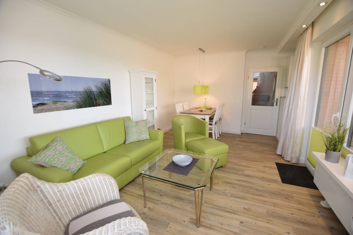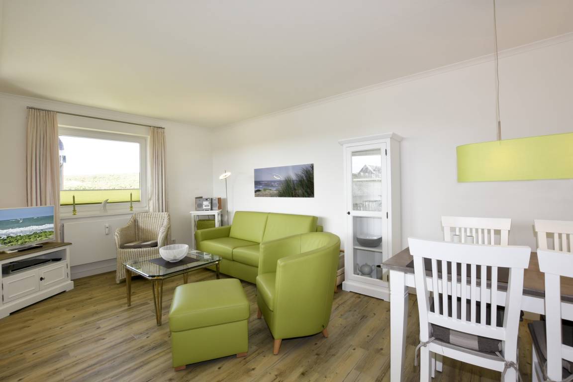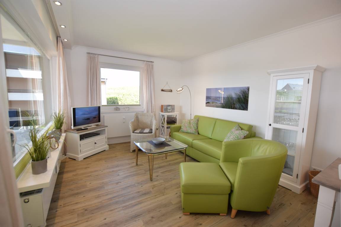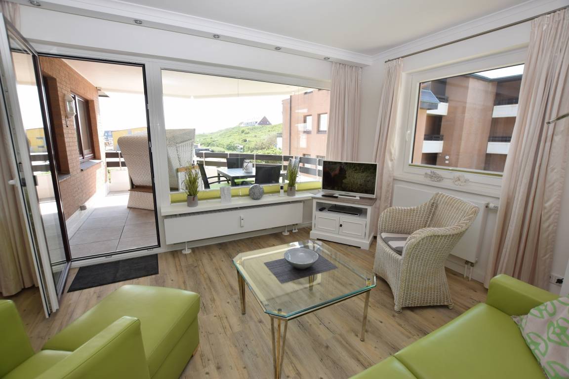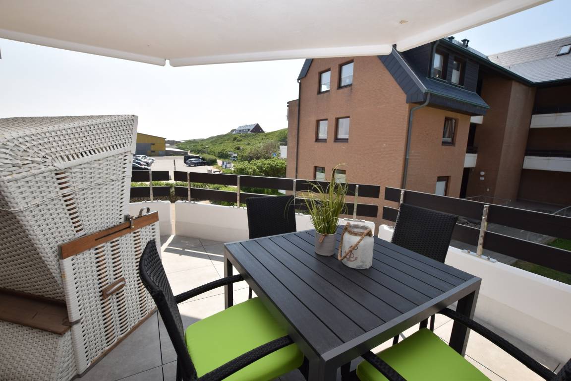Willkommen in dieser exklusiven 2-Zimmer-Nichtraucher-Ferienwohnung, ca. 52 m² groß und gelegen in der 1. Etage – ideal für bis zu 4 Personen. Die Wohnung besticht durch einen großzügigen Süd-West-Balkon, der mit stilvollen Balkonmöbeln, Auflagen und einem traumhaften Blick über die Dünen zum Entspannen einlädt.