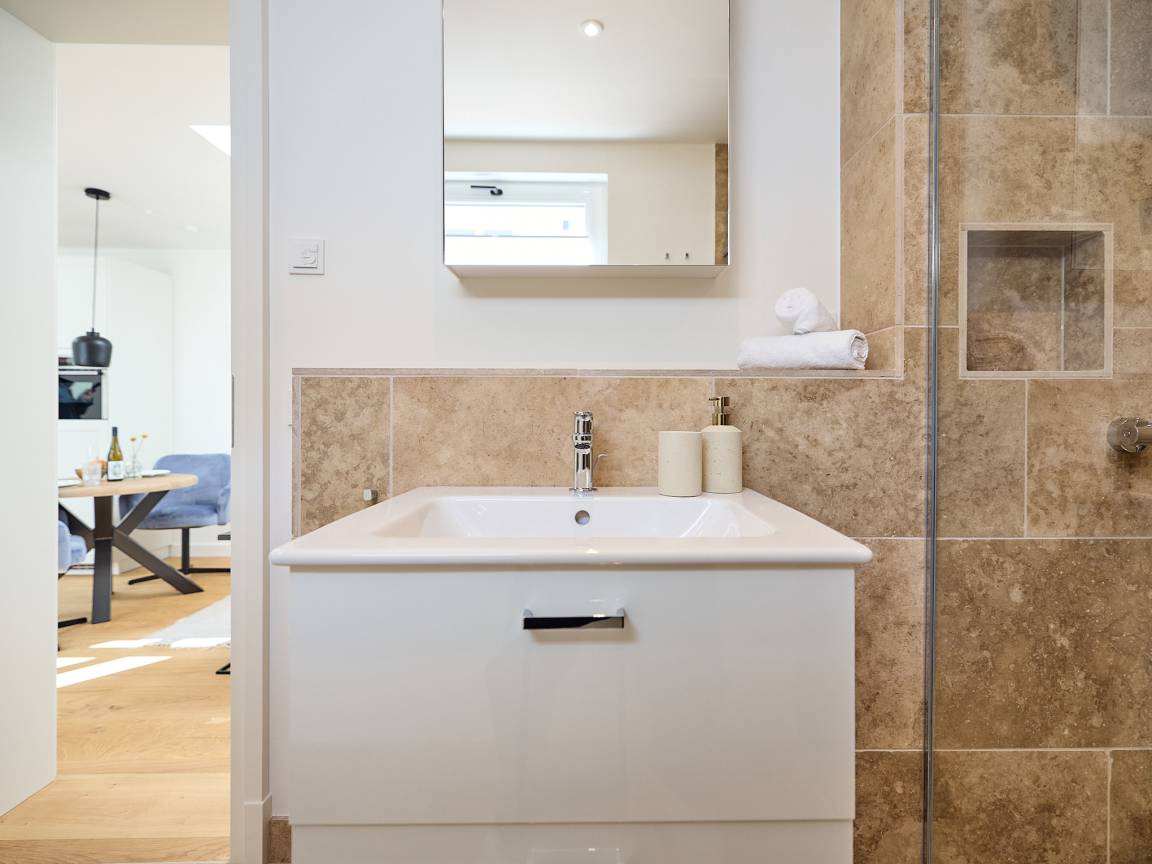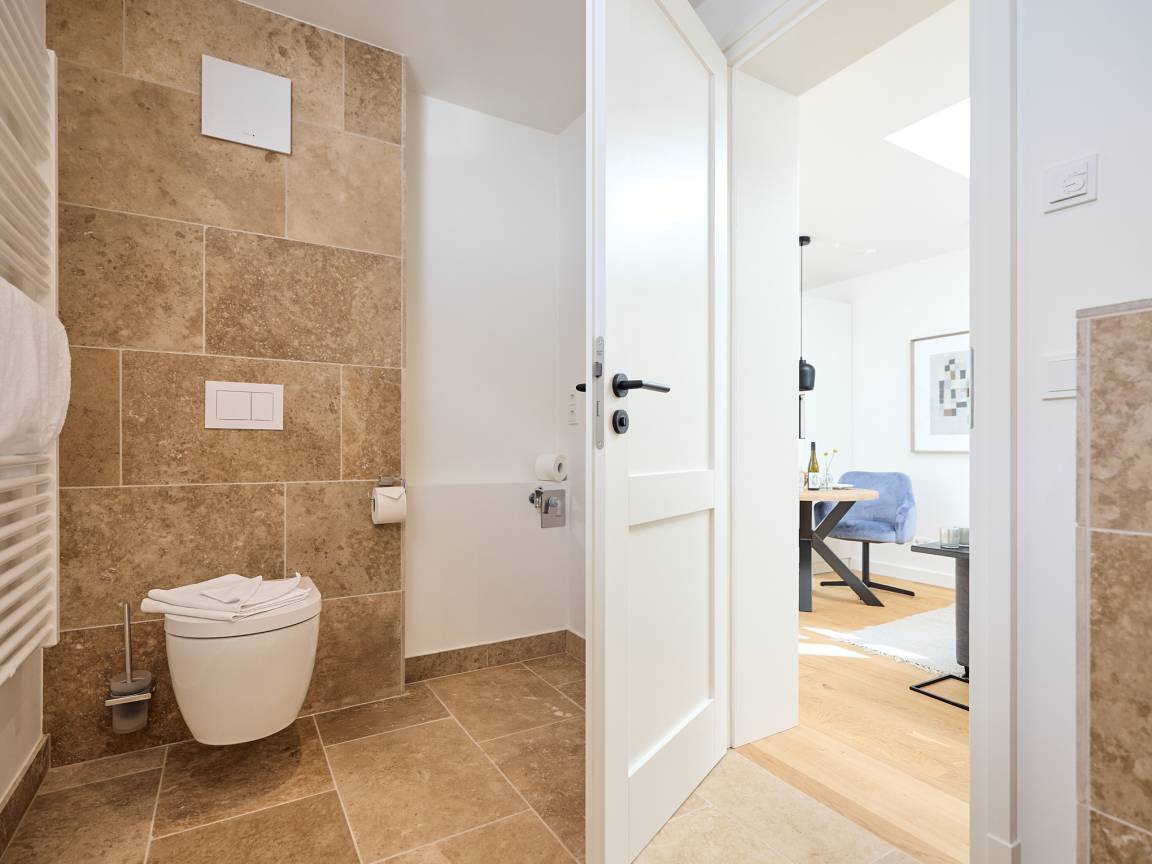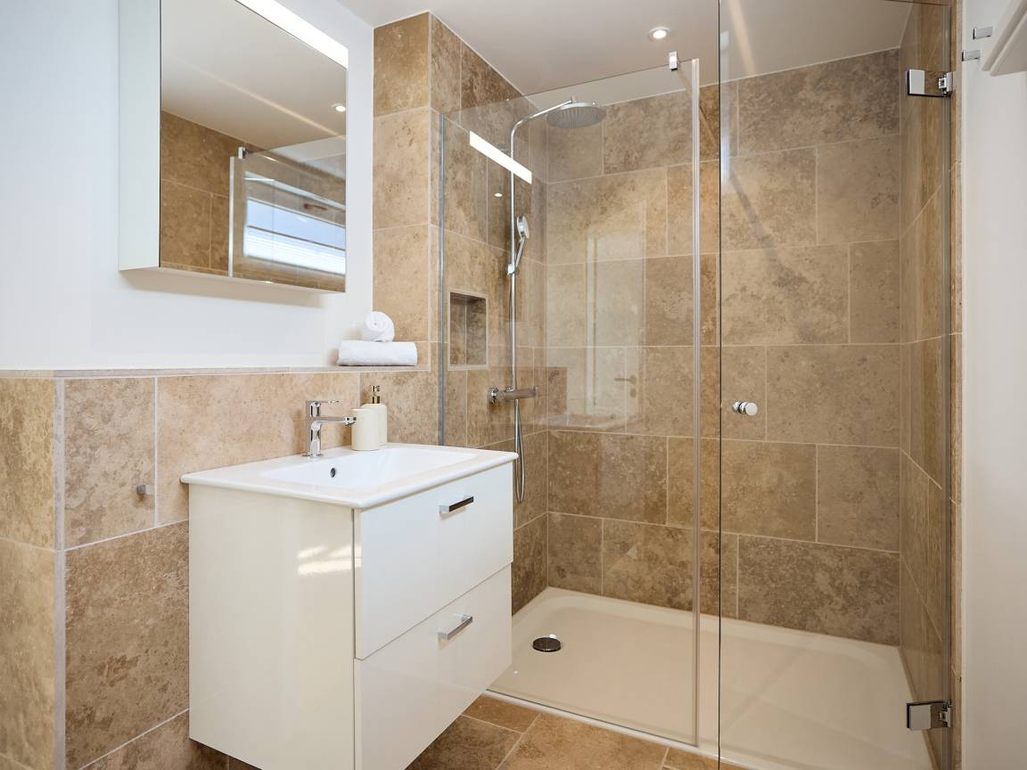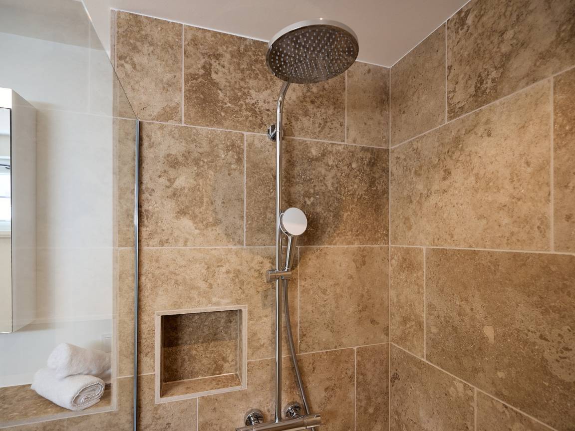 - Badezimmer: Großzügiges, modernes Bad mit hochwertigen Natursteinfliesen und einer großen Dusche - hier starten Sie erfrischt in den Tag.