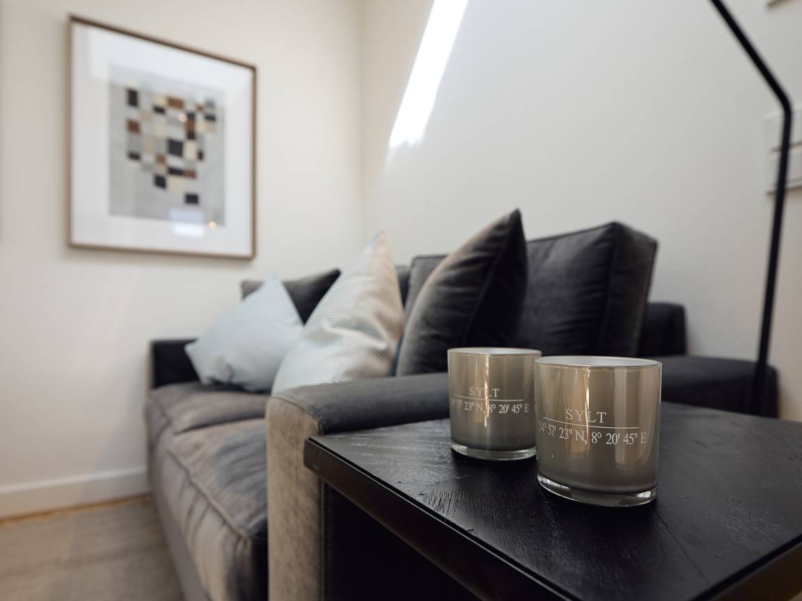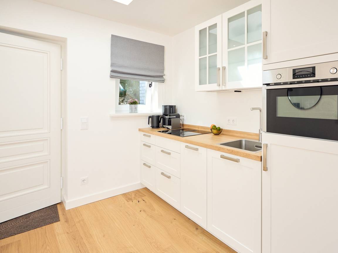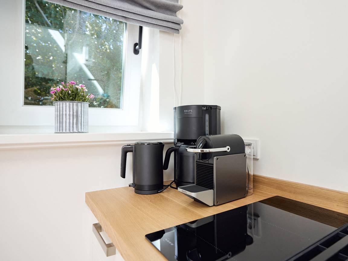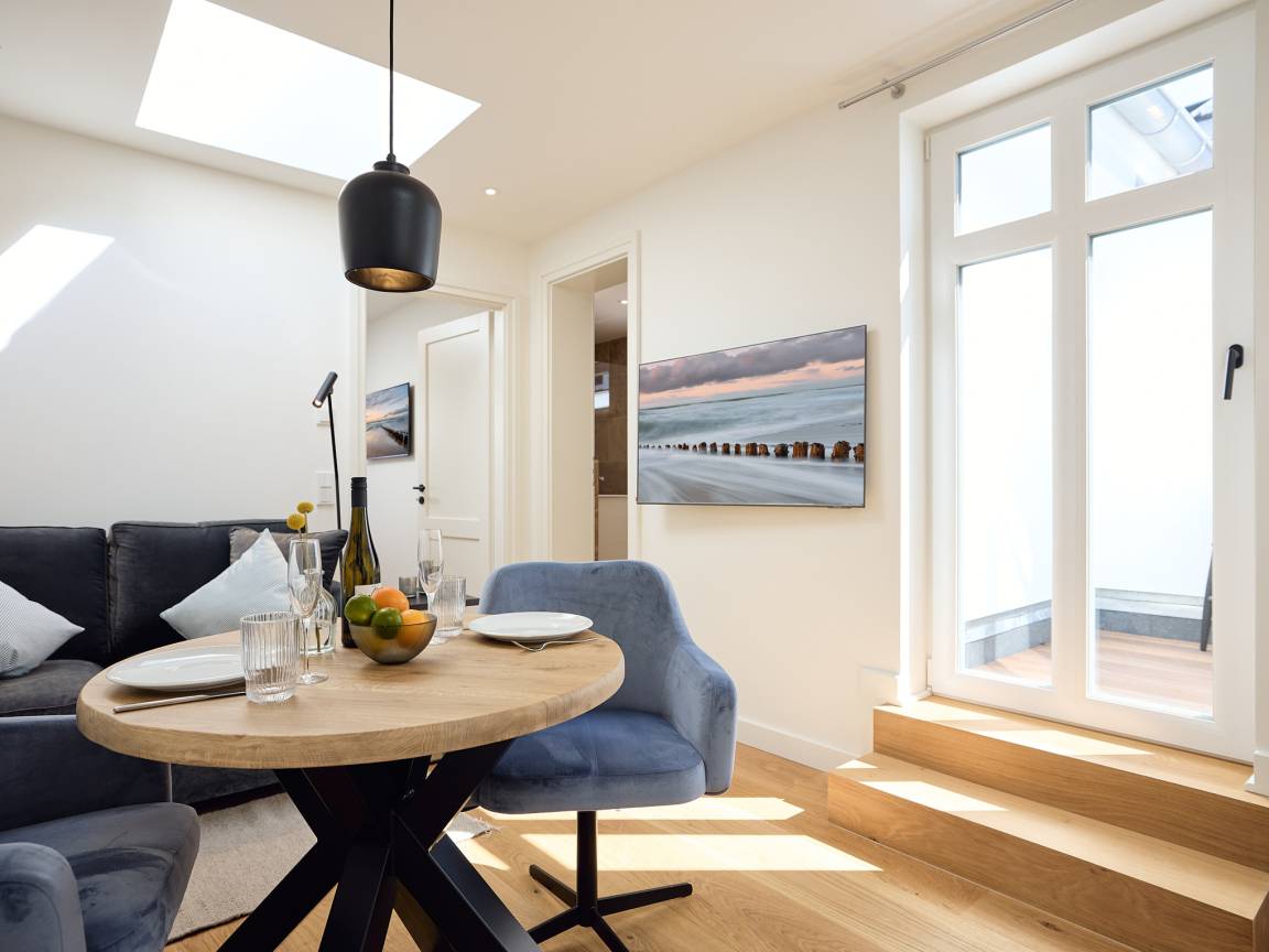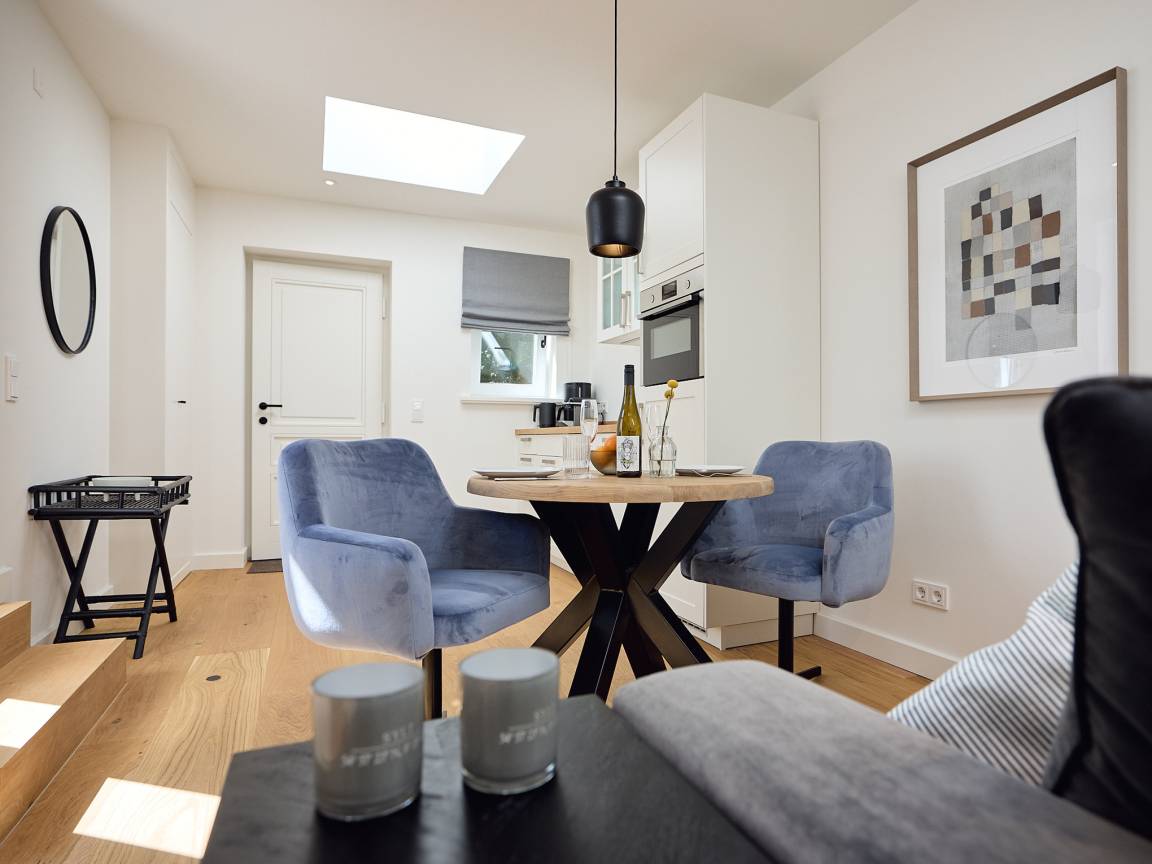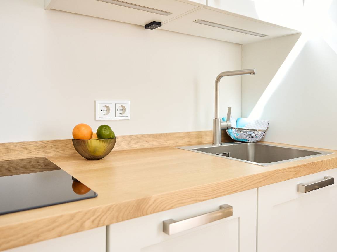 - Wohnbereich: Linkerhand erwartet Sie eine einladende Küchenzeile mit allem, was Sie zum Kochen brauchen, ein gemütlicher Essbereich sowie ein komfortables Sofa mit Smart-TV für entspannte Abende.