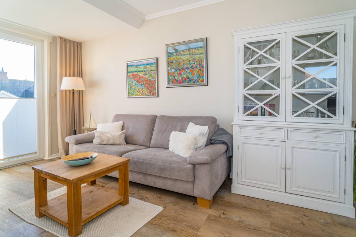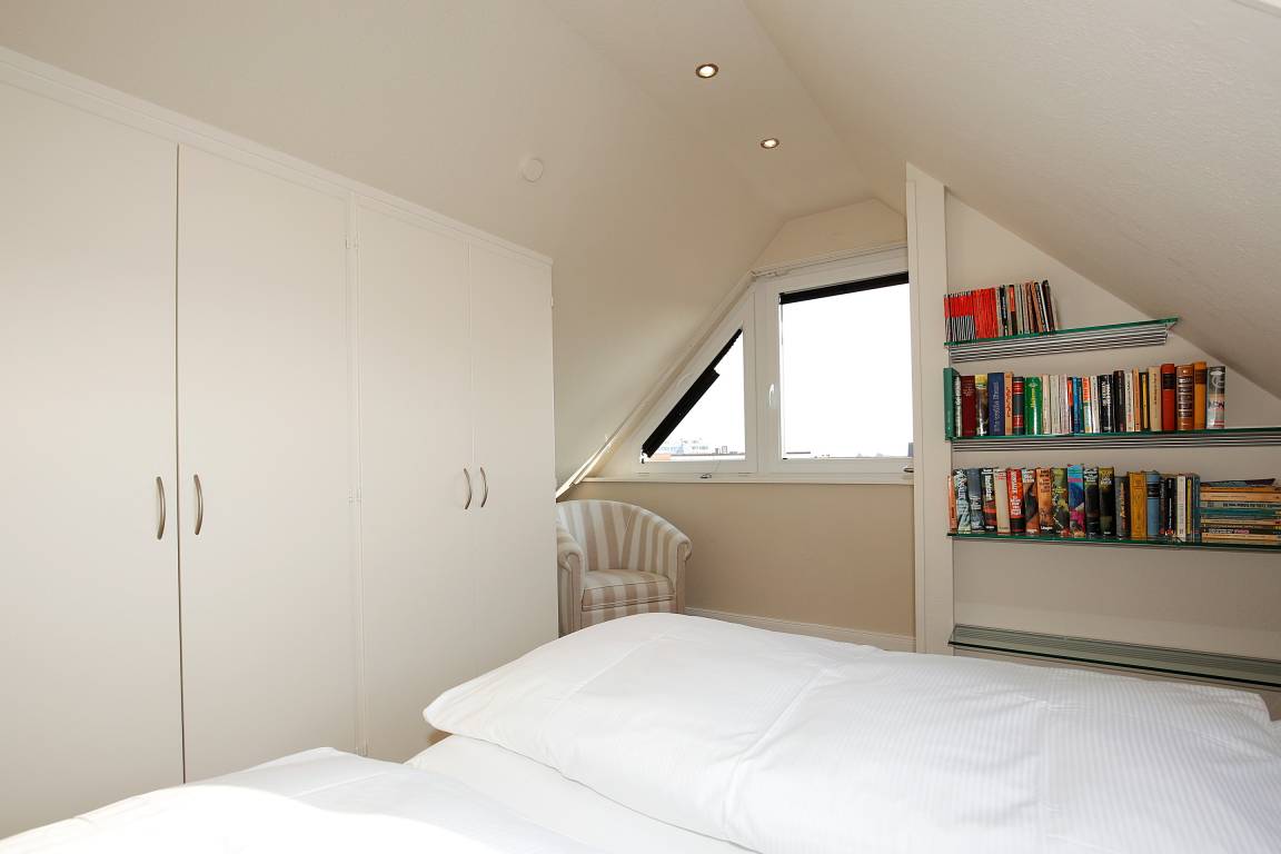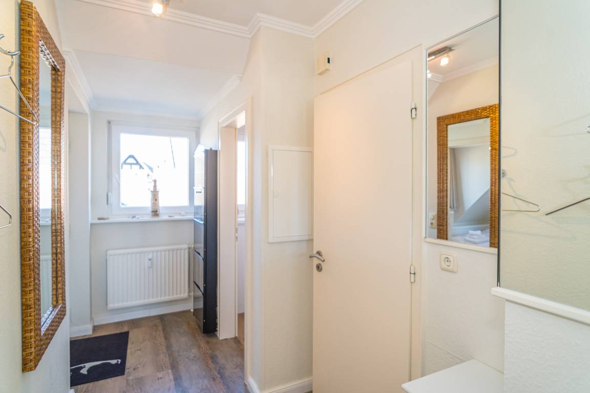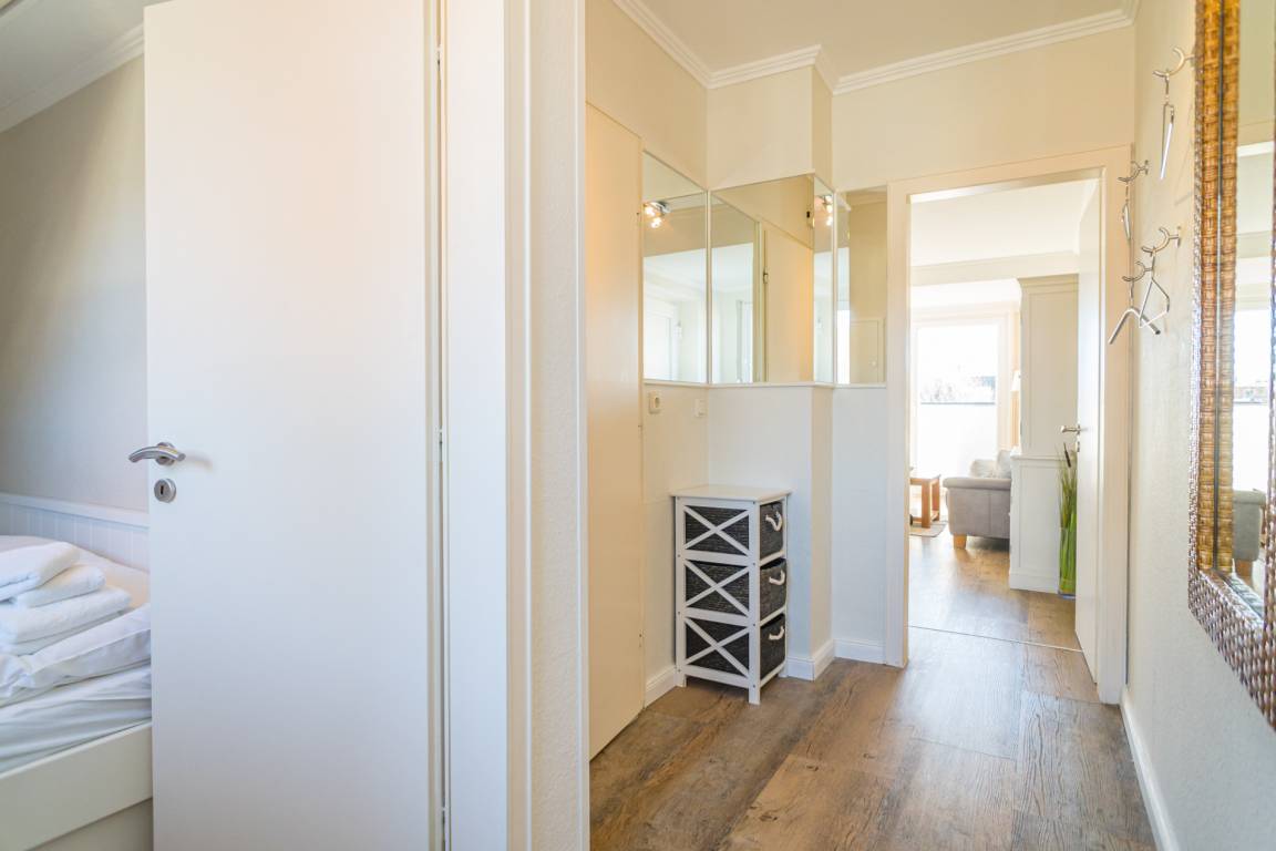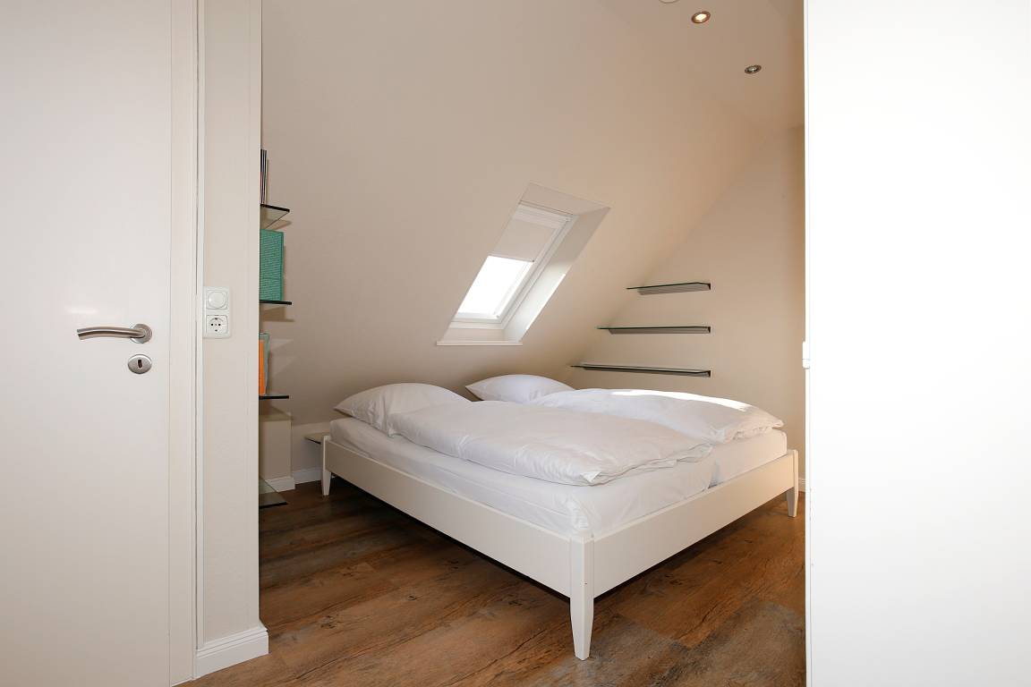 Beim Betreten der Wohnung gelangen Sie in den Flur, der direkt in das neu gestaltete Wohnzimmer führt. Hier finden Sie eine offene Küchenzeile mit moderner Ausstattung, darunter ein Geschirrspüler, eine Mikrowellen-Backofen-Kombination, eine Kaffeemaschine, ein Espressovollautomat und ein Toaster. Vom Wohnzimmer aus haben Sie Zugang zum sonnigen Süd-Balkon, perfekt für entspannte Stunden im Freien. Auf dieser Ebene befindet sich zudem ein Schlafzimmer mit einem gemütlichen Doppelbett (ca. 1,40 x 1,90 m) sowie ein Duschbad/WC. Für Unterhaltung sorgen Kabel-TV, Radio/CD und ein Telefon mit kostenlosem Wireless-LAN mit DSL-Anschluss. Das weitere Schlafzimmer hat ein großzügiges Doppelbett und reichlich Schrankraum für Ihre Garderobe.