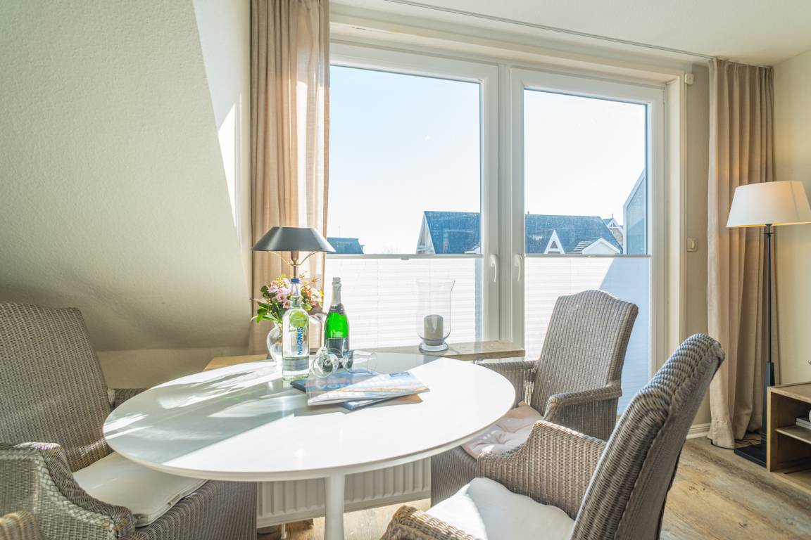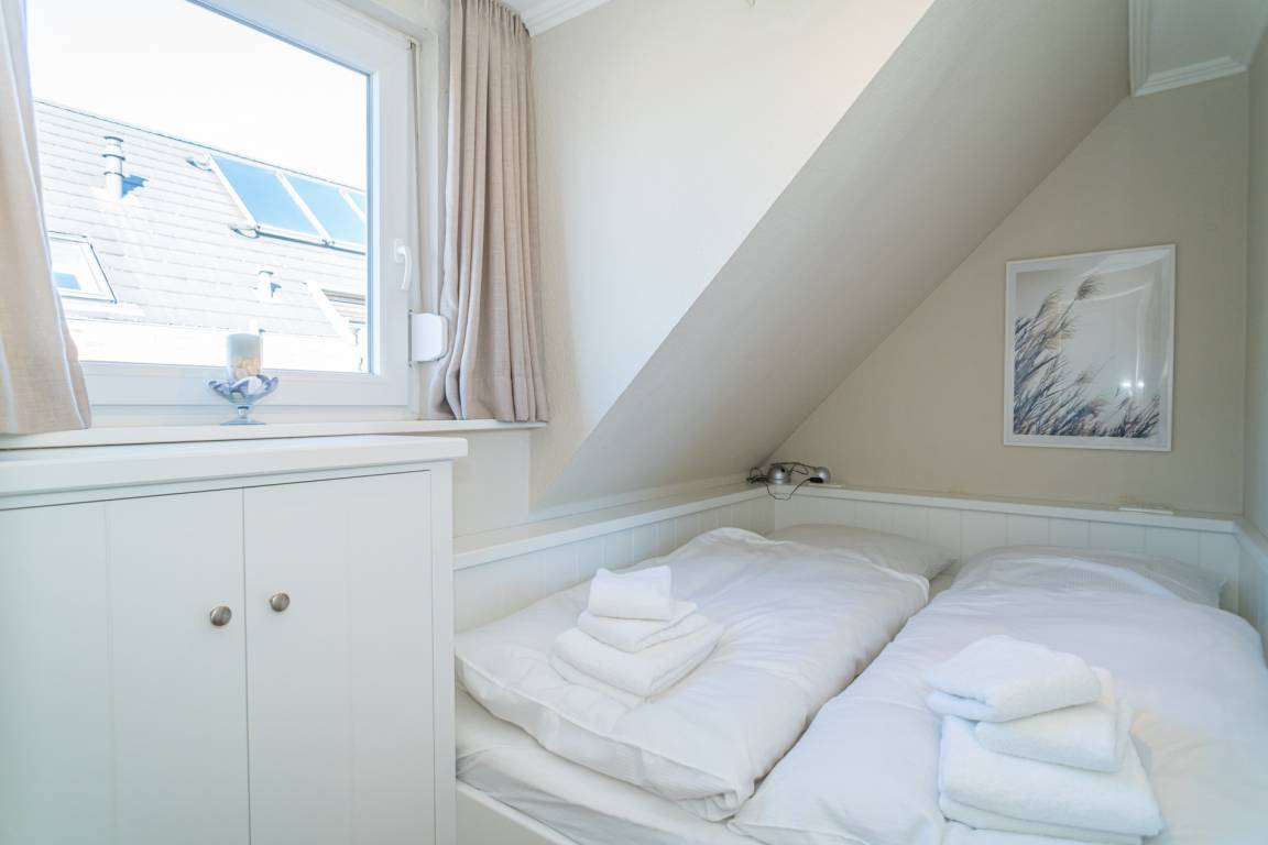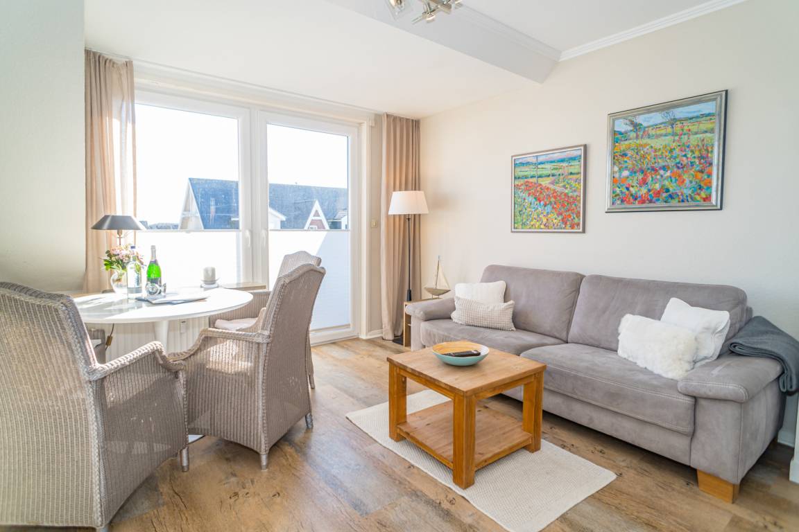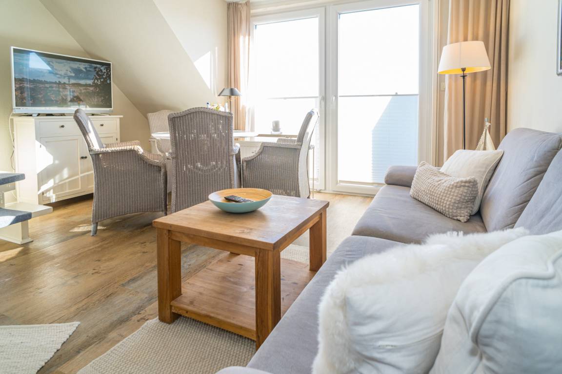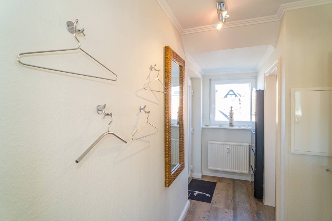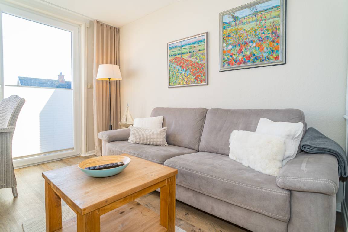 Beim Betreten der Wohnung gelangen Sie in den Flur, der direkt in das neu gestaltete Wohnzimmer führt. Hier finden Sie eine offene Küchenzeile mit moderner Ausstattung, darunter ein Geschirrspüler, eine Mikrowellen-Backofen-Kombination, eine Kaffeemaschine, ein Espressovollautomat und ein Toaster. Vom Wohnzimmer aus haben Sie Zugang zum sonnigen Süd-Balkon, perfekt für entspannte Stunden im Freien. Auf dieser Ebene befindet sich zudem ein Schlafzimmer mit einem gemütlichen Doppelbett (ca. 1,40 x 1,90 m) sowie ein Duschbad/WC. Für Unterhaltung sorgen Kabel-TV, Radio/CD und ein Telefon mit kostenlosem Wireless-LAN mit DSL-Anschluss. Das weitere Schlafzimmer hat ein großzügiges Doppelbett und reichlich Schrankraum für Ihre Garderobe.