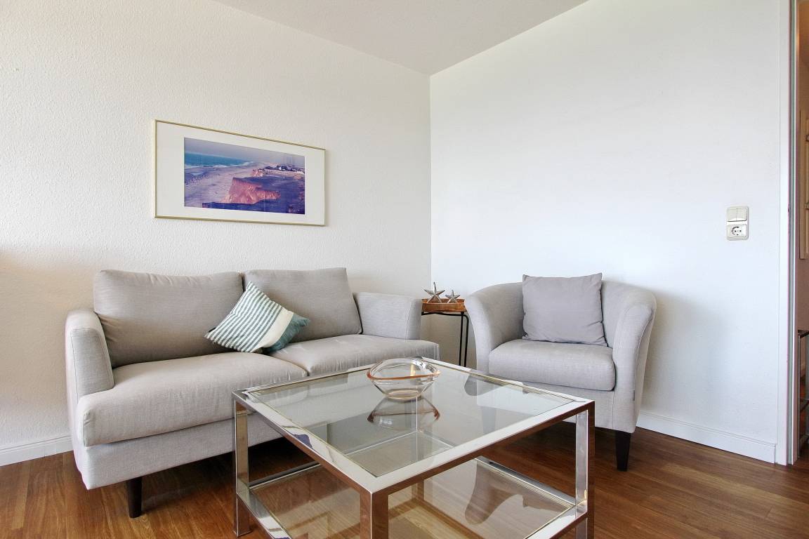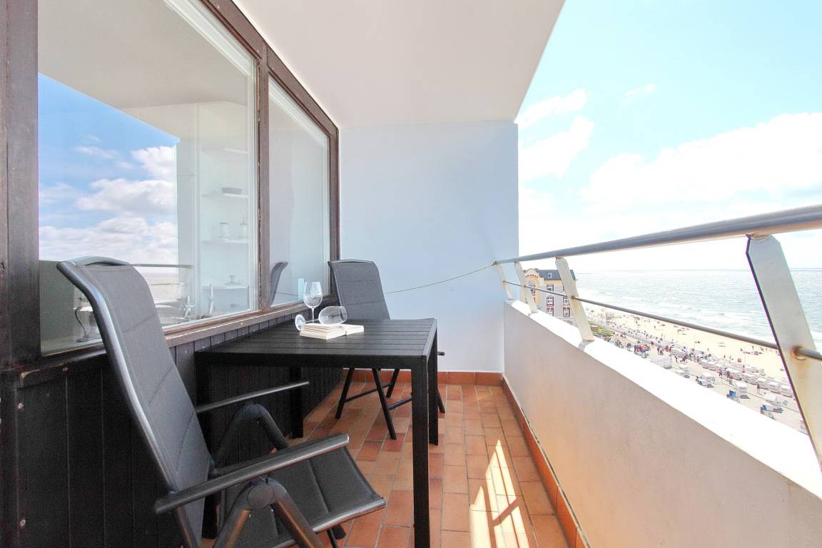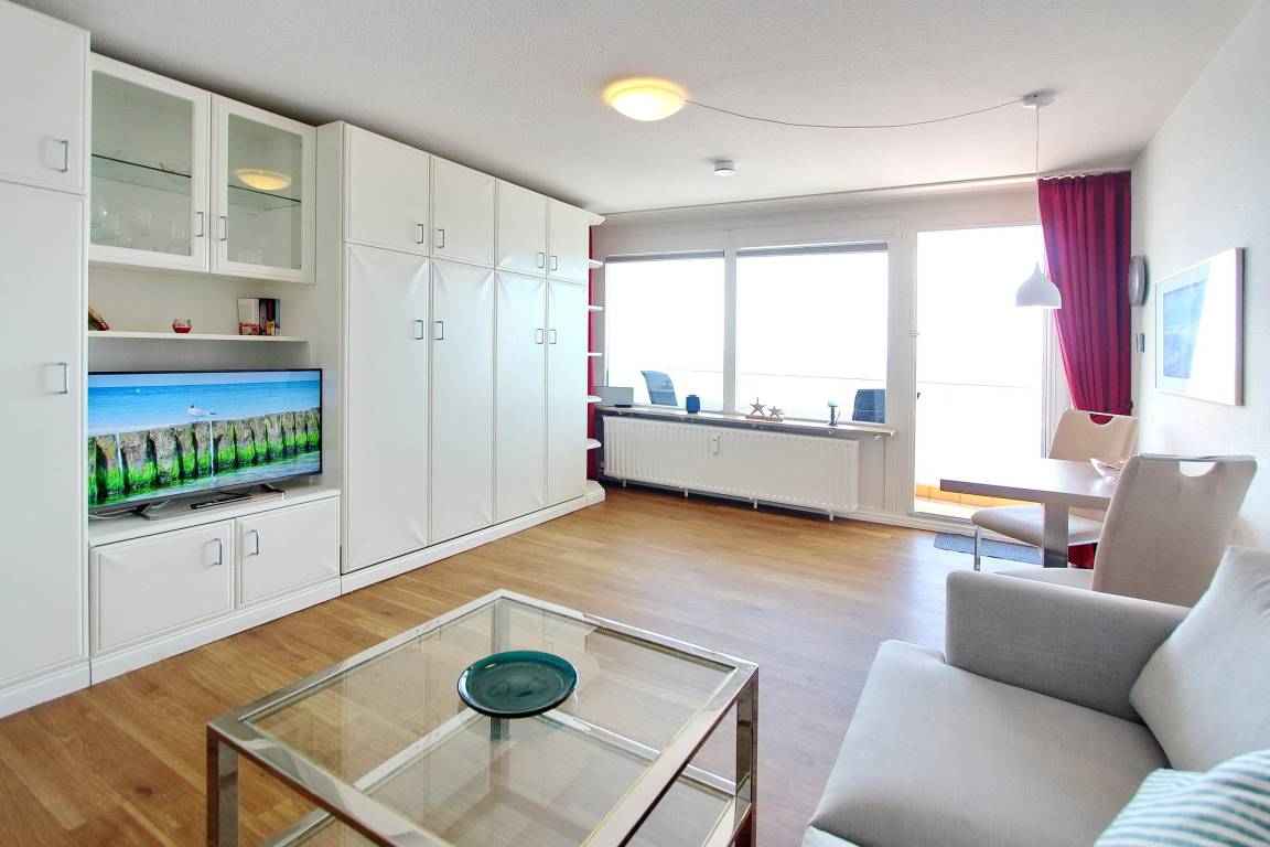 Diese Einzimmerwohnung in der 5. Etage im Haus Metropol hat einen herrlichen Blick über den Strand und die Nordsee. Der Wohn-/Schlafraum mit vorgelagertem Westbalkon verfügt über Einzelschrankbetten, einen Essplatz mit 2 Stühlen sowie eine Couch und einen Sessel. Laminatboden gibt dem Raum Wärme und Gemütlichkeit. Das neu renovierte Badezimmer hat eine Dusche mit niedrigem Einstieg, einen Fön und einen Duschhocker. Automatische Spülvorrichtungen in der Dusche und im Waschbecken wurden installiert. In der kleinen Einbauküche im Flur gibt es ein Ceranfeld, einen Geschirrspüler und eine Mikrowelle. Zur technischen Ausstattung dieser Wohnung gehört : ein Flachbildfernseher von Panasonic und ein Bluetoothradio mit CD Player von Sony. Ein freies WLAN Netzwerk (WEG Haus Metropol - Passwortfrei - ohne Gewähr) steht ihnen kostenfrei zur Verfügung. Wohnungsgröße: ca. 34 m².
