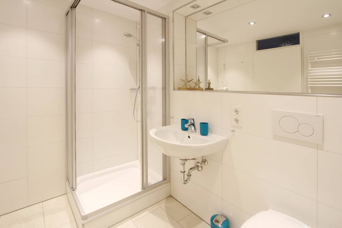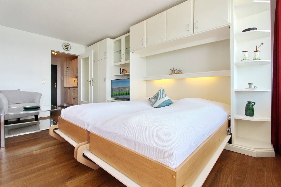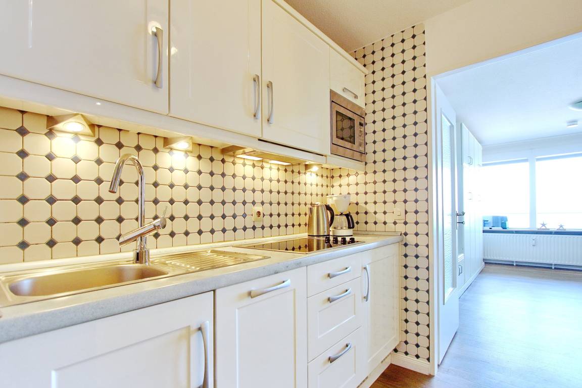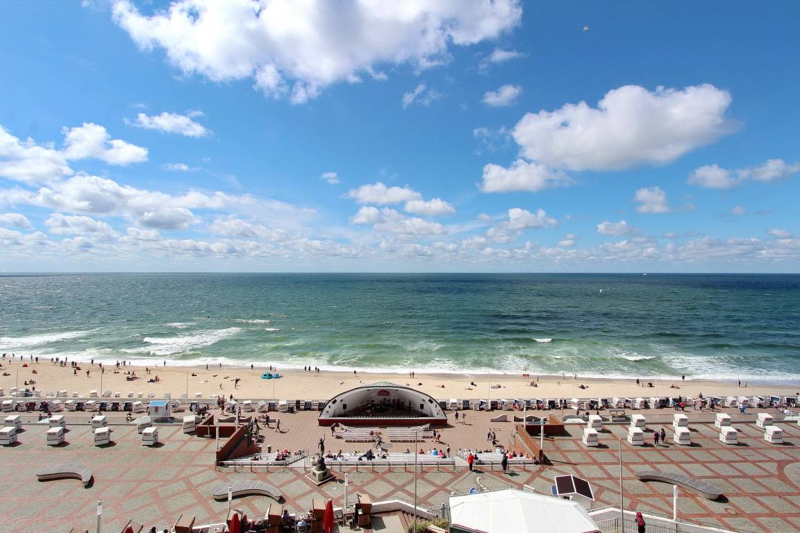 Diese Einzimmerwohnung in der 5. Etage im Haus Metropol hat einen herrlichen Blick über den Strand und die Nordsee. Der Wohn-/Schlafraum mit vorgelagertem Westbalkon verfügt über Einzelschrankbetten, einen Essplatz mit 2 Stühlen sowie eine Couch und einen Sessel. Laminatboden gibt dem Raum Wärme und Gemütlichkeit. Das neu renovierte Badezimmer hat eine Dusche mit niedrigem Einstieg, einen Fön und einen Duschhocker. Automatische Spülvorrichtungen in der Dusche und im Waschbecken wurden installiert. In der kleinen Einbauküche im Flur gibt es ein Ceranfeld, einen Geschirrspüler und eine Mikrowelle. Zur technischen Ausstattung dieser Wohnung gehört : ein Flachbildfernseher von Panasonic und ein Bluetoothradio mit CD Player von Sony. Ein freies WLAN Netzwerk (WEG Haus Metropol - Passwortfrei - ohne Gewähr) steht ihnen kostenfrei zur Verfügung. Wohnungsgröße: ca. 34 m².