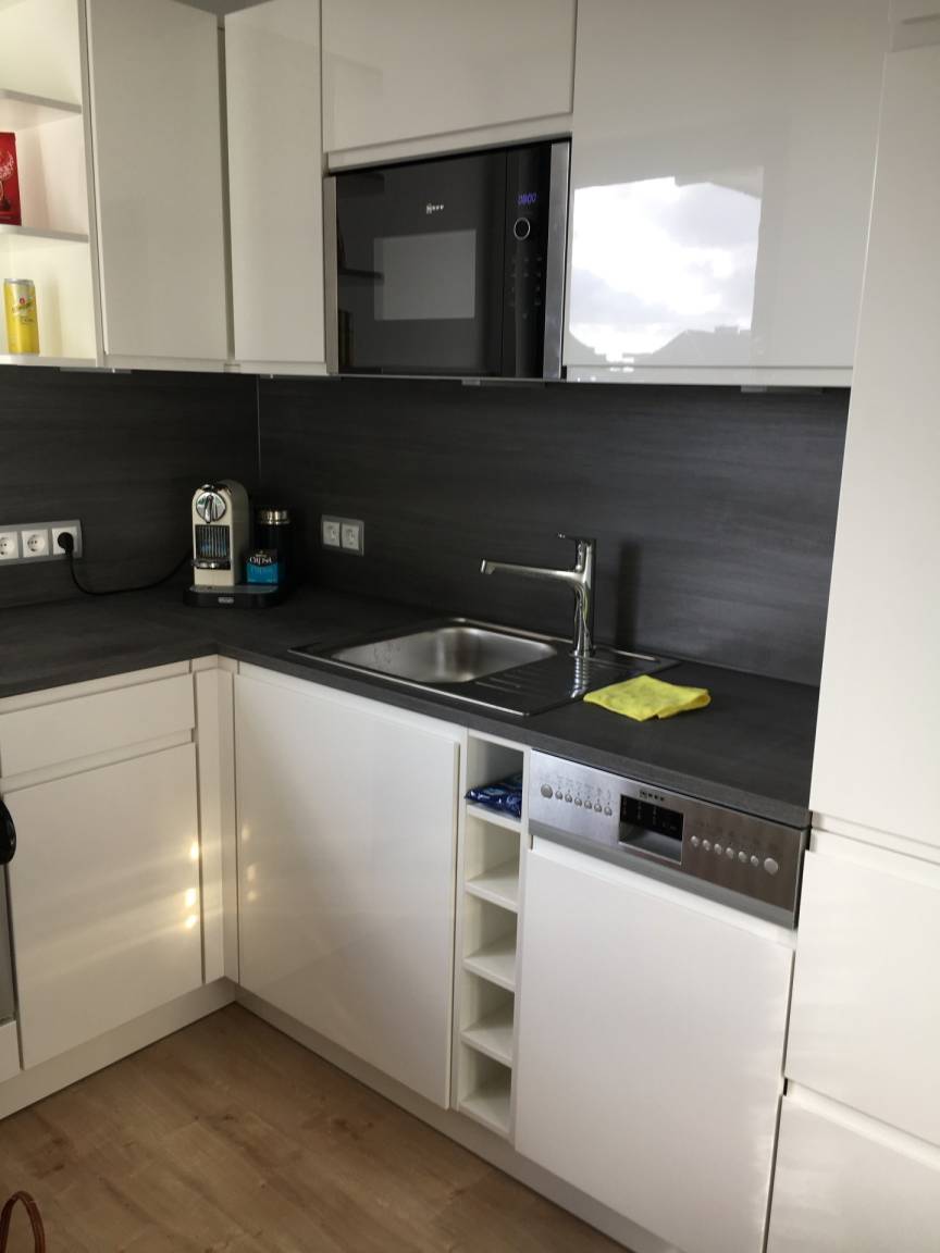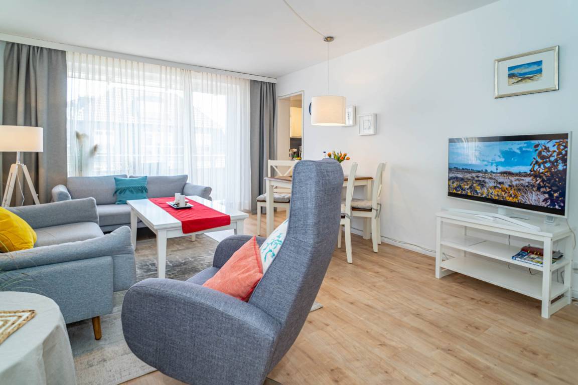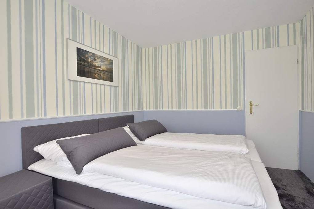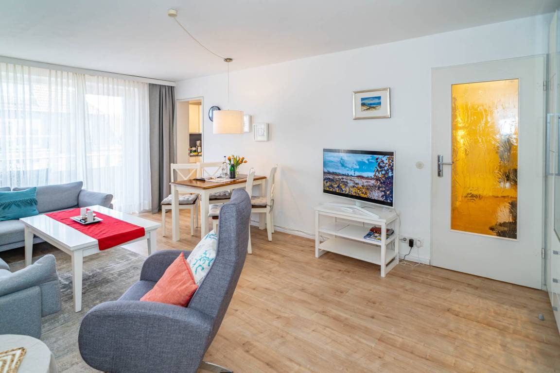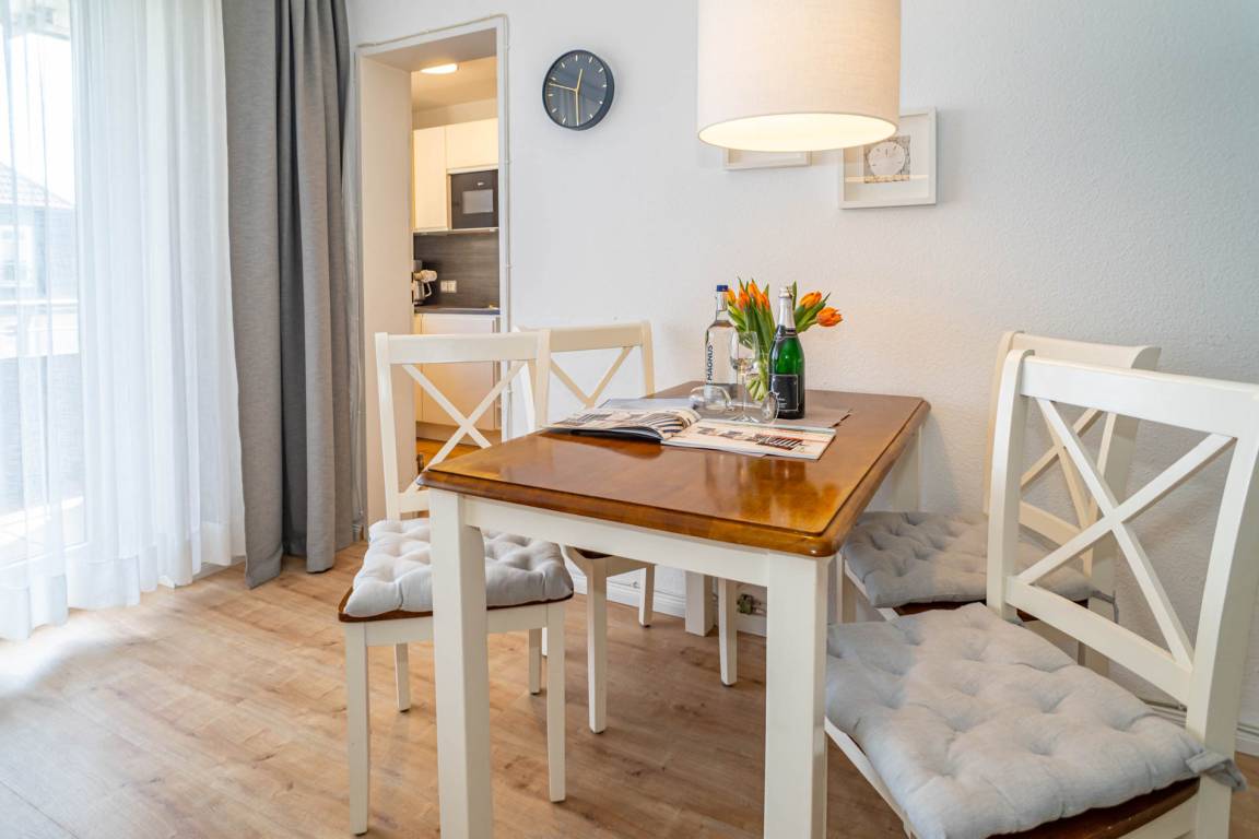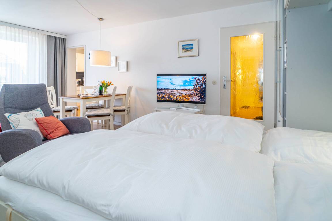 Besonders hochwertig sanierte 2-Zimmer-Nichtraucher-Ferienwohnung in der 2. Etage mit zwei Ostbalkonen mit Bio-Designboden in den Räumlichkeiten mit Ausnahme von Schlafzimmer und Bad. Von der geräumigen Diele aus gelangt man in sämtliche Räume. Das ansprechende Wohnzimmer mit zwei 2-Sitzer-Sofa, Sessel, separatem Essplatz, 1 großer Flatscreen-Smart-TV (44'' Zoll bzw. 108 cm Bildschirmdiagonale, geeignet für Netflix etc.), Telefon mit kostenloser Telefonie ins deutsche Festnetz, freiem W-Lan und Doppelschrankbett mit 2 neuen Einzelmatratzen (je 0,80 m breit) lässt keine Wünsche offen. Die neue stylische Küche ist mit Geschirrspüler, Mikrowelle und 4-Platten-Ceranfeld ausgestattet. Wasserkocher und Toaster gehören zur Grundausstattung.