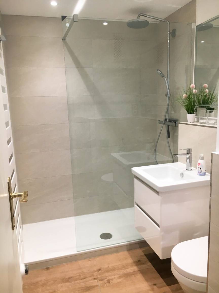 Das neue Badezimmer besitzt eine Dusche mit extraflachem Einstieg (mit Regendusche), einen Waschtisch, ein spülrandloses WC, Fön und Kosmetikspiegel. Hier wird die ansprechende Holzoptik des Designfußbodens durch einen entsprechenden Fußboden-Fliesenbelag fortgeführt. Das Schlafzimmer ist mit 2 besonders komfortablen Boxspring-Einzelbetten in optimaler Schlafhöhe ausgestattet, die auch zusammen gestellt werden können. Hier steht ein weiterer Flatscreen-TV (26 '' bzw. 66 cm Bildschirmdiagonale) zur Verfügung.