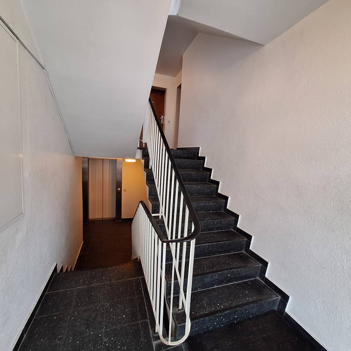 Der Aufzug ist über wenige Stufen erreichbar – wahlweise vier Stufen abwärts oder neun Stufen aufwärts.