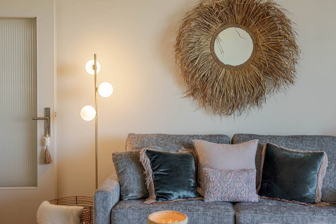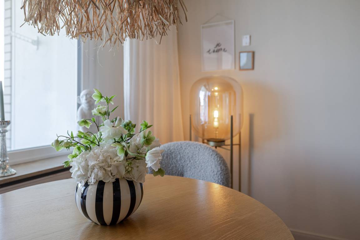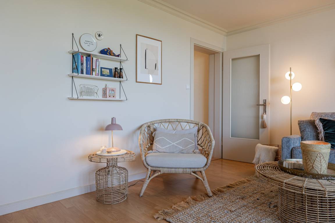 Der helle Wohnbereich ist stilvoll eingerichtet und lädt zum Verweilen ein. Hochwertige Esszimmerstühle von Freifrau, eine gemütliche Couch (auch als Schlafmöglichkeit nutzbar) und viel Tageslicht schaffen eine angenehme Atmosphäre.