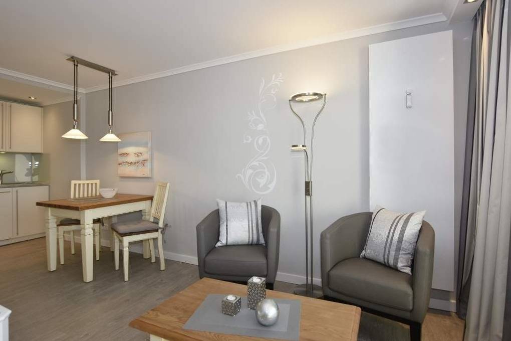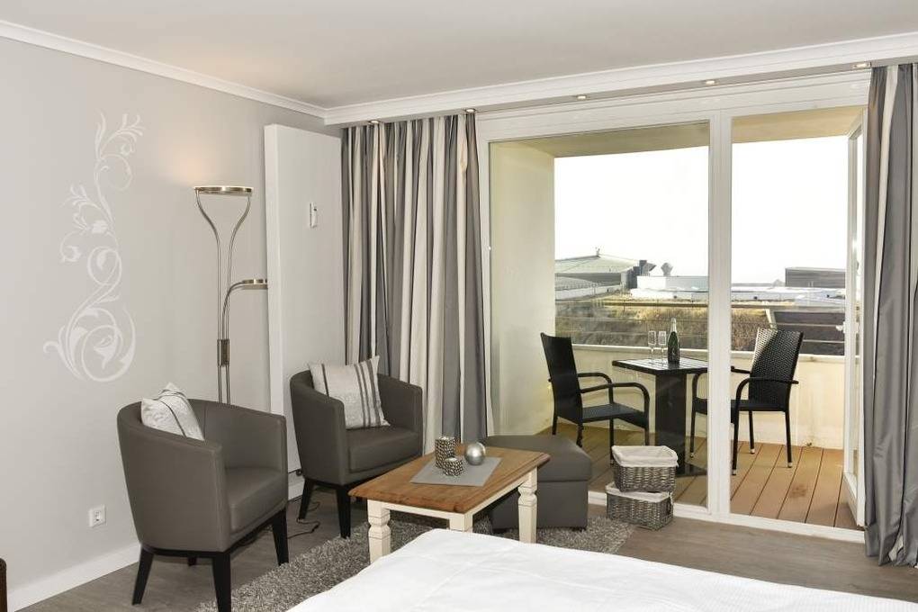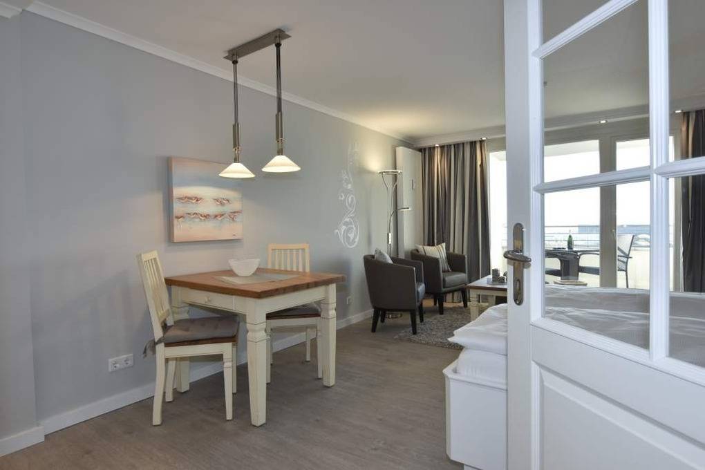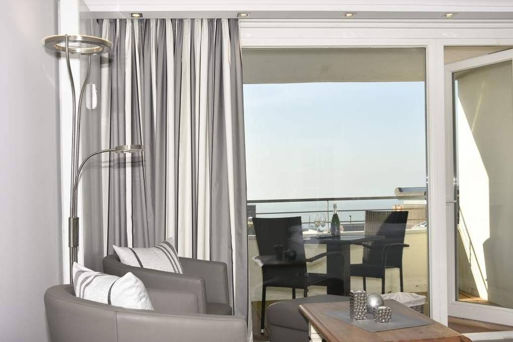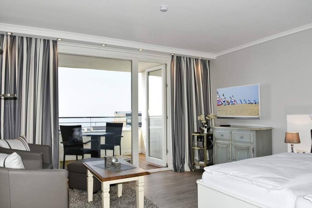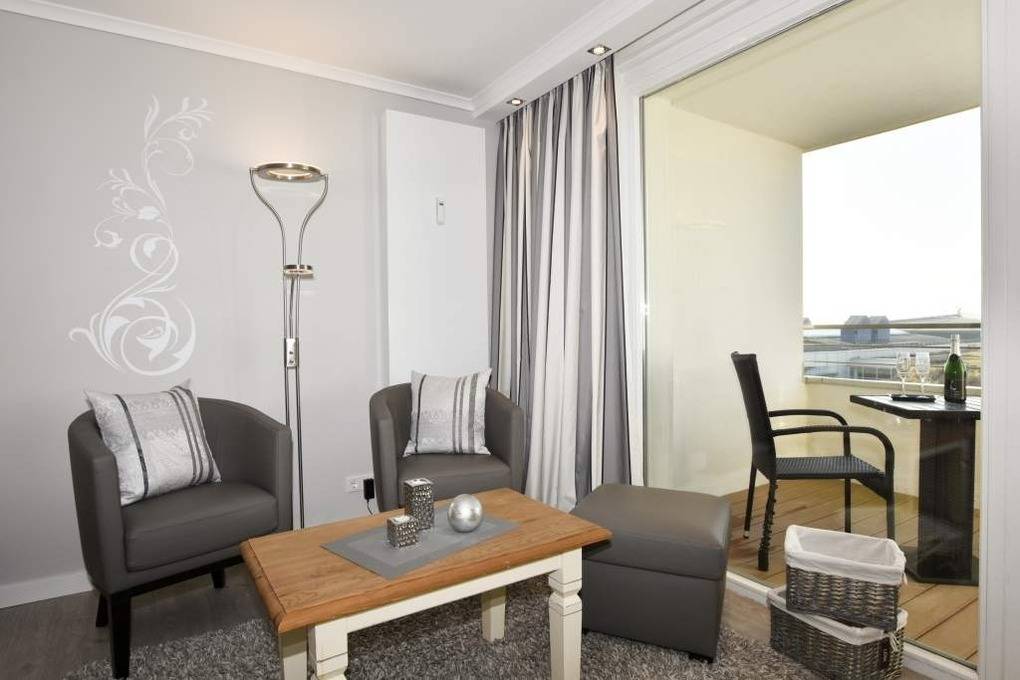 Diese hochwertig sanierte 1-Zimmer-Nichtraucher-Ferienwohnung (ca. 43 m²) in der 4. Etage besticht durch ihren stilvollen Komfort, ihre Großzügigkeit und den traumhaften Blick zur Nordsee. Die sonnige Westloggia mit Balkonmöbeln und Auflagen lädt nachmittags zum Entspannen und Genießen des Meerblicks ein – perfekt für Paare, die Wert auf stilvolles Ambiente legen.