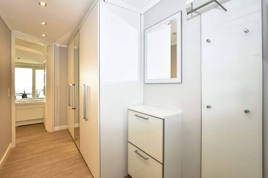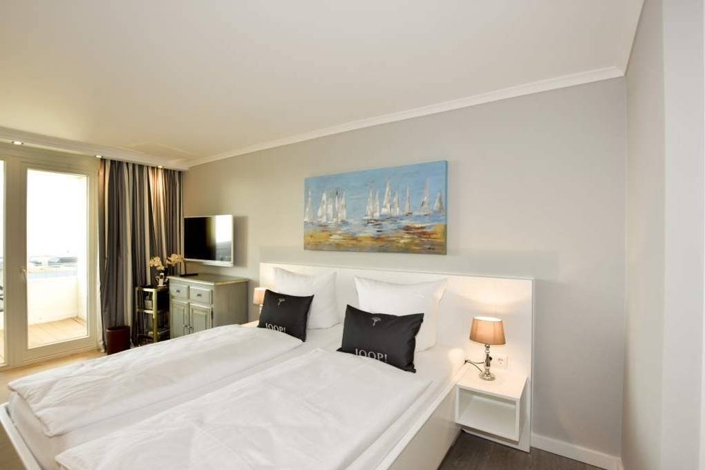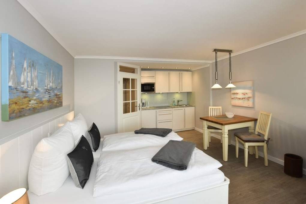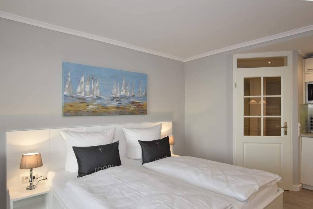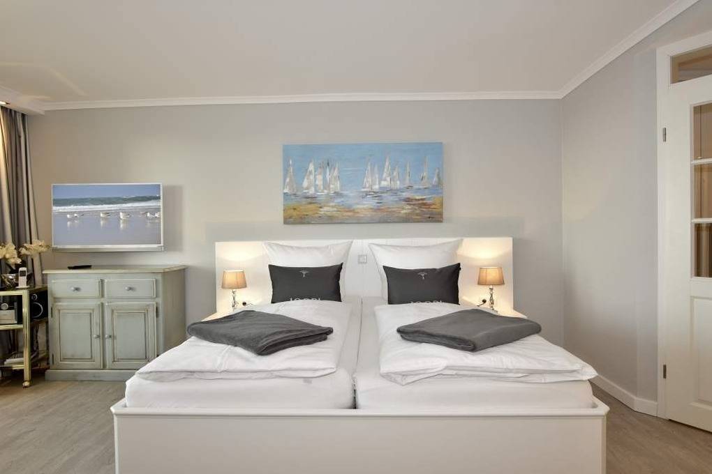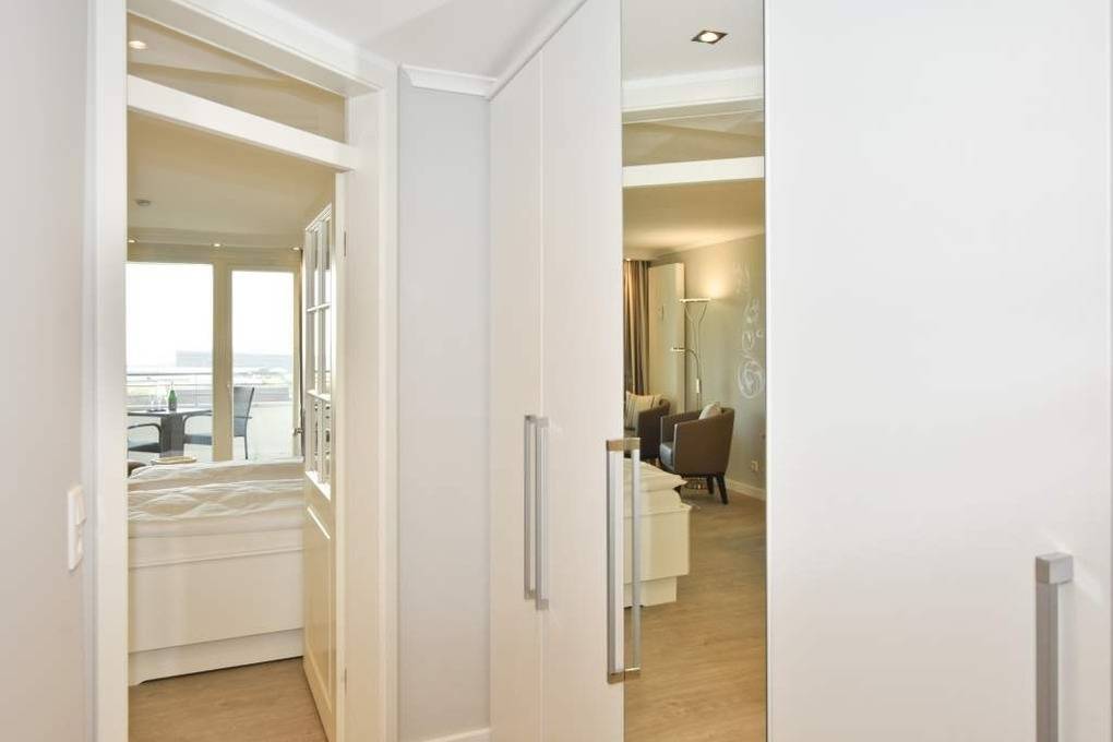 Diese hochwertig sanierte 1-Zimmer-Nichtraucher-Ferienwohnung (ca. 43 m²) in der 4. Etage besticht durch ihren stilvollen Komfort, ihre Großzügigkeit und den traumhaften Blick zur Nordsee. Die sonnige Westloggia mit Balkonmöbeln und Auflagen lädt nachmittags zum Entspannen und Genießen des Meerblicks ein – perfekt für Paare, die Wert auf stilvolles Ambiente legen.