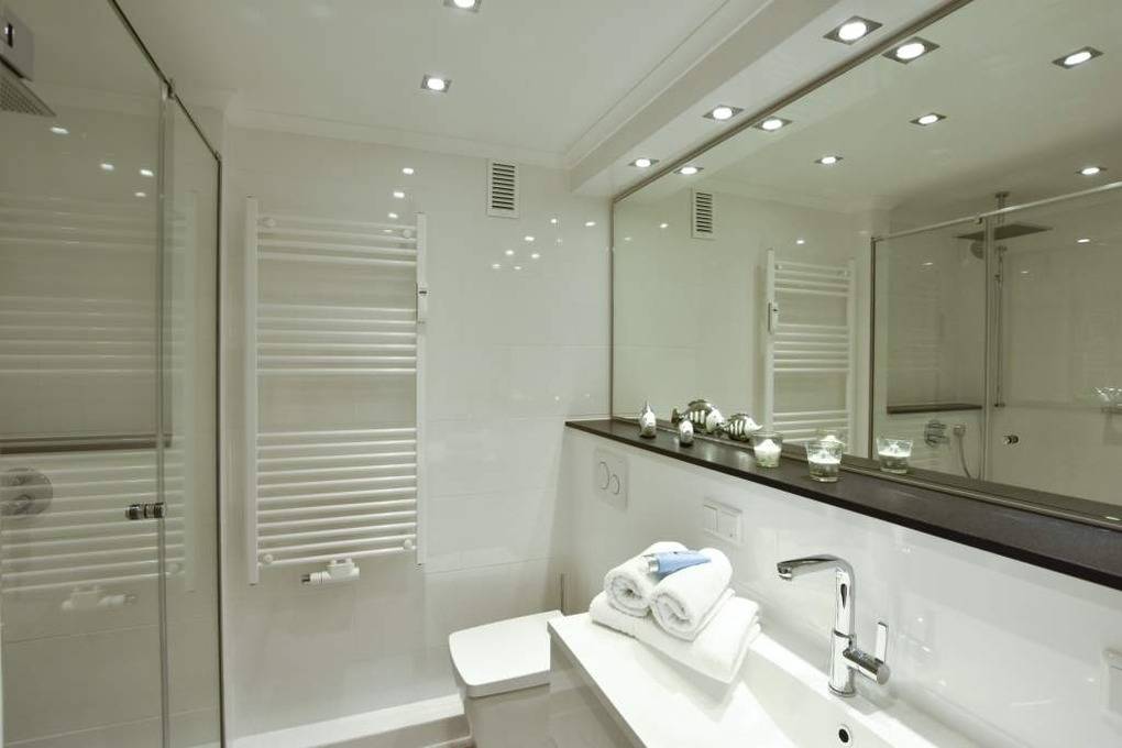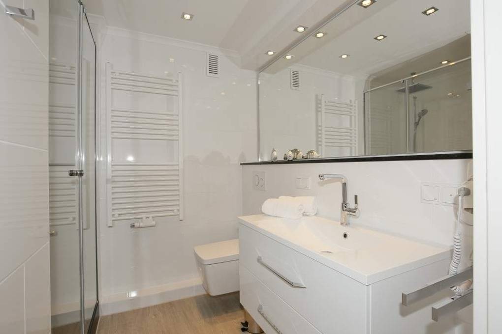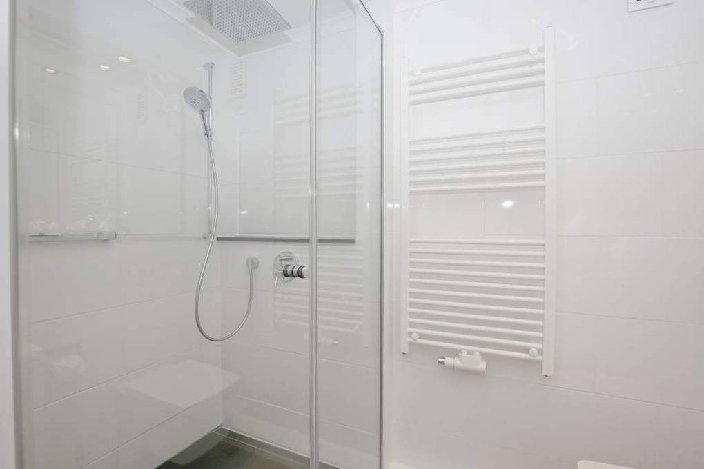 Das exklusive Badezimmer bietet mit schwarzem Granitboden in der Dusche, einem hochwertigen Duschsystem mit Kopf- und Handbrause, extraflachem Einstieg, modernem Waschtisch, festinstalliertem Haartrockner, Handtuchtrockner und Softclose-WC echten Spa-Komfort.