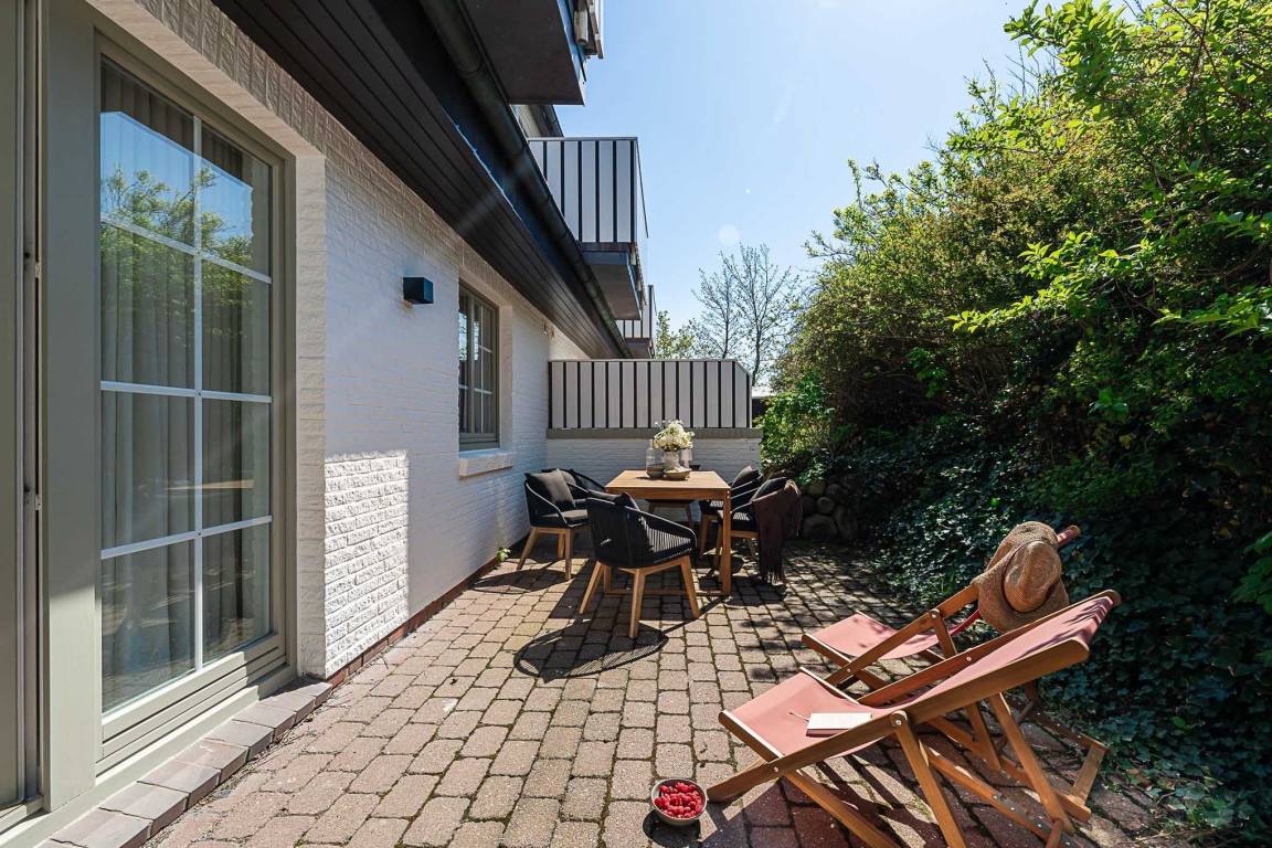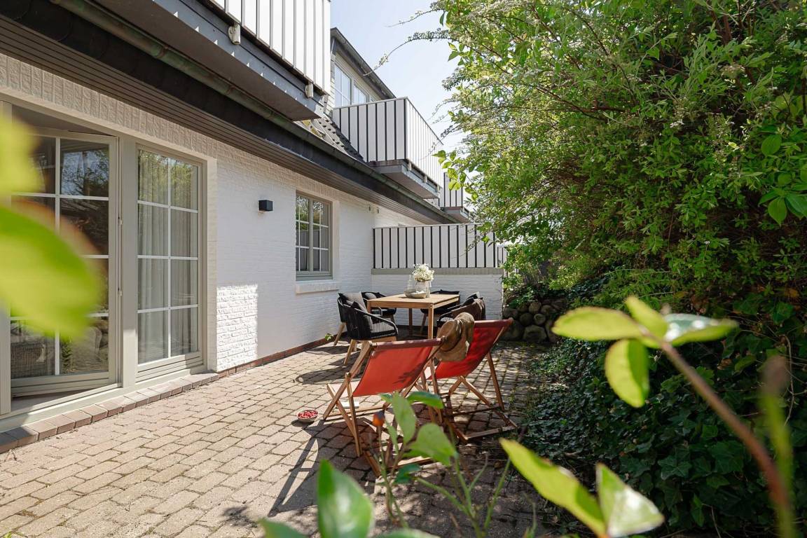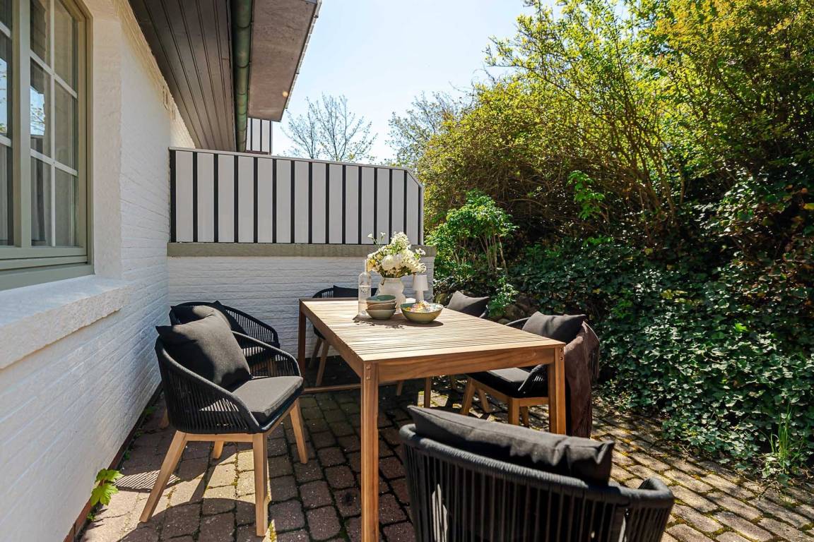Ein echtes Highlight ist die eigene Terrasse, die von Mai bis Oktober mit bequemen Möbeln ausgestattet ist. Hier genießen Sie die frische Nordseeluft, starten entspannt in den Tag oder lassen ihn bei einem Glas Wein ausklingen.