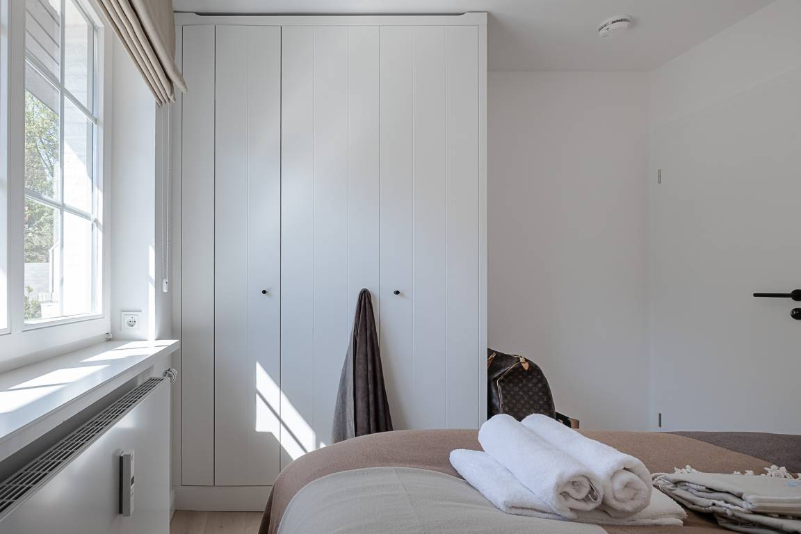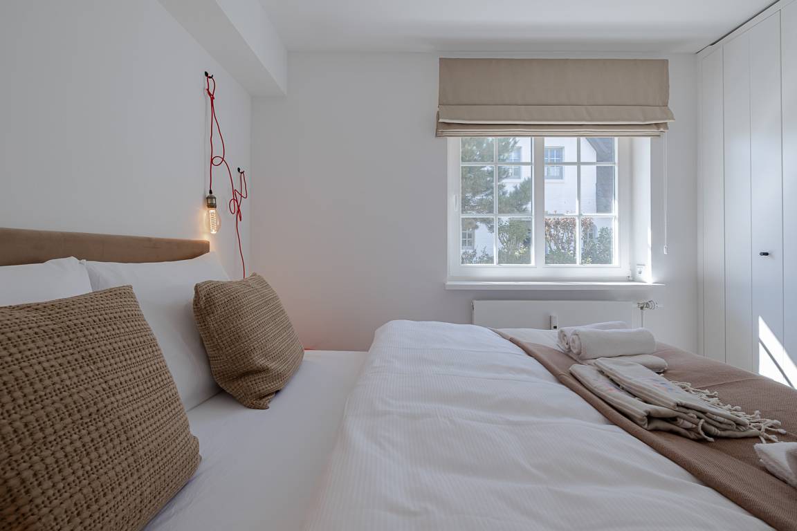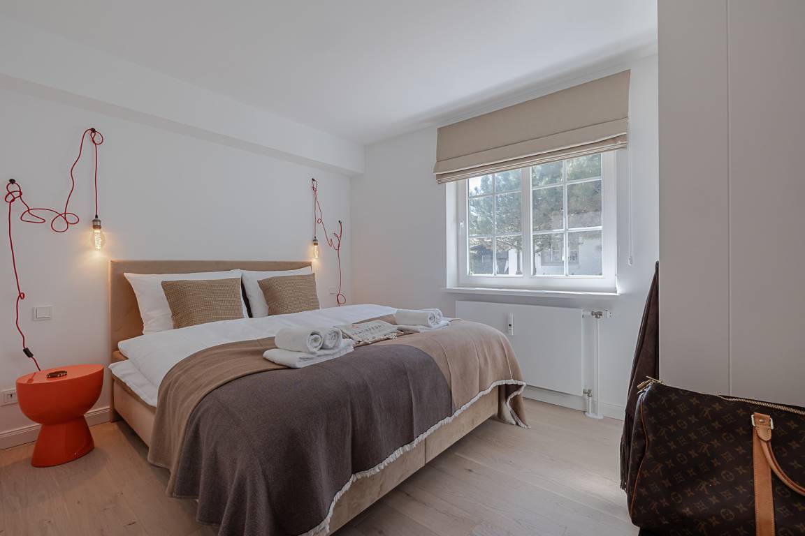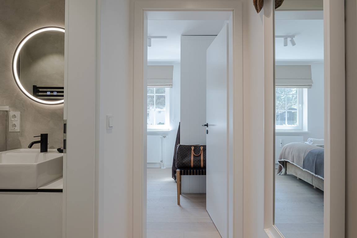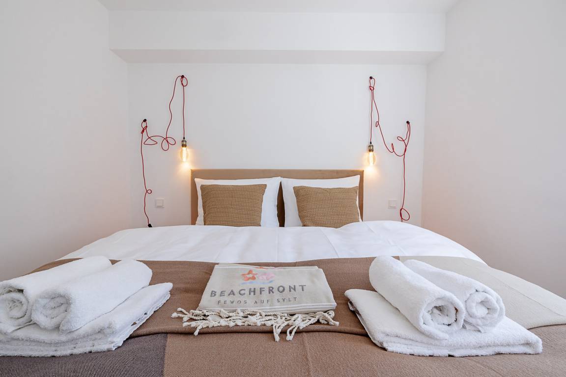 Im separaten Schlafzimmer erwartet Sie ein komfortables Schramm-Boxspringbett, das für erholsame Nächte sorgt. Direkt angeschlossen liegt Ihr stilvolles Bad mit großer Regendusche, Fußbodenheizung und Handtuchwärmer – Ihre private kleine Wellnessoase nach einem Strandspaziergang.