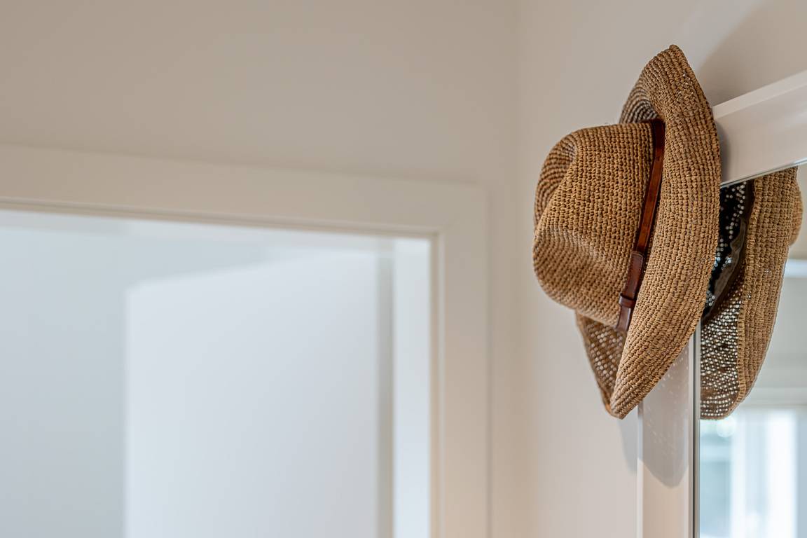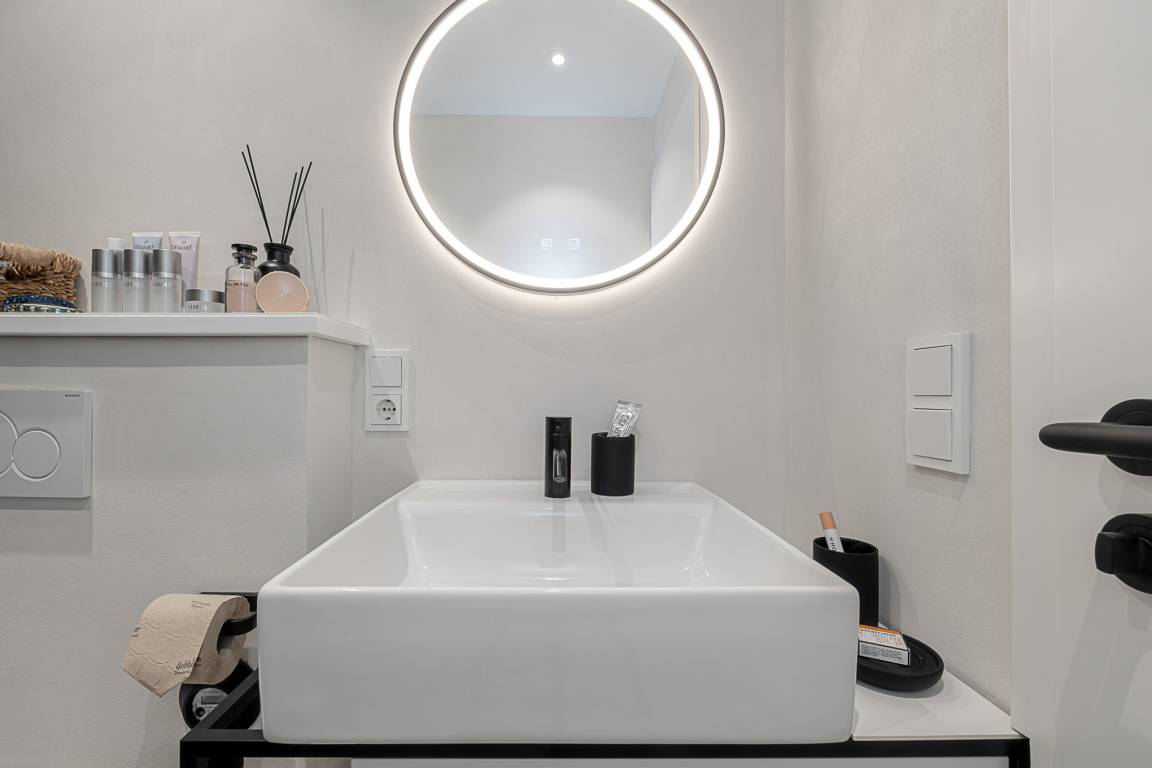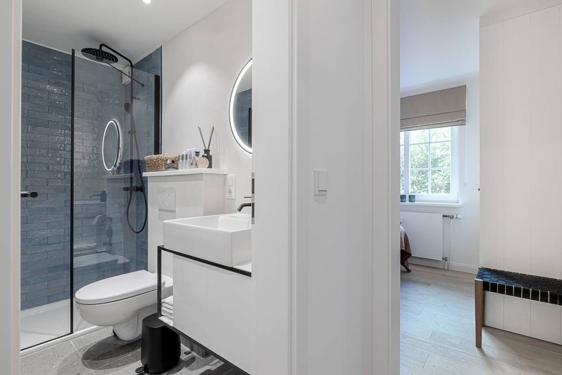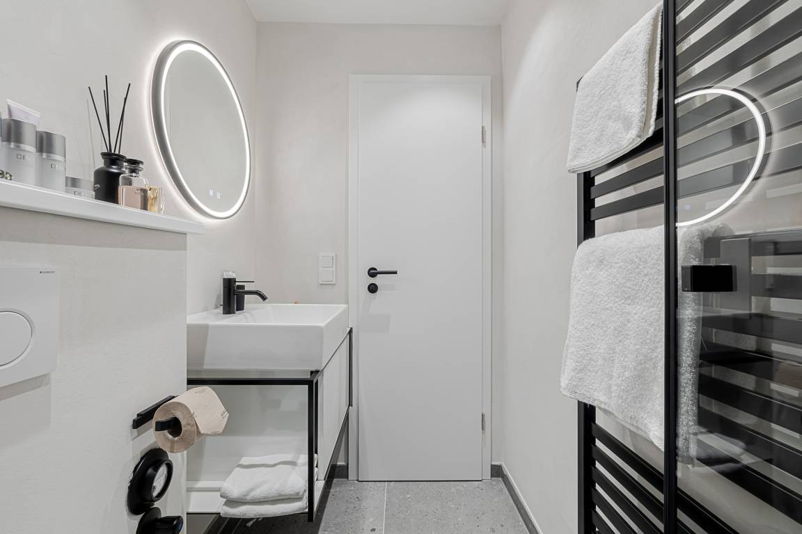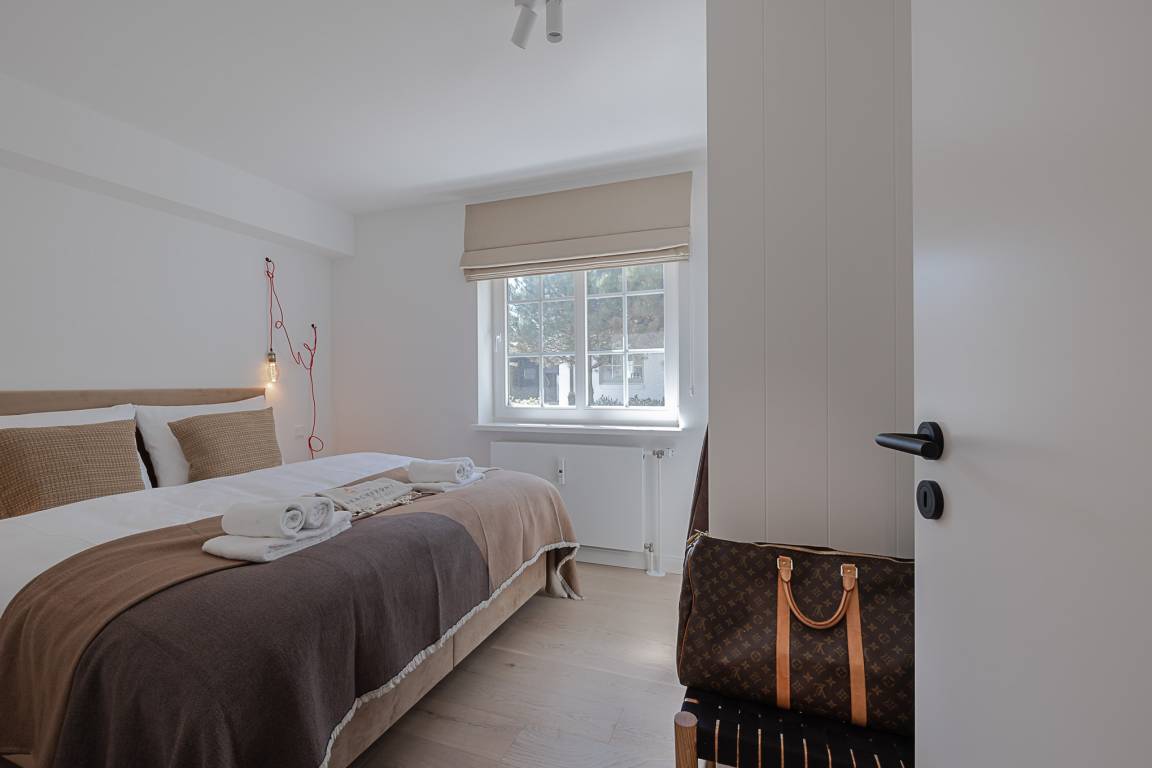 Im separaten Schlafzimmer erwartet Sie ein komfortables Schramm-Boxspringbett, das für erholsame Nächte sorgt. Direkt angeschlossen liegt Ihr stilvolles Bad mit großer Regendusche, Fußbodenheizung und Handtuchwärmer – Ihre private kleine Wellnessoase nach einem Strandspaziergang.