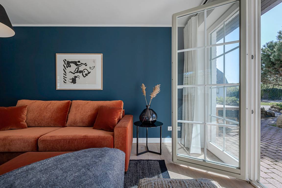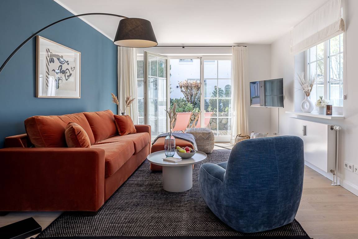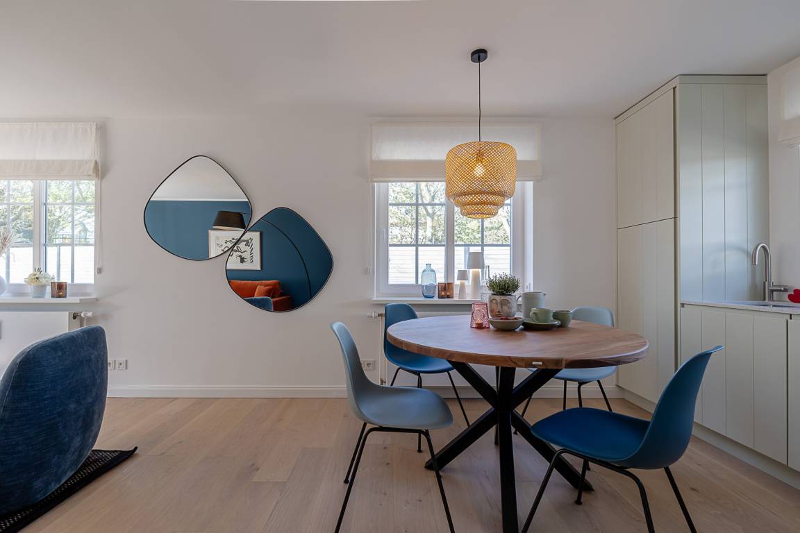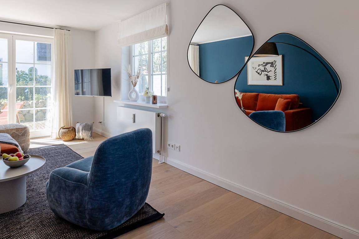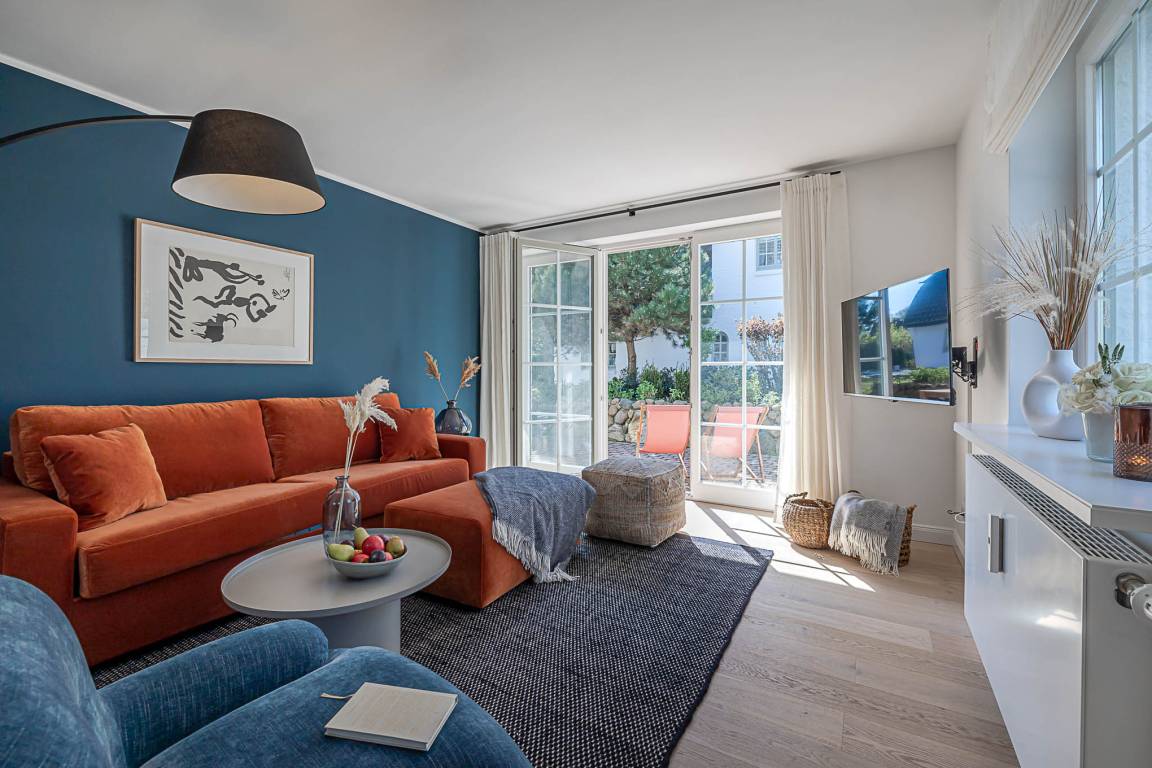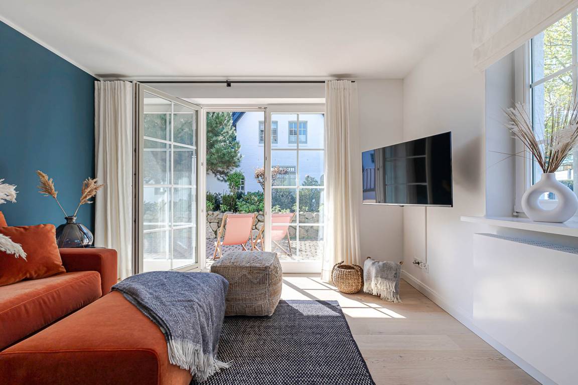Schon beim Eintreten empfängt Sie eine ruhige, hochwertige Atmosphäre: edles Eichenparkett, hohe Decken, viel Tageslicht und eine harmonisch abgestimmte Einrichtung sorgen für echtes Sylter Wohlgefühl. Der Wohn- und Essbereich lädt zum Entspannen, Lesen oder gemeinsamen Essen ein. Ein vollwertiges Schlafsofa ergänzt den Raum und bietet bei Bedarf eine komfortable zusätzliche Schlafgelegenheit.