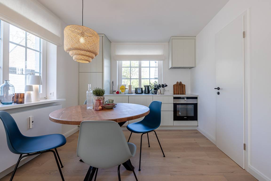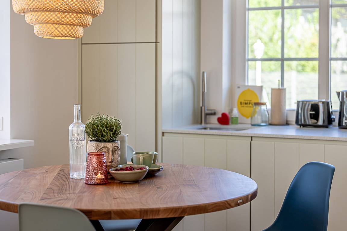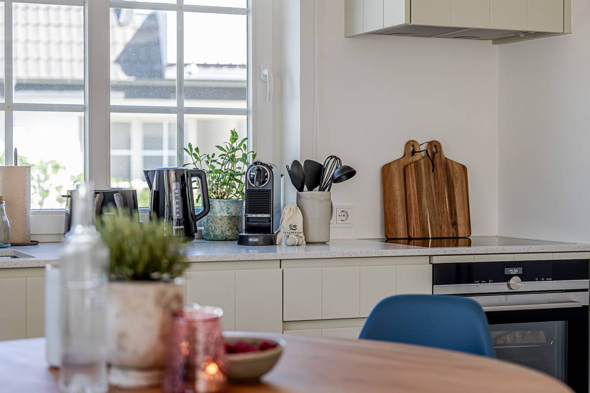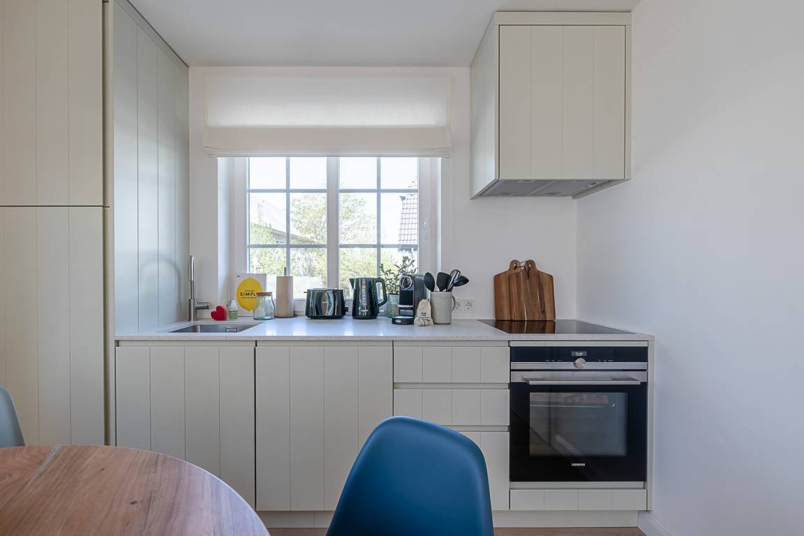 Die moderne Küche mit hochwertigen Markengeräten von Siemens ist komplett ausgestattet und bietet alles, was Sie für Frühstück, Snacks oder ein gemütliches Abendessen benötigen – mit Blick nach draußen.