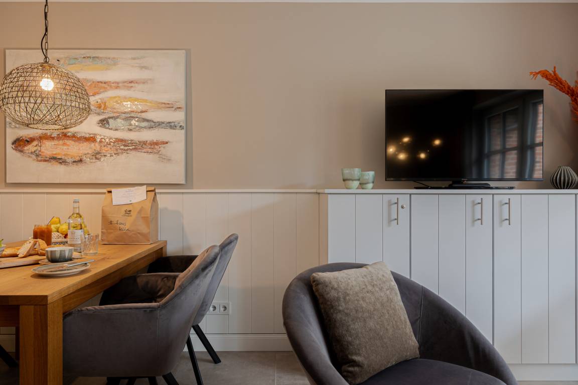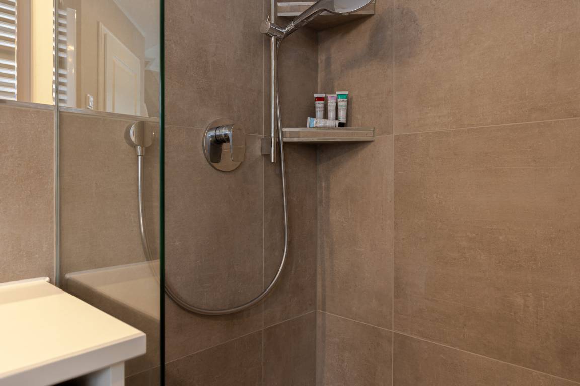 Die Küche ist bestens ausgestattet und verfügt über ein Induktionskochfeld, einen Backofen, eine Geschirrspülmaschine und eine Nespresso-Maschine. Am Esstisch finden bis zu sechs Personen Platz und von dort aus gelangen Sie auf die großzügige und möblierte Terrasse (von April bis Oktober). Die Terrasse ist zum Westen hin ausgerichtet und bietet genügend Privatsphäre. Auf dieser Etage finden Sie ebenfalls ein kleines Gäste-WC.