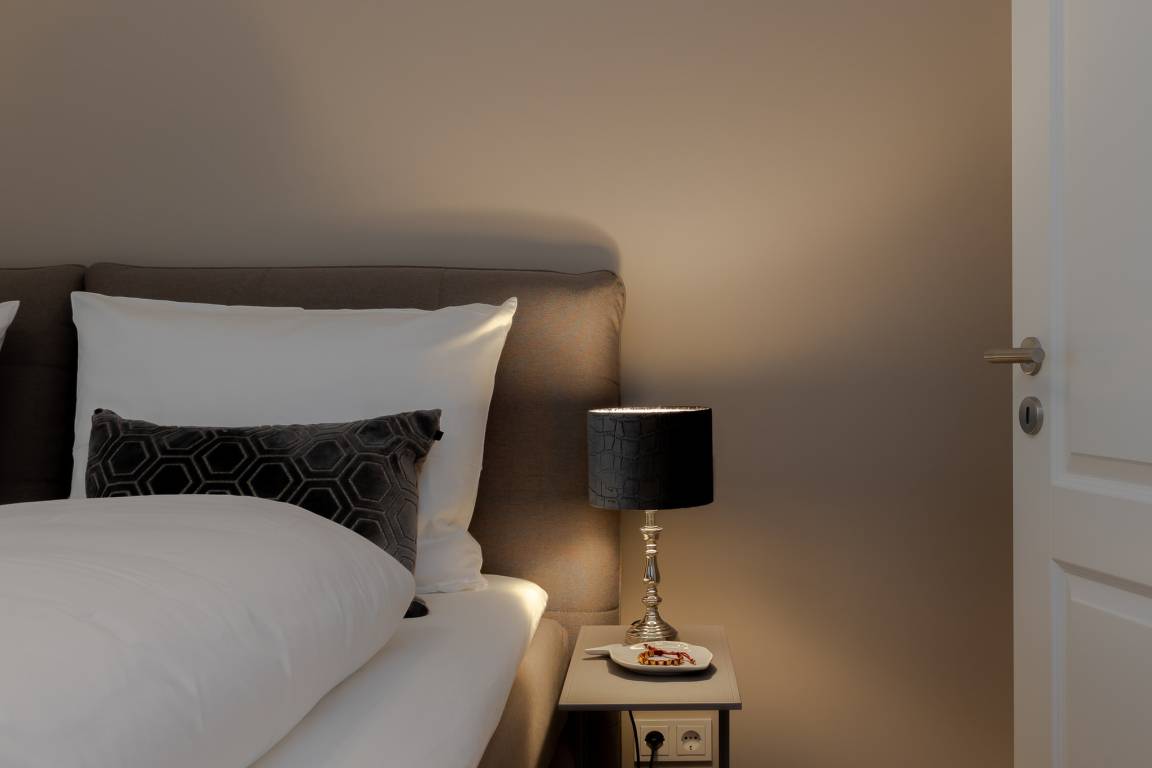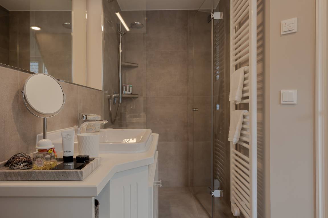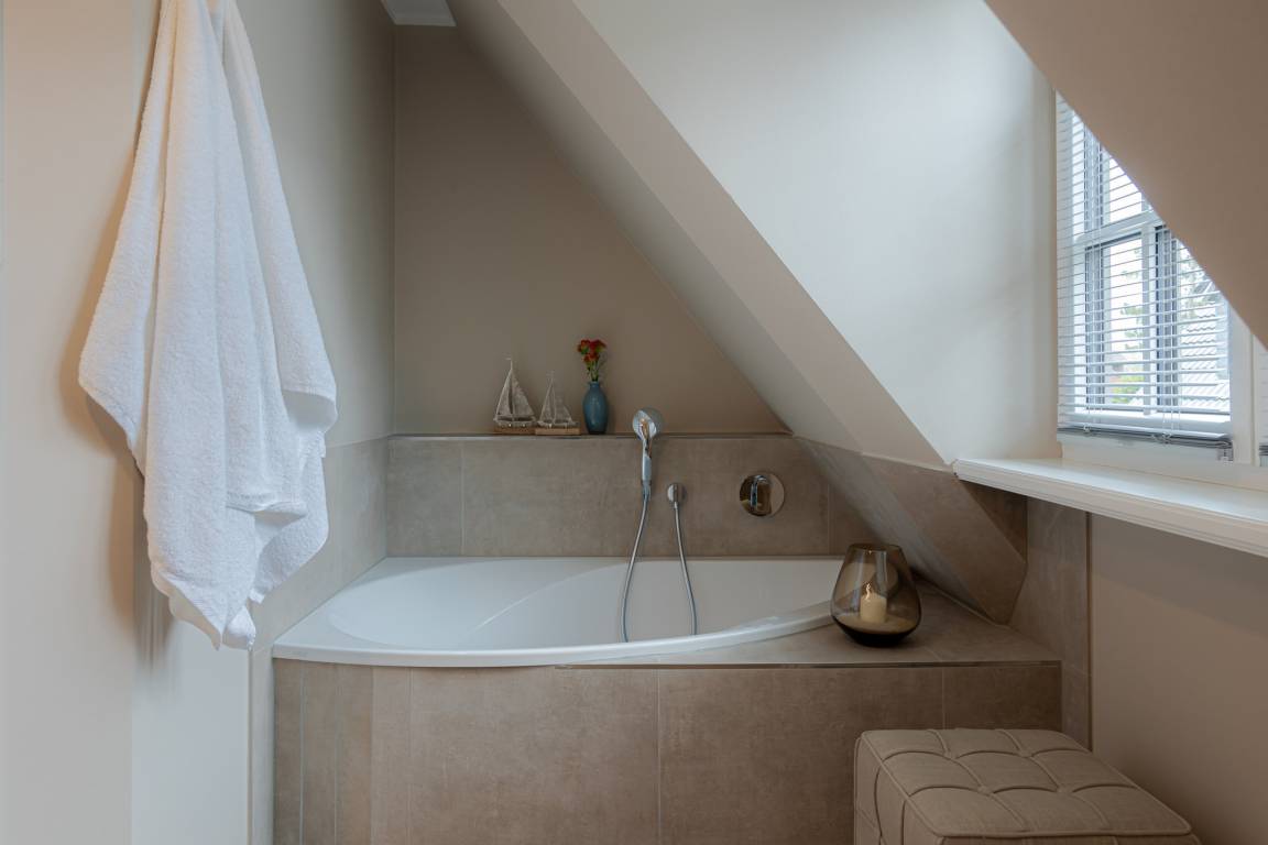 Im Obergeschoss befindet sich das zweite Schlafzimmer, welches ebenfalls über ein gemütliches Boxspringbett, einen Flatscreen-TV und einen großzügigen Kleiderschrank verfügt. Das Badezimmer – Eine kleine eigene Wohlfühloase, mit Tageslicht, hellen Lime Stone Fliesen, einer Badewanne und einer Dusche.