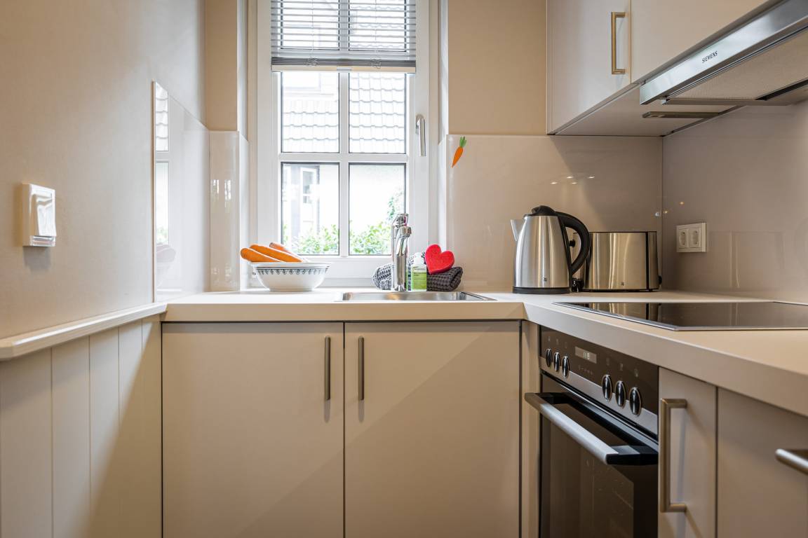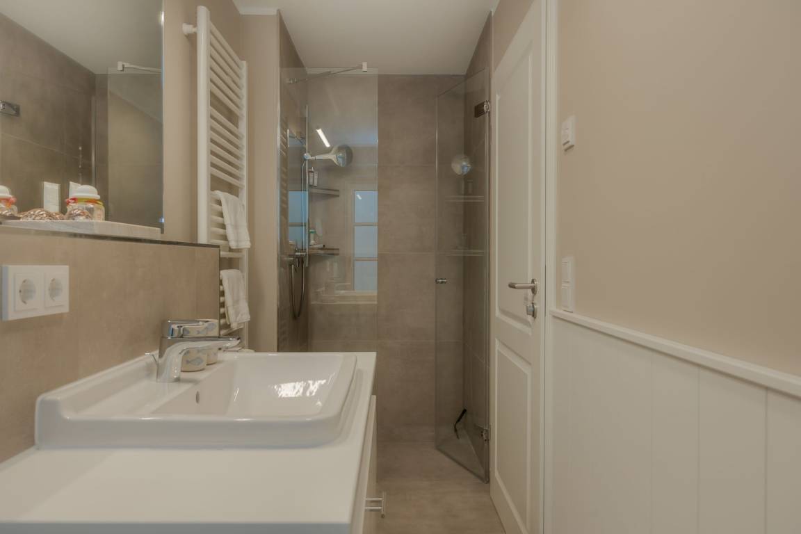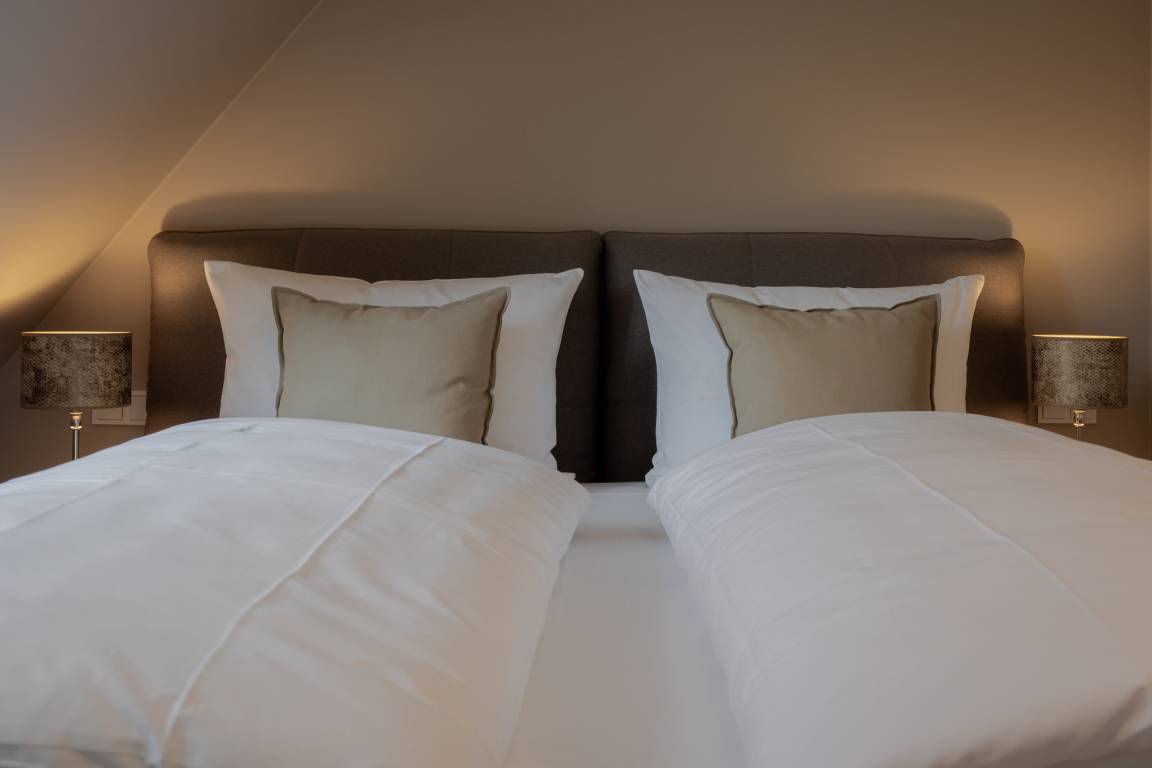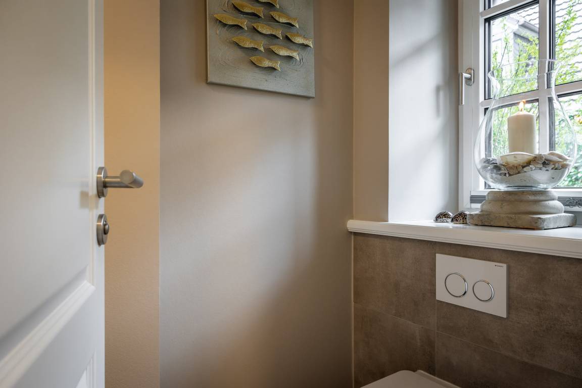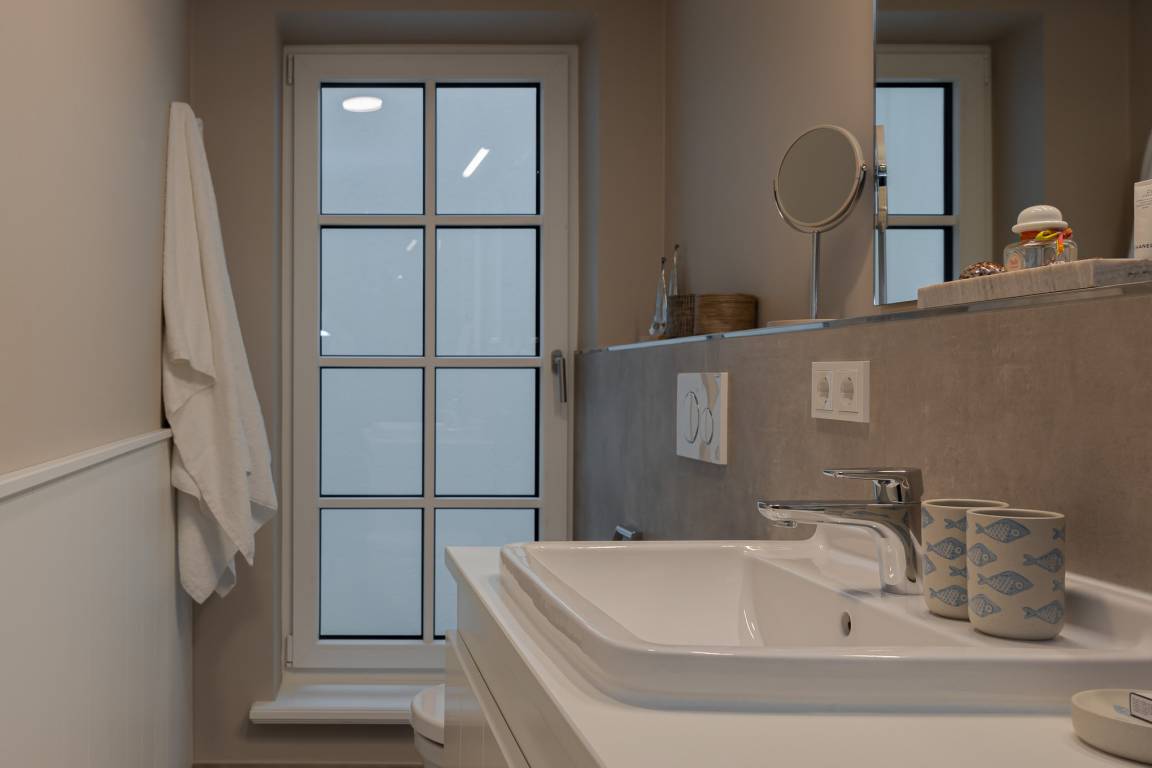 In Haus Möhre sich zudem ein geräumiges Schlafzimmer mit bodentiefen Fenstern. Das große und gemütliche Boxspringbett von Dieter Knoll lädt nach einem langen Tag am Strand und weiten Spaziergängen zum Erholen ein. Ihre Kleidung findet genügend Platz in der geschreinerten Schrankwand. Neben dem Schlafzimmer befindet sich ein geräumiges und helles Badezimmer mit Tageslicht, Dusche und WC. Das Tageslicht und die hellen Natursteinfliesen bringen die Cozy Sylt Vibes auch ins Badezimmer. Ebenso gibt es einen kleinen Hauswirtschaftsraum mit Waschmaschine und Trockner.