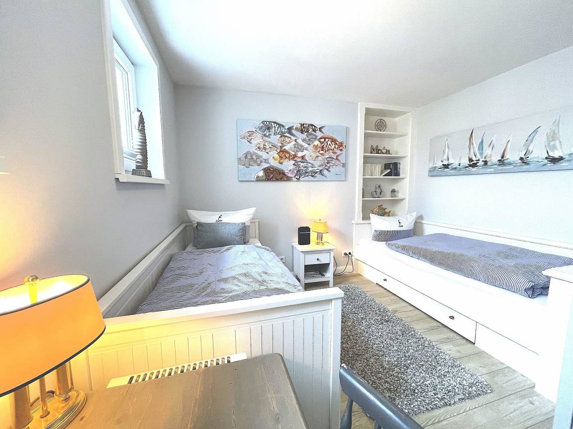 Das Masterschlafzimmer mit Doppelbett und TV nach Westen ausgerichtet ist und sehr großzügig. Das kleine Schlafzimmer mit 2 Einzelbetten ideal für die Belegung einer 3. Person oder 2 Kindern.