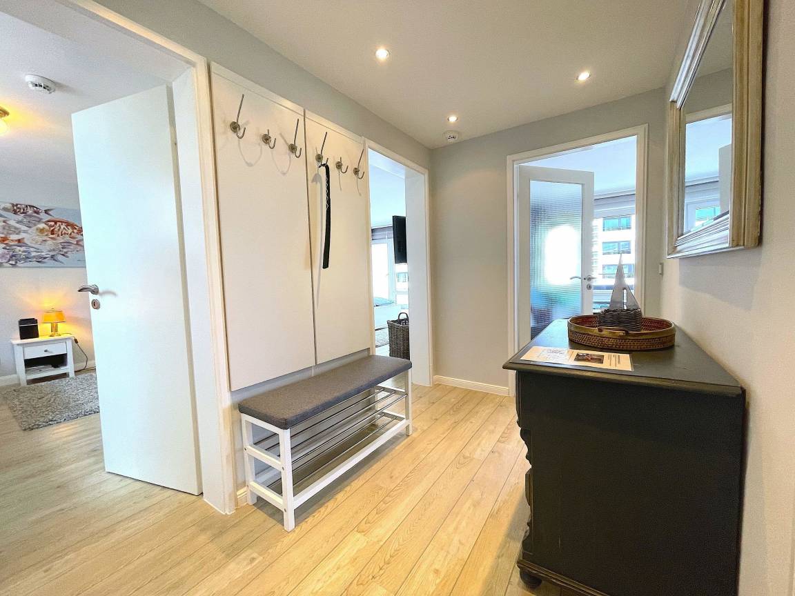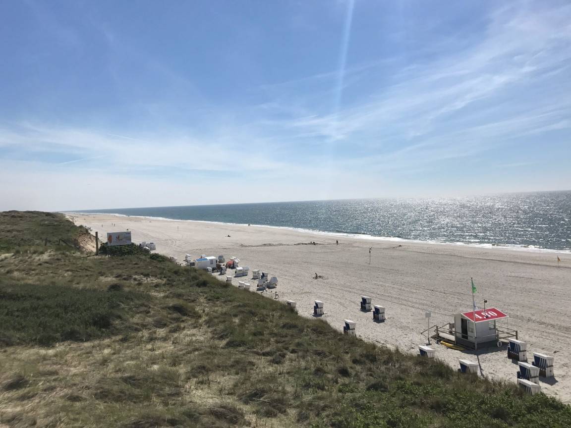 Mitten drin - 50 Meter vom Strandübergang Sylter Welle entfernt, liegt diese schöne, geschmackvoll eingerichtete 3-Zimmerwohnung mit 2 nach Westen ausgerichteten Balkonen. Somit haben Sie aus Wohn- und Schlafzimmer den Blick in Richtung Meer und Strand.