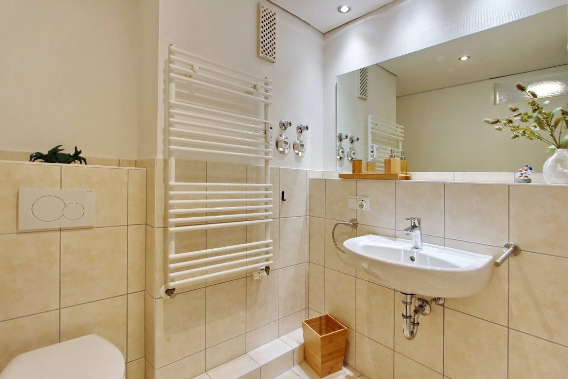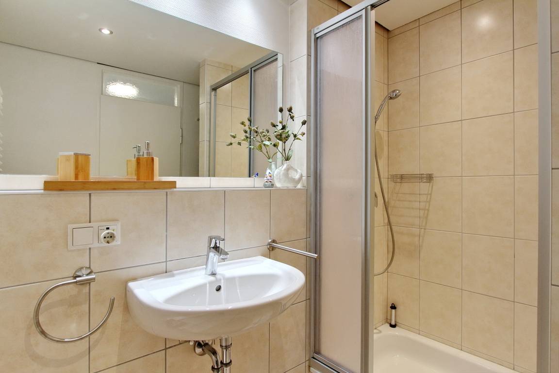 Im Flur befindet sich eine praktische Einbauküche mit Cerankochfeld und Mikrowelle – ideal für die Selbstversorgung. Das zeitlose Badezimmer ist mit Dusche und Handtuchtrockner ausgestattet.
