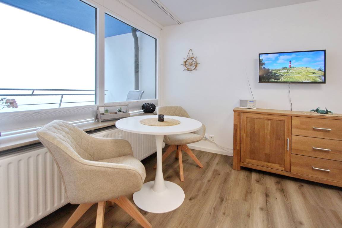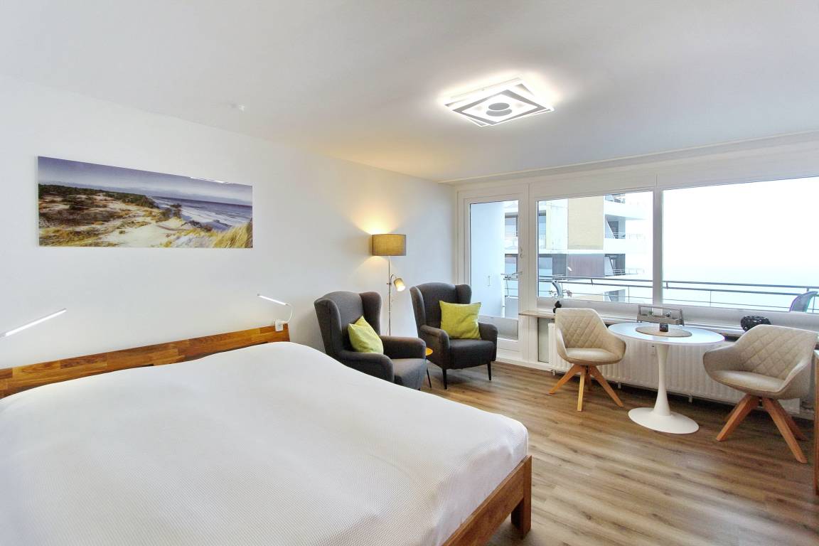 Diese stilvoll eingerichtete Einzimmerwohnung in der 9. Etage des Hauses Sylter Welle bietet einen atemberaubenden Panoramablick auf den Strand und die endlose Weite der Nordsee. Vom Westbalkon aus genießen Sie traumhafte Sonnenuntergänge und direkten Blick auf die Strandpromenade – ideal für entspannte Abende mit Meeresrauschen.
