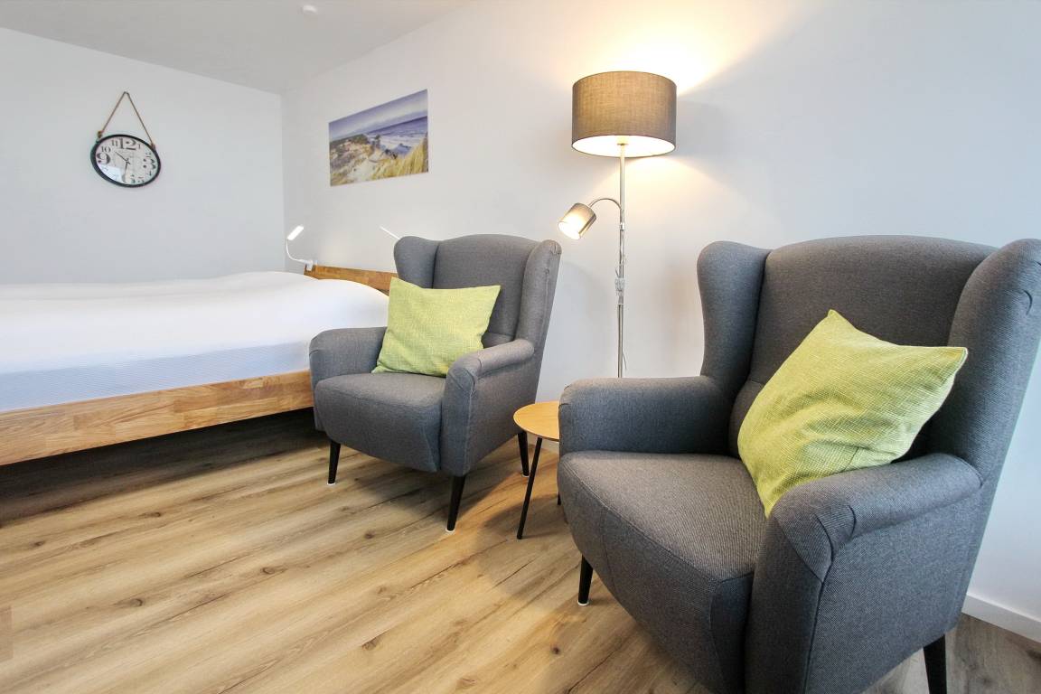 Der Wohn- und Schlafbereich, Ende 2025 aufwendig renoviert, präsentiert sich modern, freundlich und harmonisch abgestimmt: Ein hochwertiges Holzbett, zwei gemütliche Ohrensessel mit farbigen Akzenten ein gemütlicher Essplatz mit zwei komfortablen Polsterstühlen schaffen eine einladende Atmosphäre. Warme Holzelemente, stilvoll ausgewählte Dekoration und ein Designboden in Holzoptik setzen zusätzliche Wohlfühlakzente.
