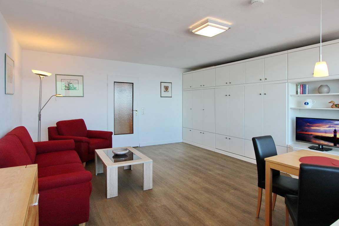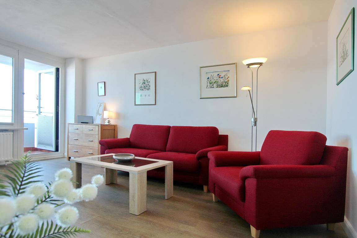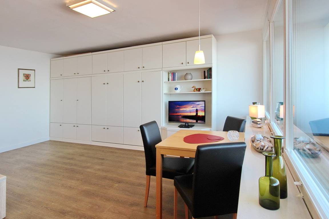 Einzimmerwohnung in der 8. Etage im Haus Metropol mit herrlichem Blick über den Strand und das Meer. Der kombinierte Wohn-/Schlafraum mit vorgelagertem Westbalkon (inkl. Loungemöbeln) verfügt über ein Doppelschrankbett, einen Essplatz am Fenster mit 3 Stühlen sowie ein bequemes, großes Sofa und einen Fernsehsessel. Laminatboden wurde in der ganzen Wohnung verlegt. Das Badezimmer mit Dusche hat einen beheizten Handtuchtrockner und vor allem viel Stauraum und Abstellfläche für ihre persönlichen Dinge. In der separaten Küche mit Geschirrspüler, Cerankochfeld, Mikrowelle und Backofen können sie sich selbst verpflegen. Zur technischen Ausstattung dieser Nichtraucherwohnung gehört: ein Flachbildfernseher, eine Sony Bluetoothanlage mit CD Player. Ein freies WLAN Netzwerk (WEG Haus Metropol - Passwortfrei - ohne Gewähr) steht ihnen kostenfrei zur Verfügung. Wohnungsgröße: ca. 42 m².