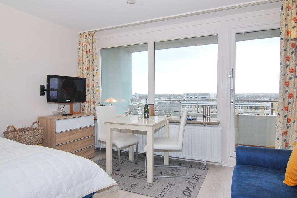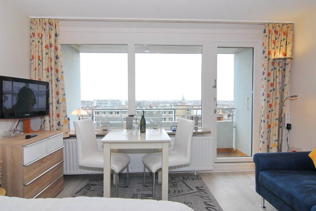Hübsche 1-Zimmer-Ferienwohnung mit Inselweitblick im 6. OG, ca. 30 m², - Neues Kurzentrum "Haus Metropol"; Wohn-/ Schlafzimmer mit Doppelbett ( 160x200 ), Eßplatz am Fenster, Couch und Sessel, Flat-TV, Radio, W-Lan (ohne Gewähr), sonniger Ostbalkon mit Blick über die Insel. Schicke Küchenzeile mit Geschirrspüler, Duschbad/WC mit großer, begehbarer Dusche. Nichtraucherwohnung. Tierhaltung ist nicht gestattet. Bettwäsche und Handtücher sind zur Anreise aufgezogen. Ein PKW-Stellplatz kann kostenpflichtig zugebucht werden.