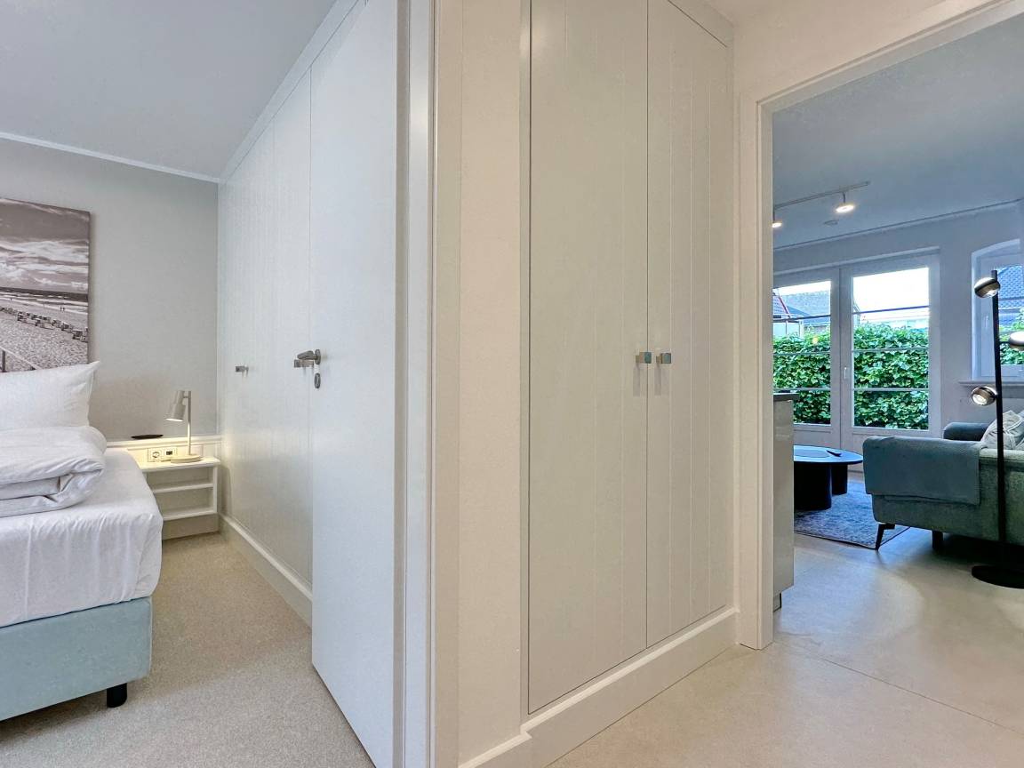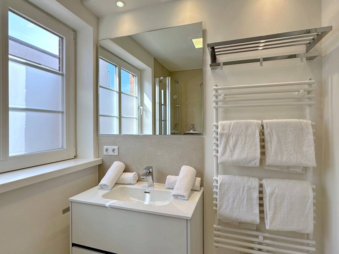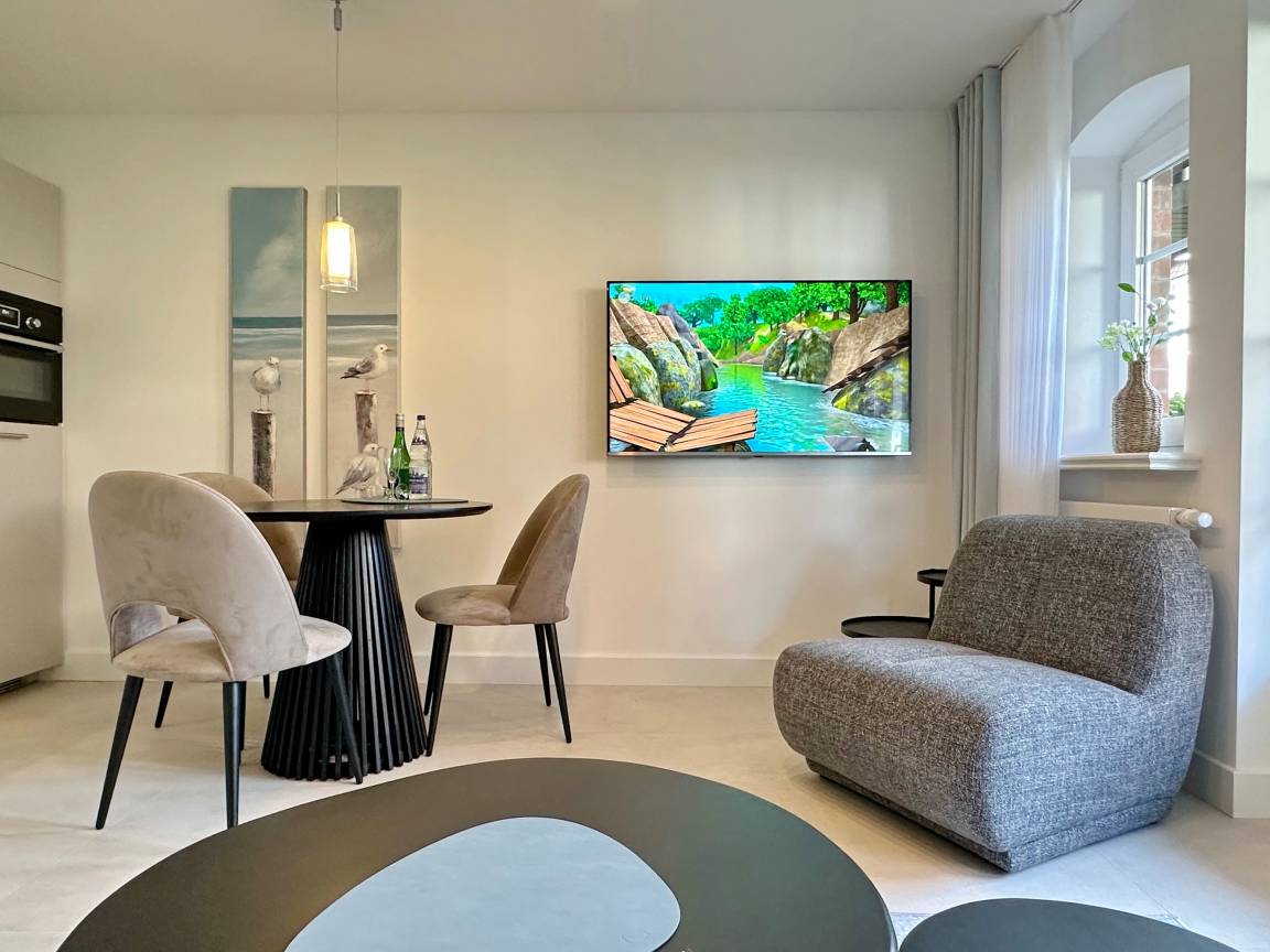 Die Wohnanlage "Olympia" bietet eine zentrale Lage in kurzer Entfernung zur Promenade, dem Badestrand und dem Meer. Auch die Fußgängerzone ist nur wenige Gehminuten entfernt. Die 2-Zimmer-Wohnung wurde im Jahr 2025 renoviert und ist für 2 Personen geeignet. Sie hat eine Größe von ca. 43 m² und besteht aus einem Wohn- und Esszimmer mit Couchecke, Essplatz und integrierter Küche. Die Küche ist mit einem Induktionskochfeld, einem Geschirrspüler und einer Mikrowelle mit Grillfunktion ausgestattet. Vom Wohnzimmer aus gelangt man auf die geschützte und möblierte Südterrasse. Im Schlafzimmer befindet sich ein Box-Spring-Doppelbett, Einbauschränke und ein weiterer Flat-TV. Das moderne Duschbad verfügt über ein Fenster. Im Dielenbereich befinden sich Einbauschränke und eine Garderobe für Jacken und andere Dinge. WLAN steht zur Verfügung, jedoch ohne Gewähr. Das Mitbringen von Haustieren und das Rauchen sind nicht gestattet. Bei Anreise sind Bettwäsche und Handtücher bereits aufgezogen. Die Wohnanlage verfügt über einen Schwimmbad- und Saunabereich sowie einen zusätzlichen Wellnessbereich mit finnischer Sauna, Dampfsauna und Ruhebereich. Fahrzeuge können gegen Gebühr und vorheriger Anmeldung in der Tiefgarage abgestellt werden. Eine Waschmaschine und ein Trockner stehen kostenfrei zur Verfügung. Für Fahrräder gibt es einen Abstellbereich in der Garage.