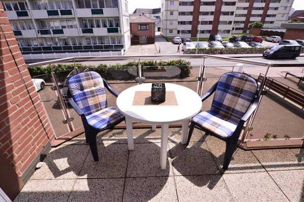 Komfortable 2-Zimmer-Ferienwohnung auf einer Ebene, ca. 53 qm in der 1. Etage zur Ostseite mit Ostloggia (Morgensonne, mit Balkonmöbeln und Auflagen) für max. 3 Personen.