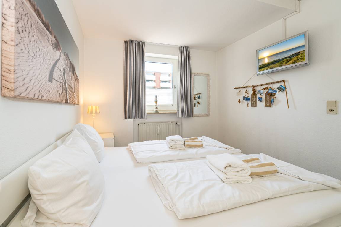 Das vom Wohnzimmer begehbare Schlafzimmer hat ein gutes Doppelbett mit zwei Einzelmatratzen (0,90 x 2,00 m), einen Kleiderschrank und zwei Nachttische.