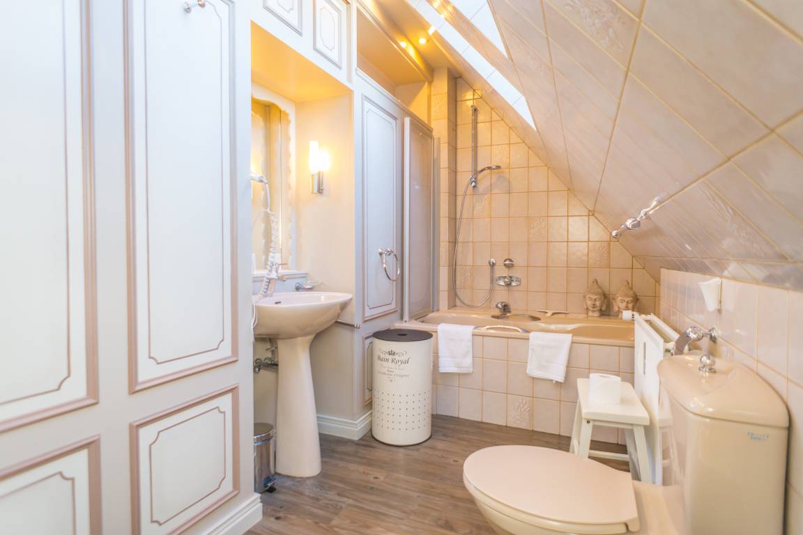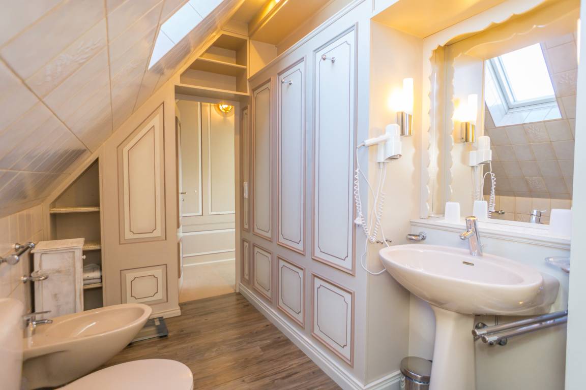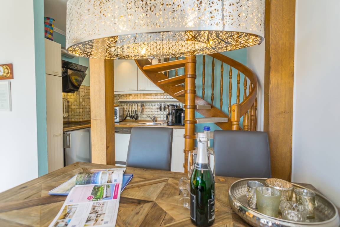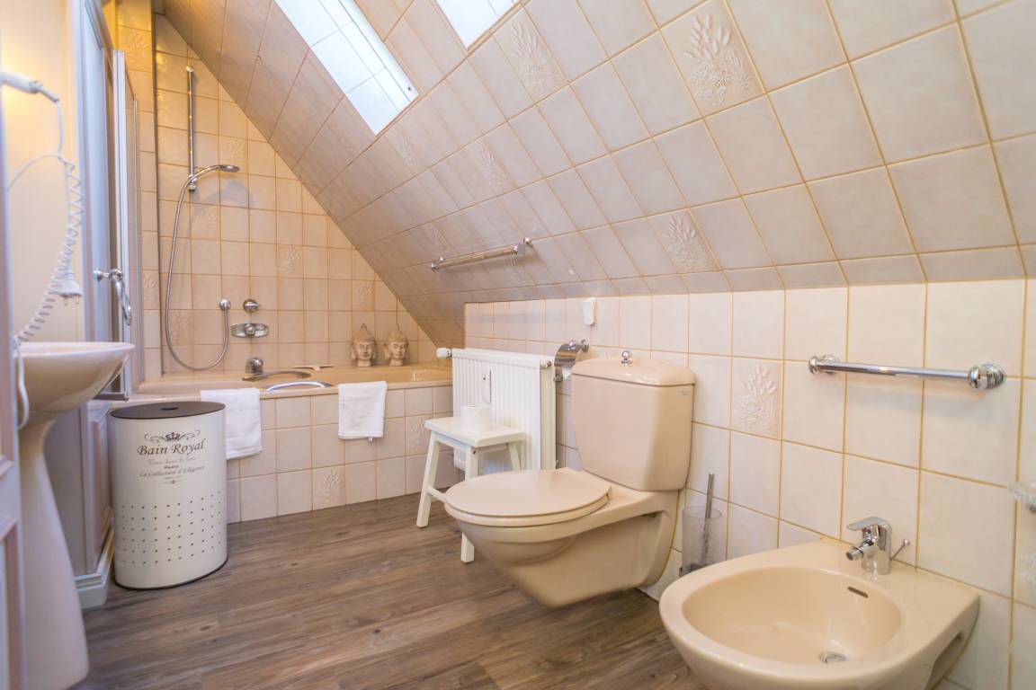 Das Schlafzimmer ist mit einem Doppelbett (Liegefläche 180 x 200 cm, bestehend aus zwei Einzelmatratzen) eingerichtet und sorgt so für erholsamen Schlaf. Über eine Treppe gelangen Sie in das Dachgeschoss, wo ein weiteres, elegant gestaltetes Badezimmer mit Badewanne, WC, Bidet und Waschtisch auf Sie wartet.