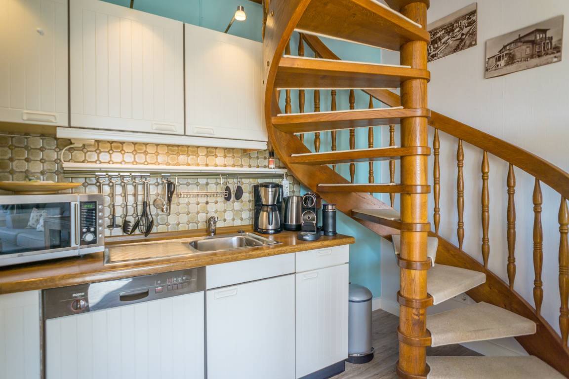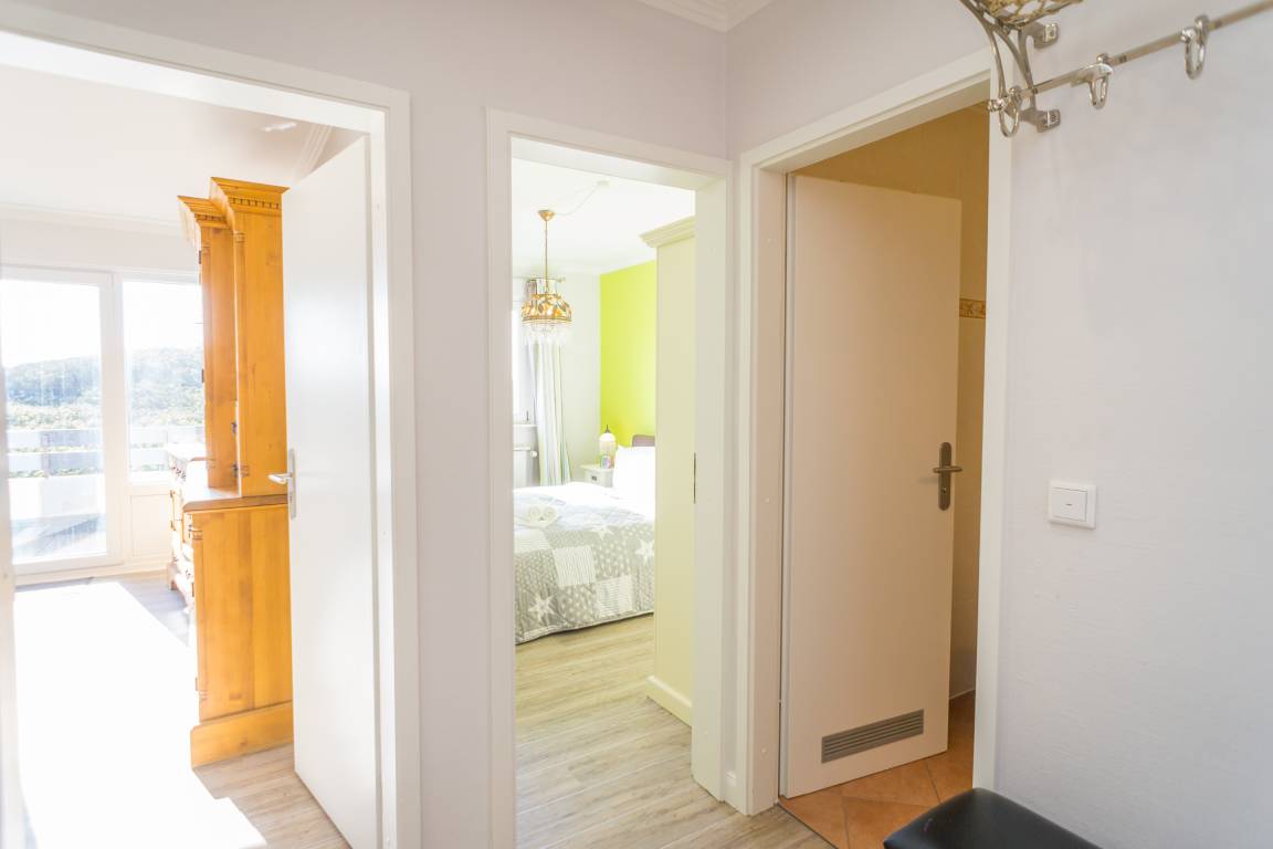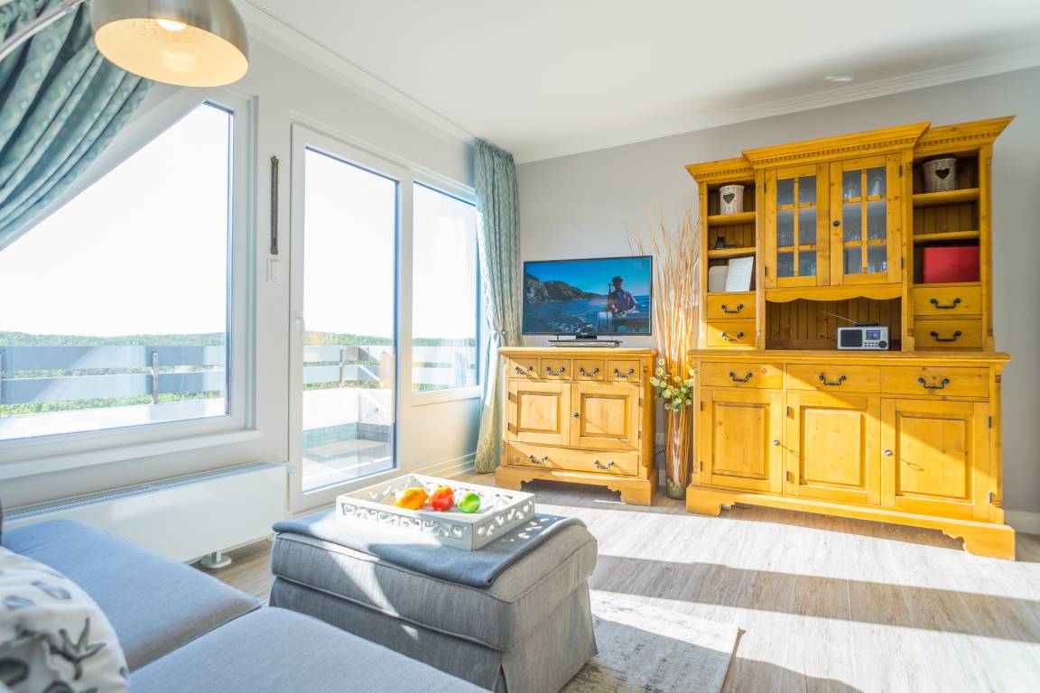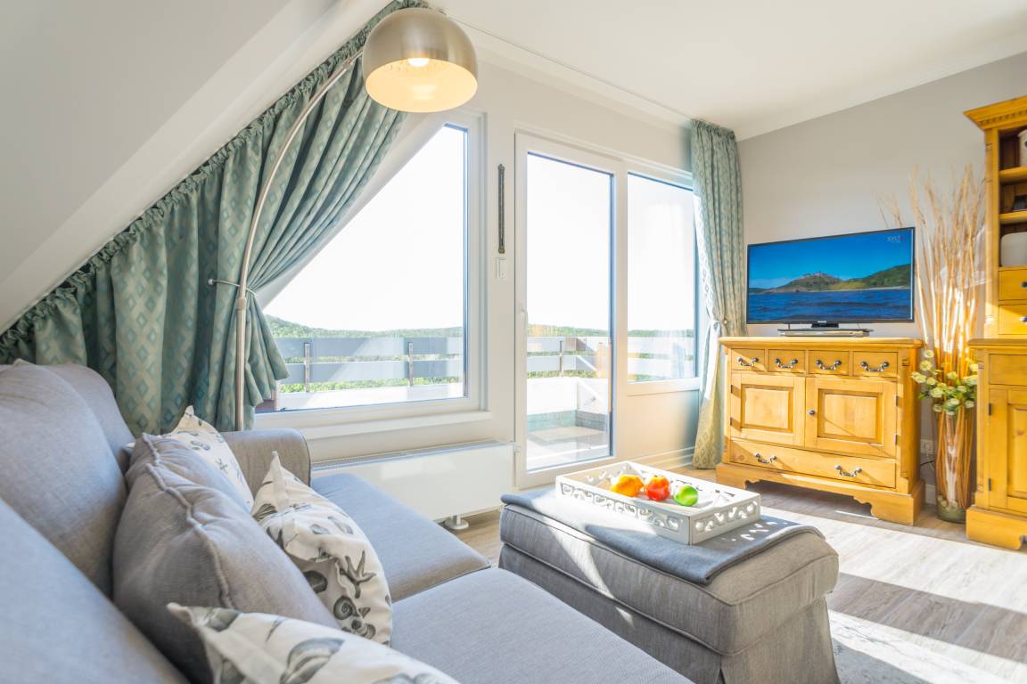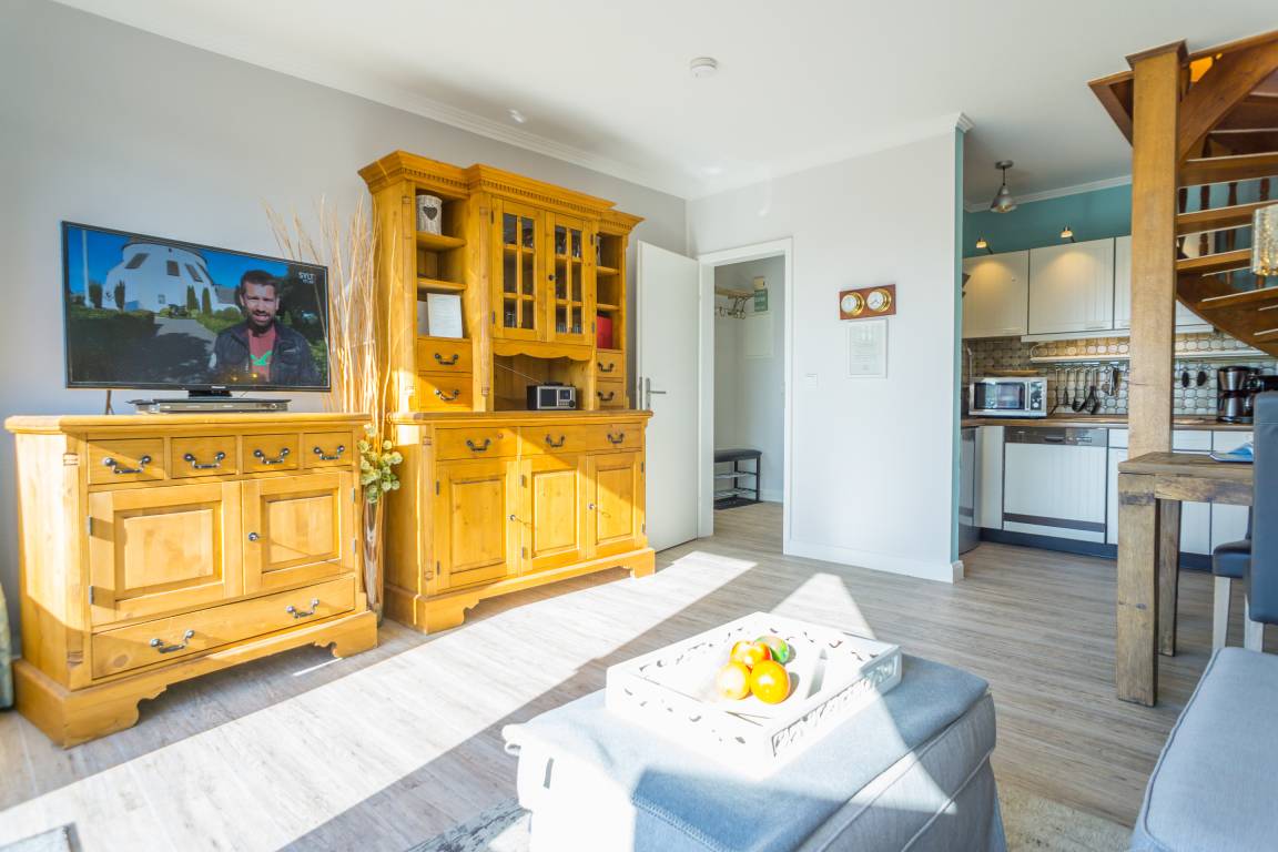 Beim Betreten der Wohnung gelangen Sie über einen einladenden Vorflur mit Garderobe in den offenen Wohnbereich, das Schlafzimmer sowie in das helle Duschbad/WC. Der Wohnbereich besticht durch ein komfortables 3-Sitzer-Sofa, einen separaten Essplatz sowie einen Kabel-Flachbild-TV, ergänzt durch Radio, Telefon und WLAN. Von hier aus haben Sie direkten Zugang zum Balkon. Die moderne, offene Kochnische ist mit einem Geschirrspüler, einer Mikrowelle, einem Ceranfeld mit vier Kochfeldern und einem Kühlschrank ausgestattet; zur Grundausstattung zählen zudem Kaffeemaschine, Wasserkocher und Toaster.
