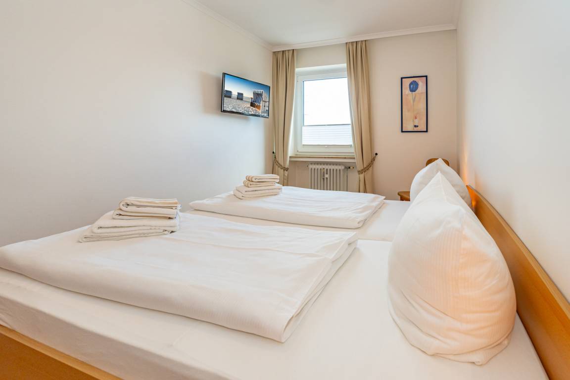 Das Schlafzimmer hat ein Doppelbett (2 m x 1,80 m) mit zwei Einzelmatratzen und einen weiteren Flachbild-TV.