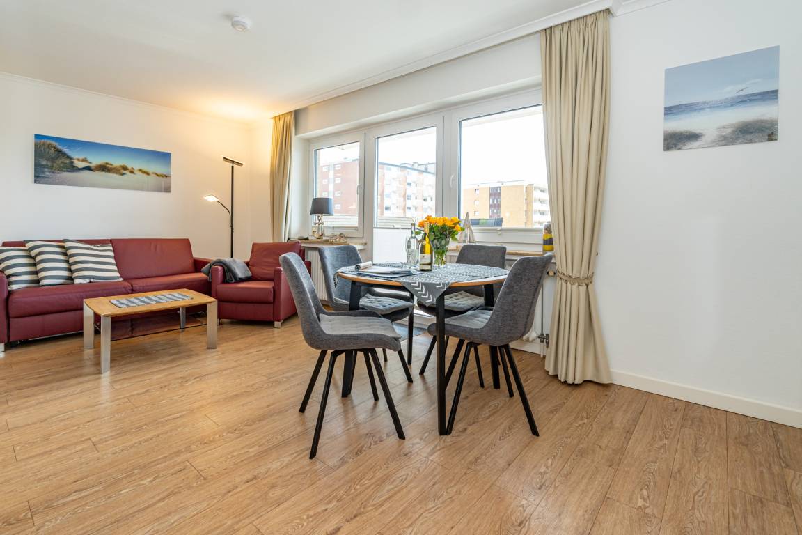 Diese gemütliche Nichtraucher-Ferienwohnung in der 3. Etage bietet auf ca. 52 qm Platz für bis zu 4 Personen. Genießen Sie sonnige Stunden auf der großzügigen Südloggia, ausgestattet mit Balkonmöbeln und Auflagen.