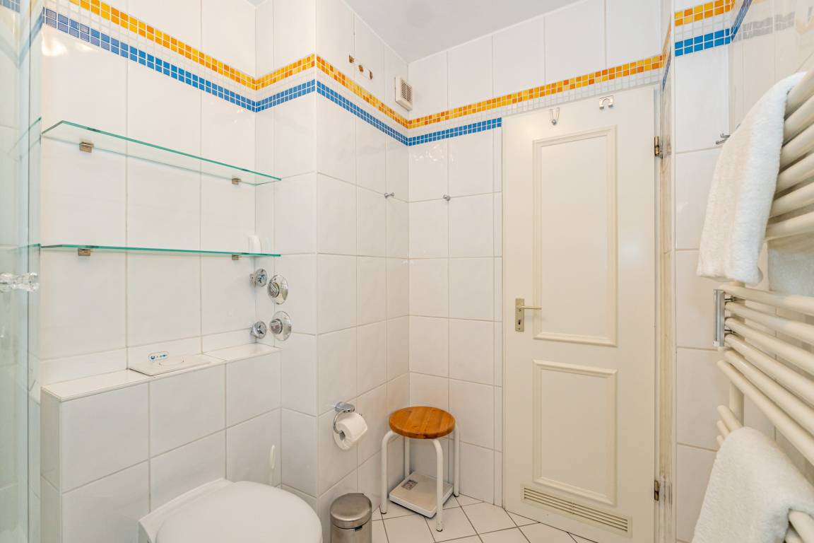 Im Bad befindet sich eine Dusche, ein Waschtisch und ein Handtuchtrockner.
