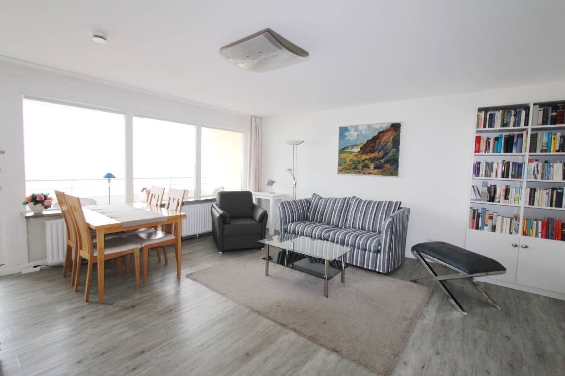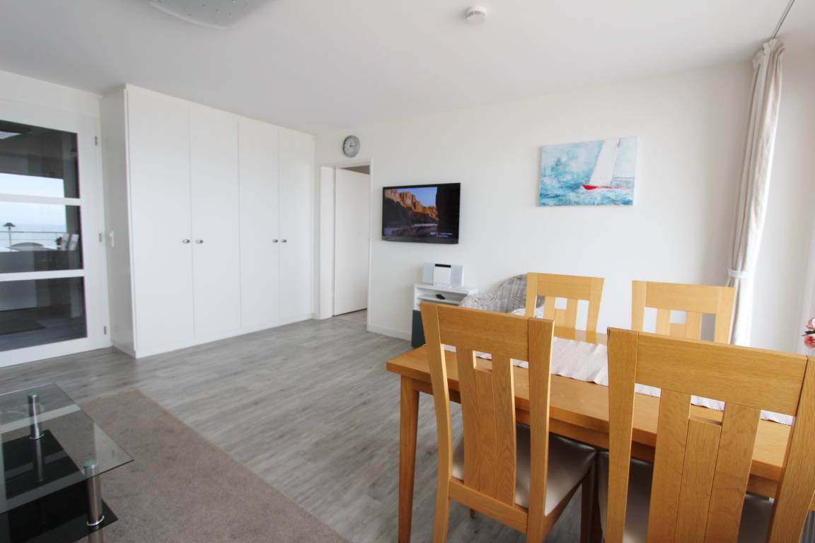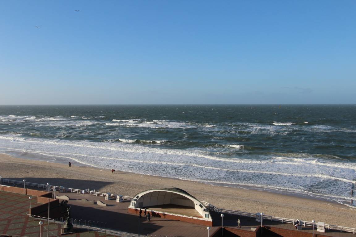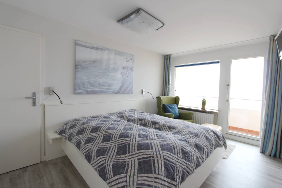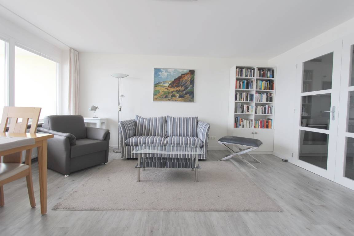 Zweizimmerwohnung in der 5. Etage im Haus Metropol mit herrlichem Blick über den Strand und die Nordsee. Das Wohnzimmer mit vorgelagertem, großzügigen Westbalkon und Balkonmöbeln verfügt über eine Sitzgruppe, einen Ledersessel, einen Korbstuhl und einen Esstisch mit 4 Stühlen. Hochwertige Tischlerarbeiten in der ganzen Wohnung bieten ihnen viel Stauraum für ihre persönlichen Dinge. Schlafzimmer mit feststehendem Doppelbett, kleiner Sitzecke und zusätzlichem Flachbildfernseher (HDTV) und Westbalkon. Die Küche befindet sich im Flur und ist ausgestattet mit Geschirrspüler, Backofen, Mikrowelle und Ceranfeld. Das Badezimmer hat eine Dusche. Im Wohnraum und Schlafzimmer wurde hochwertiger Designfussboden verlegt. Zur technischen Ausstattung dieser Nichtraucherwohnung gehört: ein Flachbildfernseher (HDTV) mit Bose Audiosystem sowie Bluetooth. Ein freies WLAN Netzwerk (WEG Haus Metropol - Passwortfrei - ohne Gewähr) steht ihnen kostenfrei zur Verfügung. Wohnungsgröße: ca. 58 m².