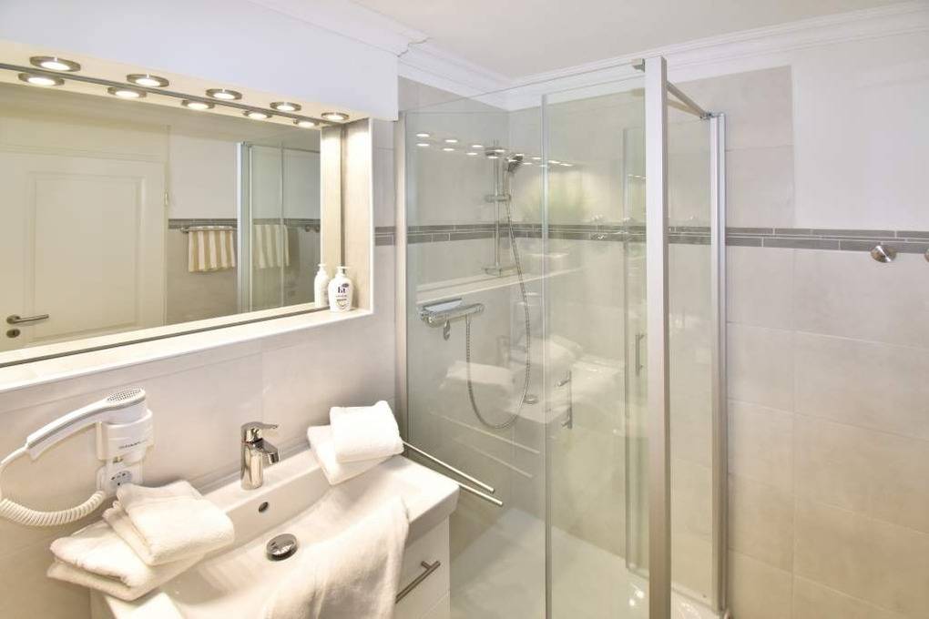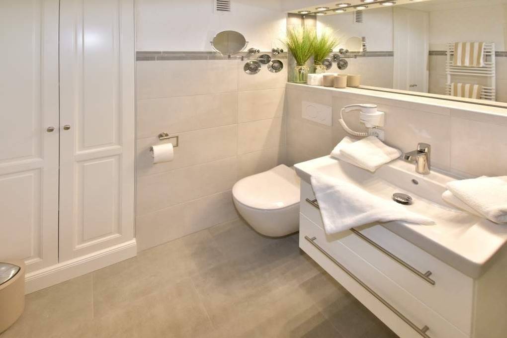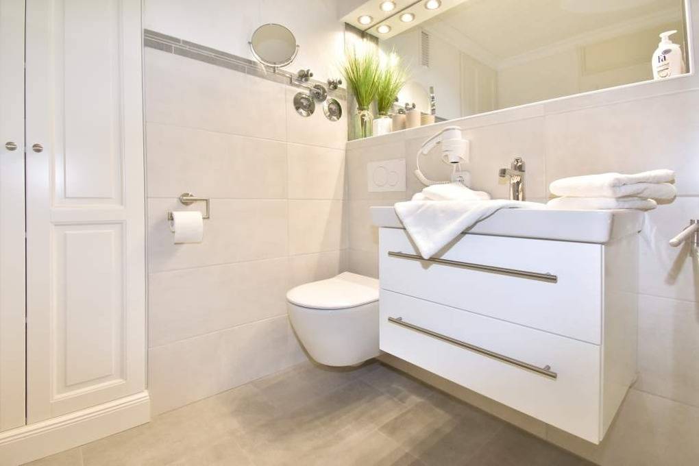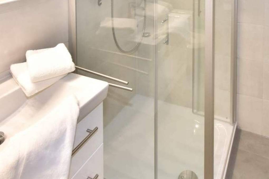 Das moderne Badezimmer lässt mit einer Dusche mit extraflachem Einstieg, Waschtisch, Handtuchtrockner, Einbauschrank, Kosmetikspiegel, Fön und WC wohl keine Wünsche offen.