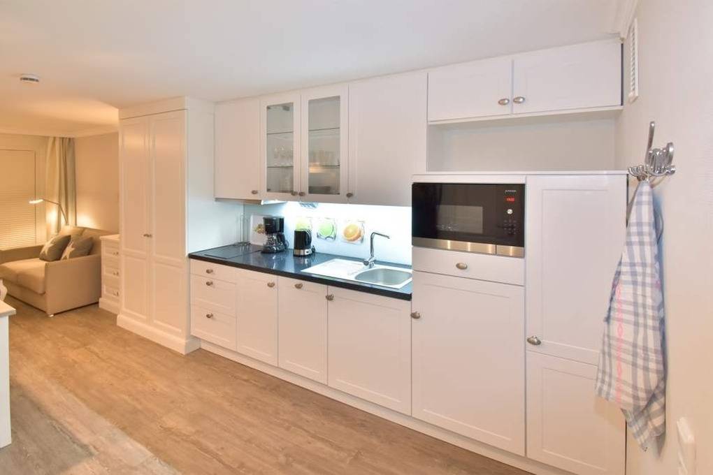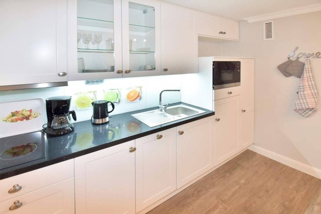 Die moderne Küchenzeile ist mit Geschirrspüler, Mikrowelle, Ceranfeld (mit 2 Kochfeldern), Granitarbeitsfläche und einem Kühlschrank mit Gefrierfach voll ausgestattet. Kaffeemaschine, Wasserkocher und Toaster sind Standard.