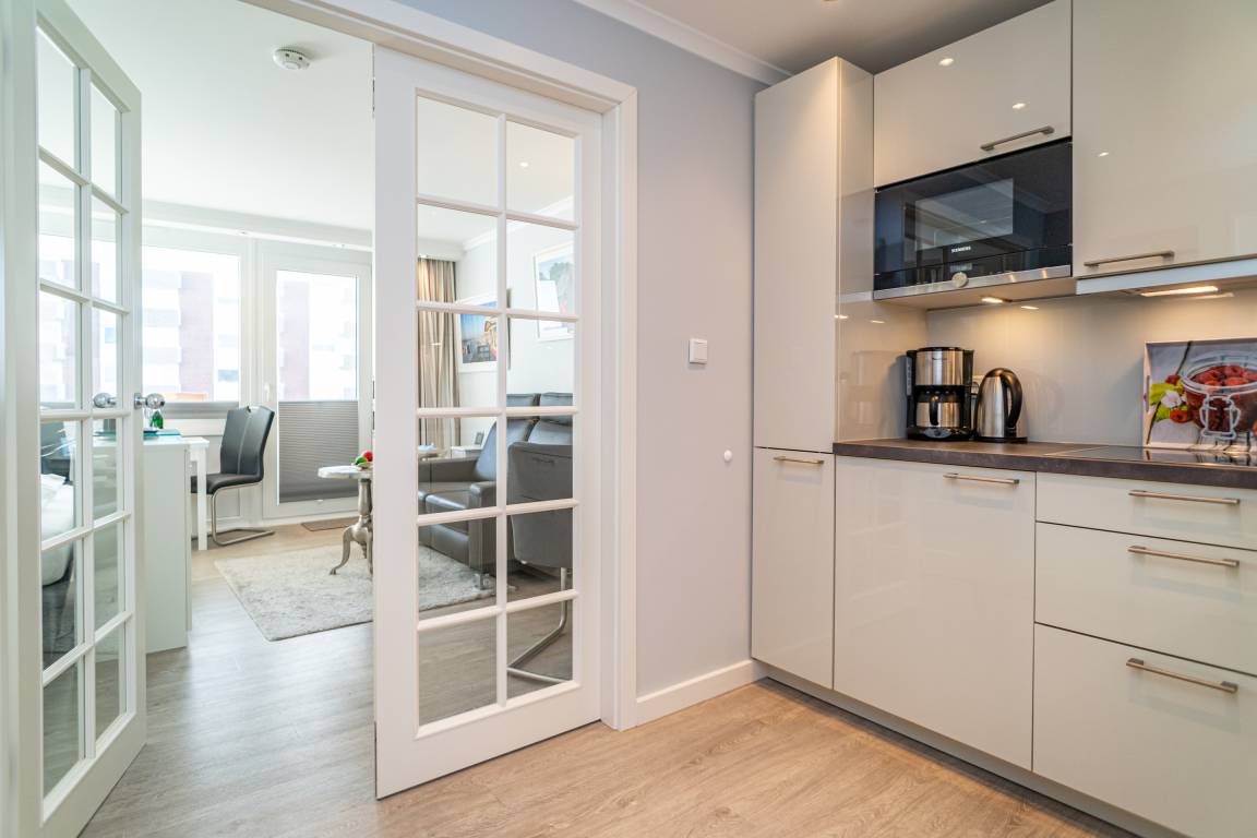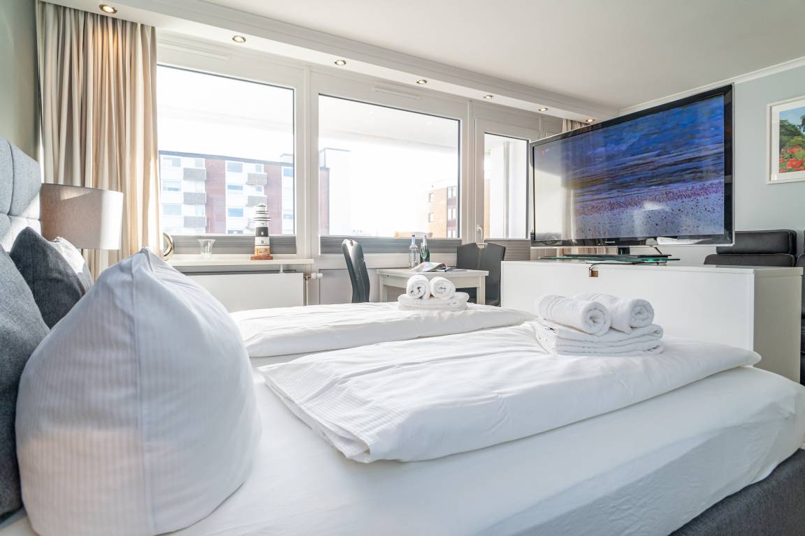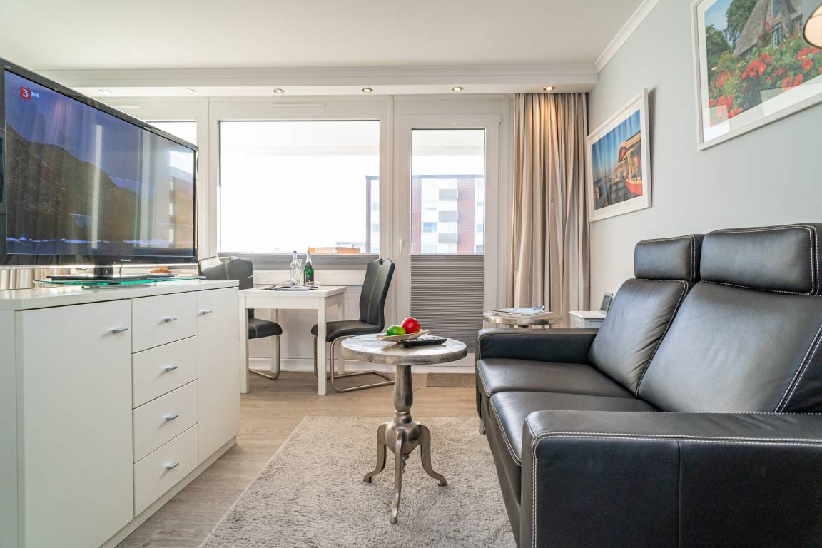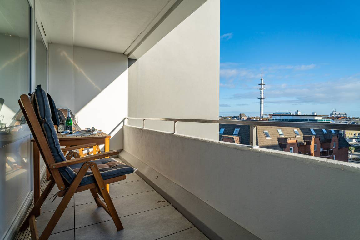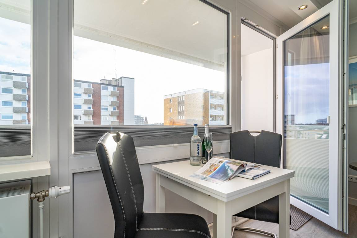Großzügige 1-Zimmer-Nichtraucher-Ferienwohnung (ca. 38 m²) in der 4. Etage zur Landseite mit Ostloggia (Morgensonne, mit Balkonmöbeln und Auflagen) für max. 2 Personen.