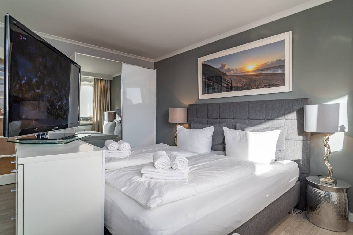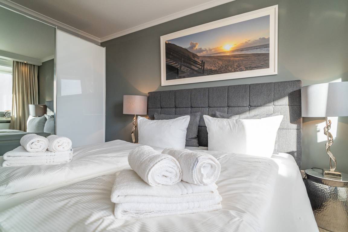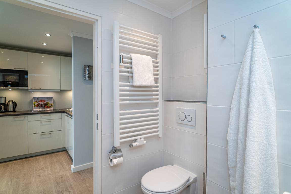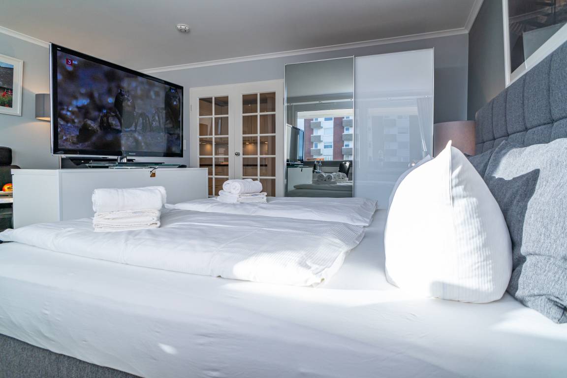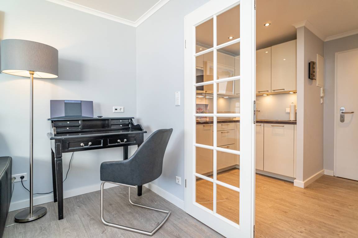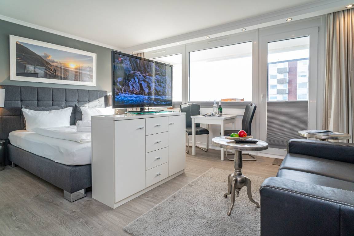 Großzügige 1-Zimmer-Nichtraucher-Ferienwohnung (ca. 38 m²) in der 4. Etage zur Landseite mit Ostloggia (Morgensonne, mit Balkonmöbeln und Auflagen) für max. 2 Personen.