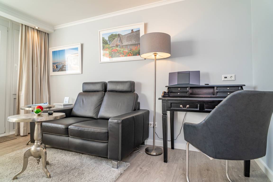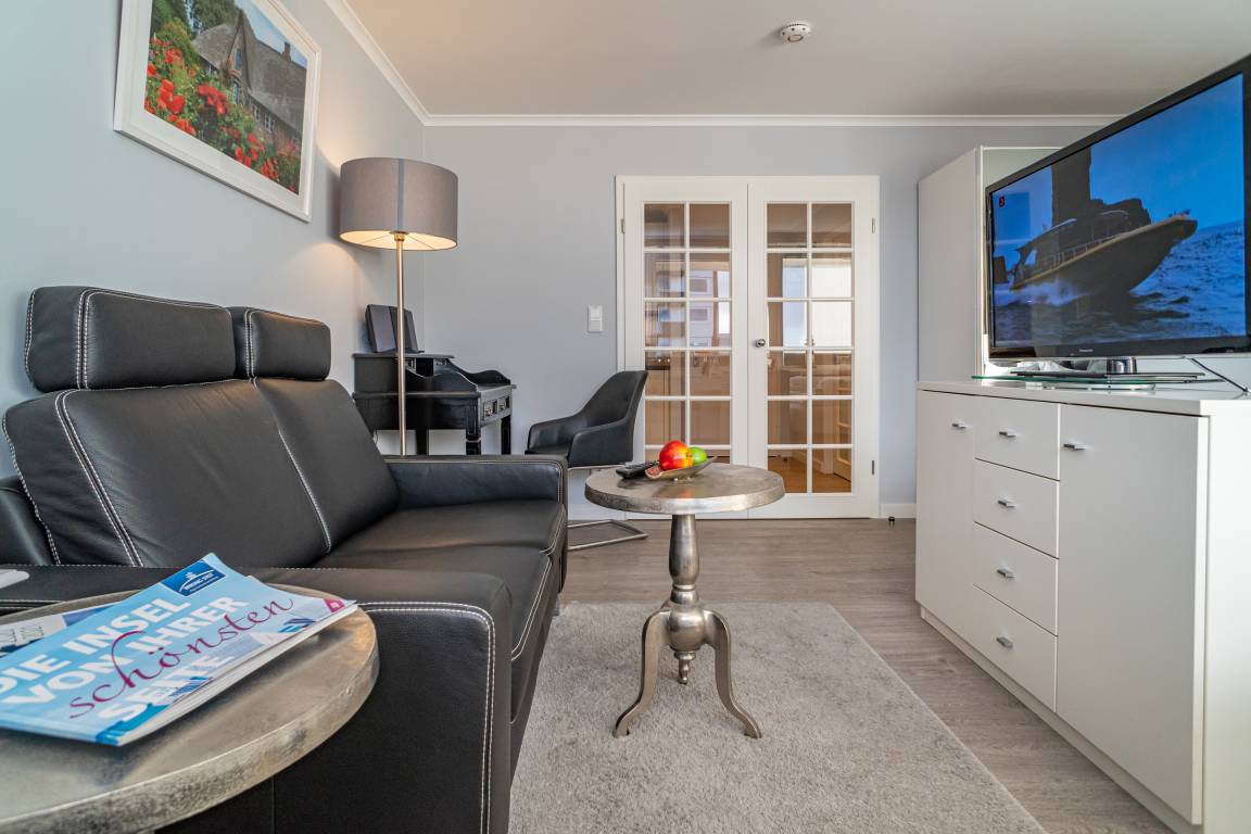 Der Wohn-/Schlafraum besteht aus einer Küchenzeile mit 4-Platten-Ceranfeld-Herd mit Backofen, Kühlschrank mit Gefrierfach und einem Geschirrspüler, Kaffeemaschine, Wasserkocher und Toaster gehören zur Grundausstattung, einer gemütlichen Sitzgarnitur, einem Essplatz, einem Doppelbett ( 180 x 200 cm), Kabel-Flachbild-TV.