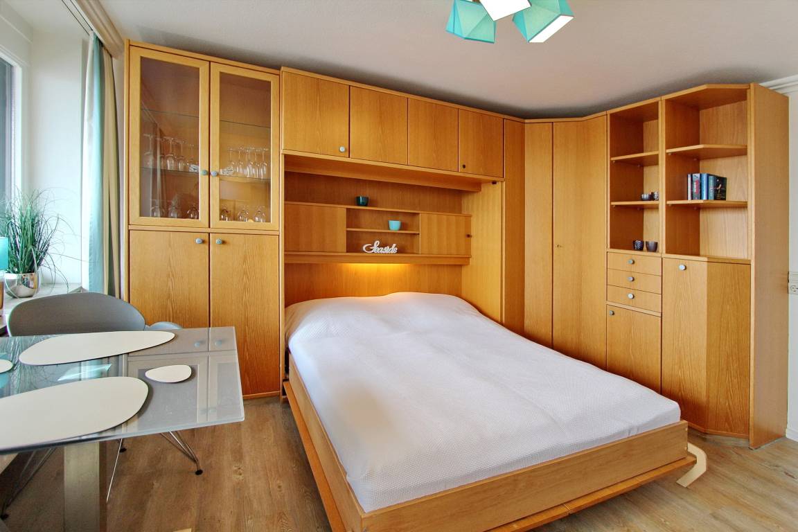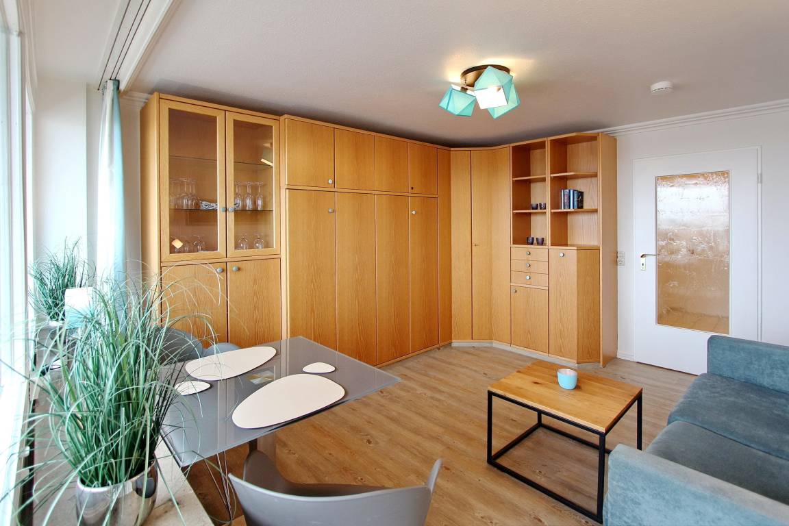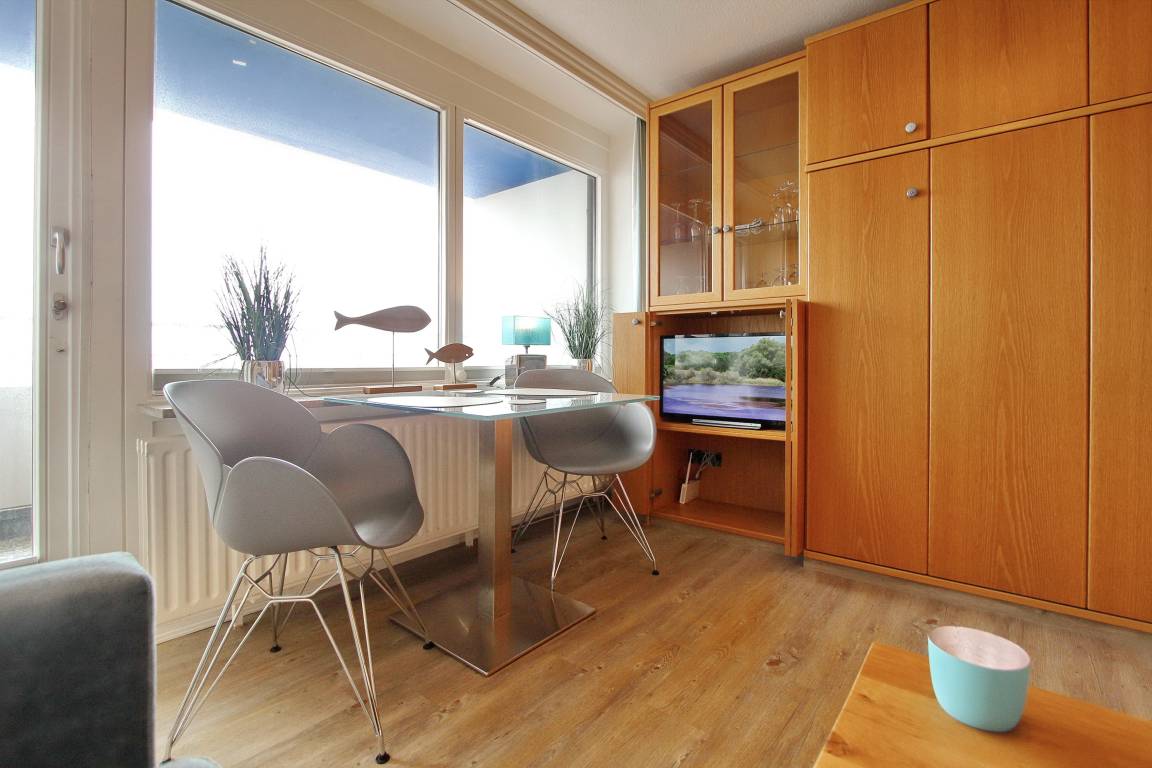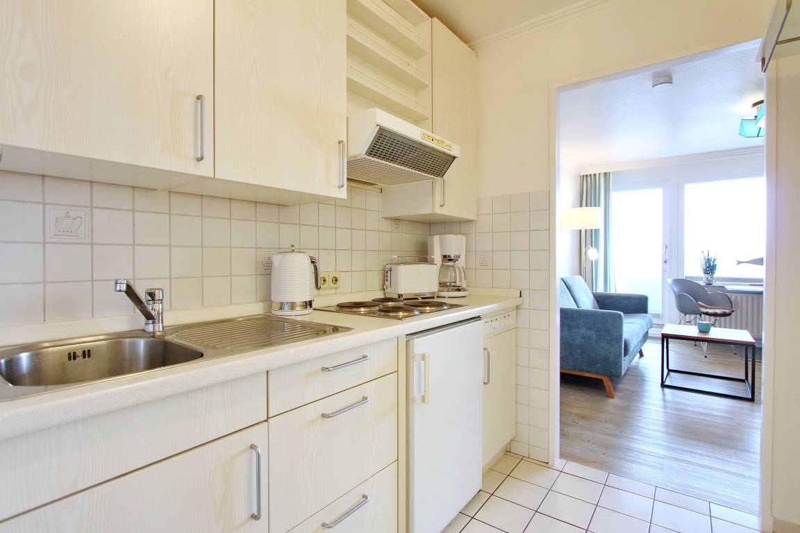 Diese Einzimmerwohnung befindet sich in der 4. Etage im Haus am Meer, nur wenige Schritte vom Strand und Meer entfernt. Der kombinierte Wohn-/Schlafraum mit vorgelagertem Ostbalkon (inkl. Balkonmöbel) verfügt über ein Doppelschrankbett, eine Couch und einen Essplatz mit 2 Stühlen. Im Badezimmer gibt es eine Dusche, einen Badezimmerhocker, einen mobilen Haltegriff, einen Fön und einen Kosmetikspiegel. Ausreichend Ablagefläche und Stauraum für ihre persönlichen Dinge ist vorhanden. Um sich während des Urlaubs selbst zu verpflegen steht ihnen im Flur eine Küchenzeile mit 4 Platten Herd, Dunstabzugshaube und zusätzlicher Nespressomaschine zur Verfügung. Zur technischen Ausstattung dieser Wohnung gehört: ein Smartfernseher von Panasonic. Den kostenfreien Zugang zum WLAN Hot Spot (WEG Haus am Meer - Passwortfrei - ohne Gewähr) können sie nutzen. Wohnungsgröße: ca. 30 m².