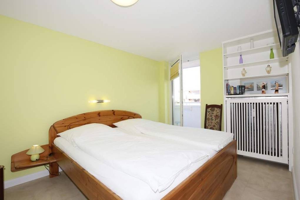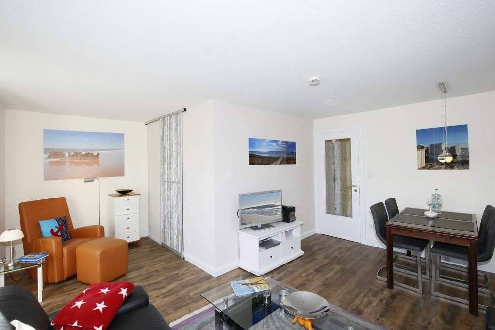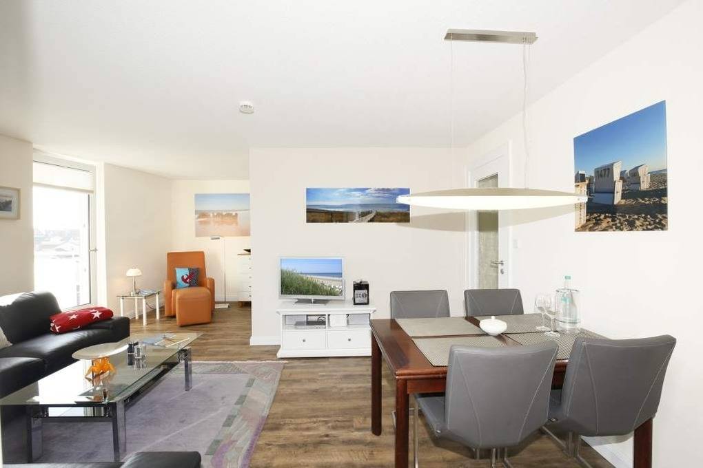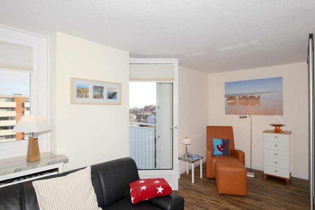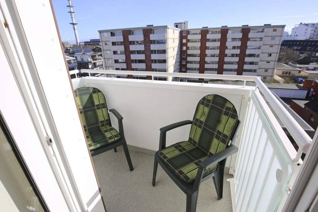 Die Ferienwohnung befindet sich in Ostlage in der 5. Etage. Sie verfügt über einen großzügigen Wohnraum mit Sitz- und Essplatz, Flat-TV, Blu-Ray-Player, HiFi-Anlage, W-Lan und Leseecke, ein geräumiges Schlafzimmer mit Doppelbett, Flachbildfernseher, Einbauschrank und Zimmersafe. Zusätzlich ist eine abgeschlossene Schlafnische mit zwei Einzelbetten vorhanden. Neue Küche mit Geschirrspüler, Mikrowelle, Backofen, Kaffeemaschine, Wasserkocher, Toaster und Nespresso-Maschine gehören zur Grundausstattung. Badezimmer mit Dusche und WC. Zur Ferienwohnung gehören zwei Balkone mit Morgensonne und Panoramablick über Westerland. Kinderreisebett und Hochstuhl sind in dieser Ferienwohnung inkl.. Das Mitbringen von Haustieren ist nicht gestattet.
