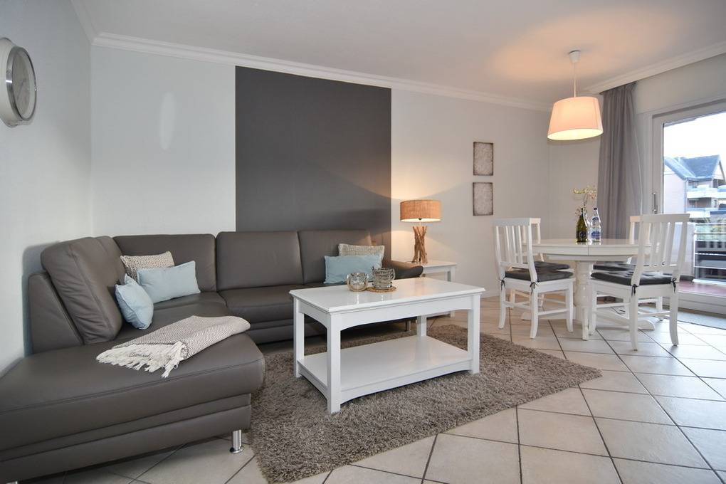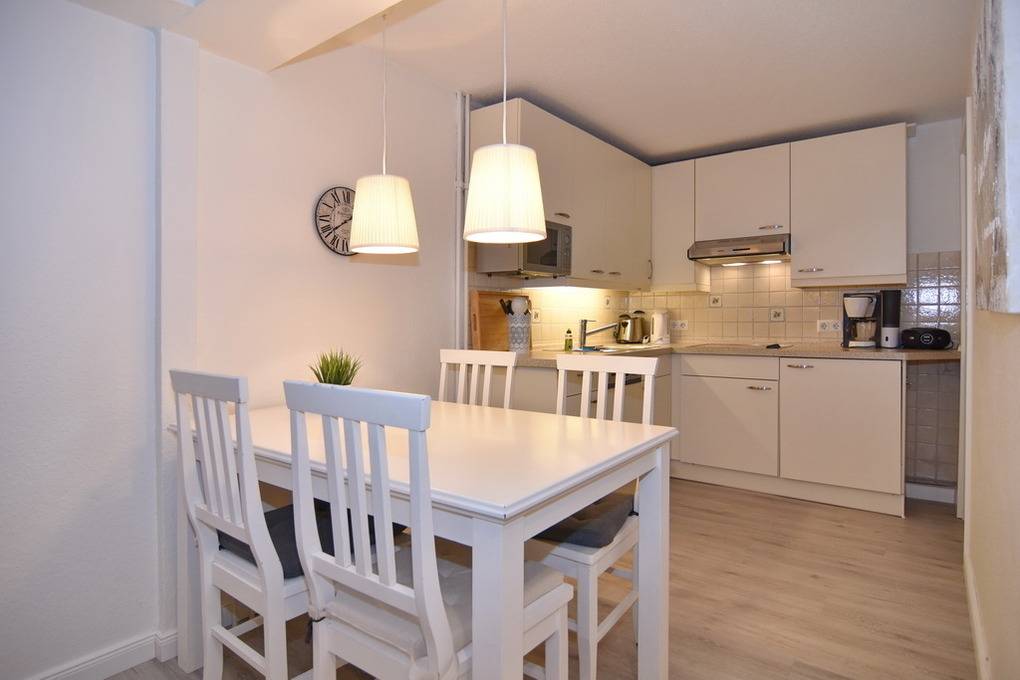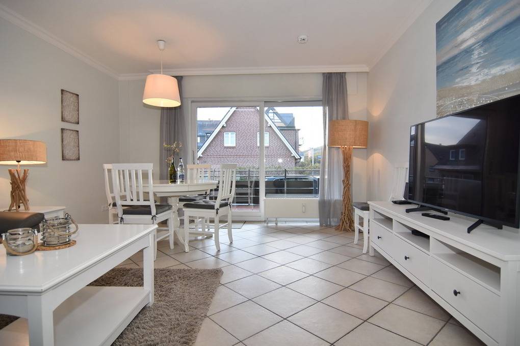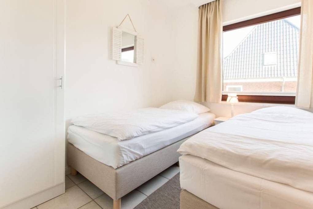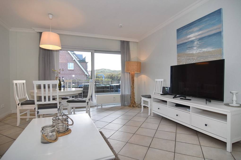 3 Zimmer Ferienwohnung, direkt hinter den Dünen im Haus Belvedere. Ca. 68m² auf 2 Ebenen, Nichtraucher Wohnung mit großem Südbalkon. EG: Wohnzimmer mit Leder-Eckcouch, Smart TV (4K UHD) und Kabelanschluss, Radio, Telefon, WLAN (Code RR), Esstisch, kleiner Flur mit Garderobe und Spiegel, Schlafzimmer mit 2 Einzelbetten (90x200). Treppe vom EG ins UG. UG: offene Küche mit Desingerfußboden und Esstisch, Herd, Geschirrspüler, Microwelle, Kühlschrank mit kl. Gefrierfach, Schlafzimmer mit Doppelbett (2x90x200) und zusätzlichem Einzelbett (90x200) Duschbad/WC mit Föhn. Tierhaltung ist nicht gestattet. Zur Wohnung gehört der Duplex-Garagenstellplatz Nr. 11. Bettwäsche und Handtücher sind zur Anreise aufgezogen! Waschmaschine/Wäschetrockner im Keller vorhanden mit Münzautomaten.