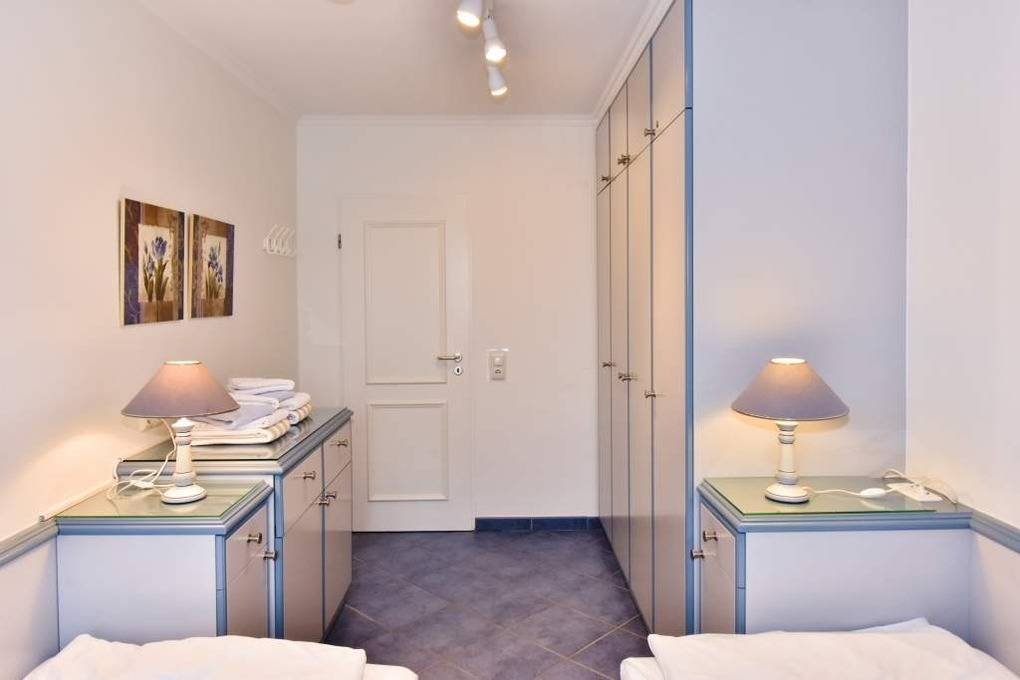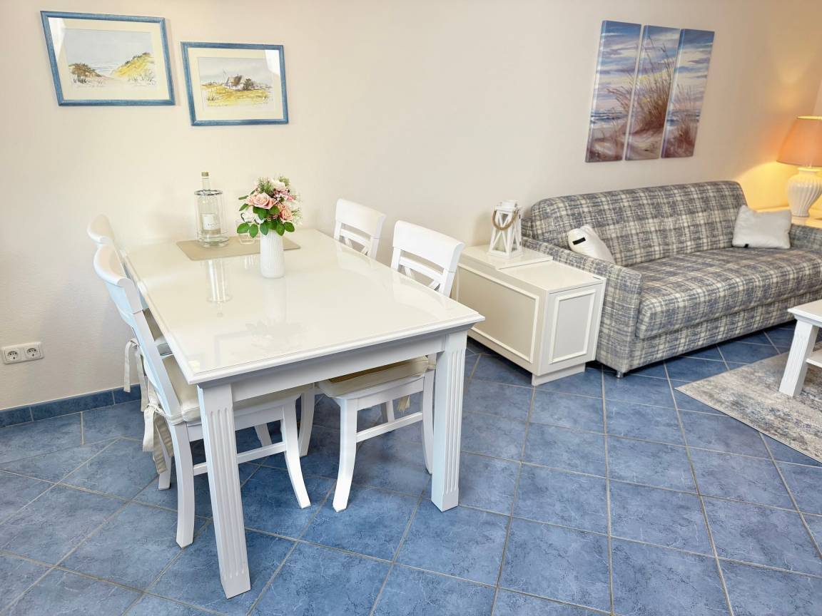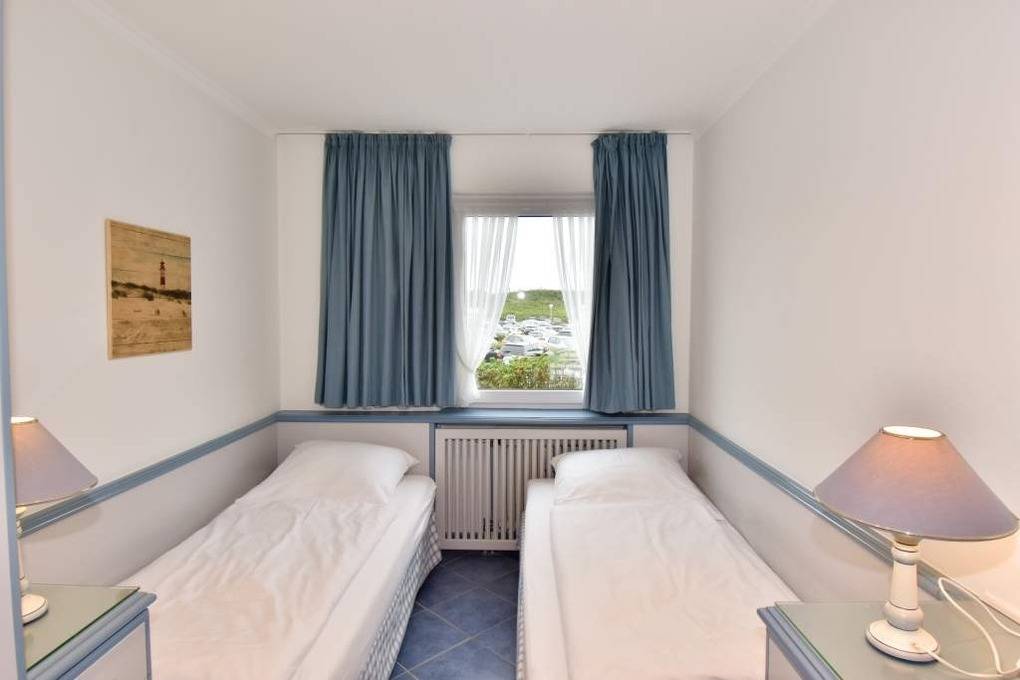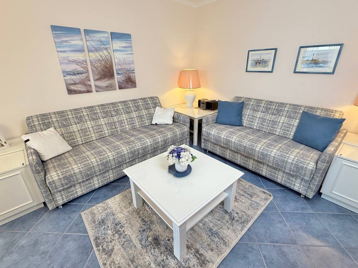Diese komfortabel ausgestattete 2-Zimmer-Nichtraucher-Ferienwohnung mit ca. 48 m² Wohnfläche befindet sich im Hochparterre (vergleichbar mit dem 1. Obergeschoss) und ist zur Westseite ausgerichtet. Sie bietet ideale Voraussetzungen für einen erholsamen Aufenthalt. Das separate Schlafzimmer ist mit zwei Einzelbetten ausgestattet. Im Wohnbereich stehen eine komfortable Doppelschlafcouch (ca. 170 × 200 cm), ein Essplatz sowie ein Kabel-Flachbild-TV zur Verfügung. Darüber hinaus sind ein Telefon mit Flatrate ins deutsche Festnetz sowie WLAN vorhanden. Die offene Küche ist vollständig ausgestattet und verfügt über einen Geschirrspüler, Backofen, Cerankochfeld sowie Kaffeemaschine, Wasserkocher und Toaster. Das moderne Duschbad mit WC rundet das Raumangebot ab.
