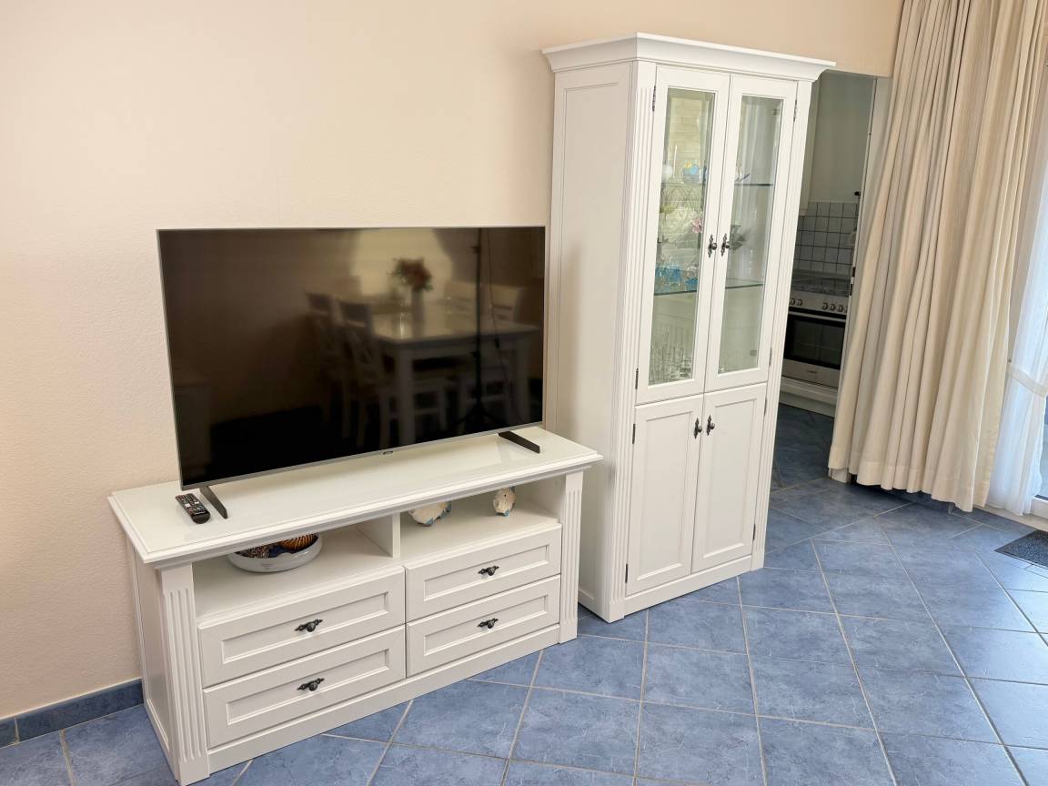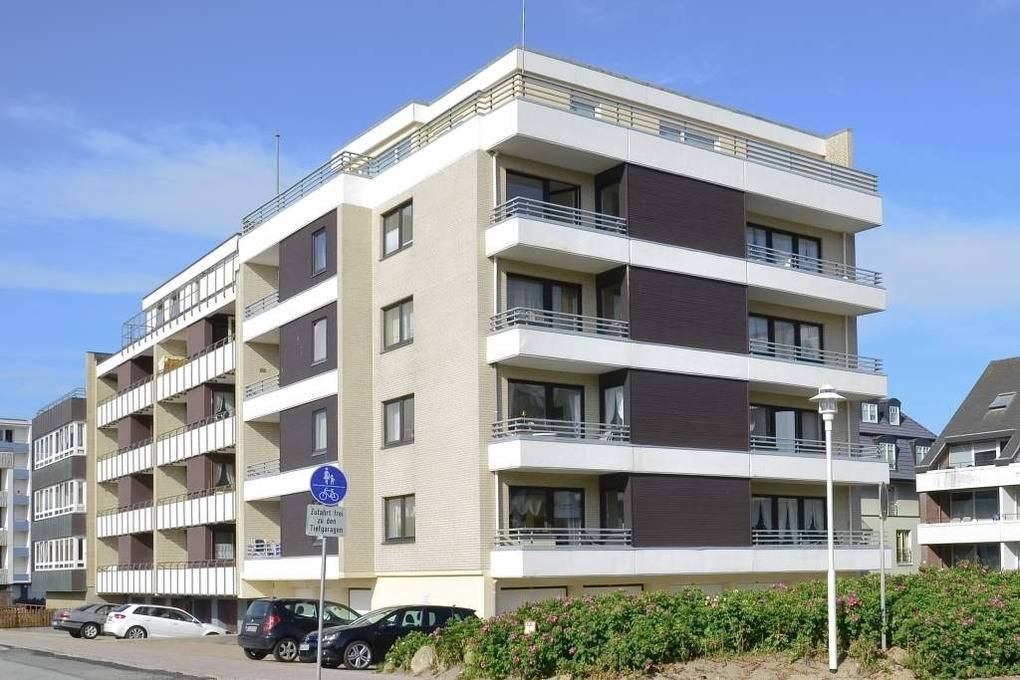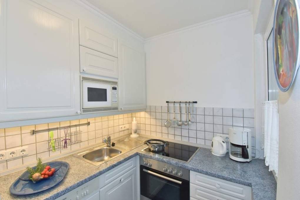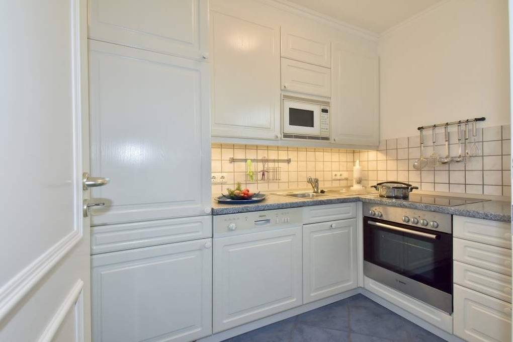 Diese komfortabel ausgestattete 2-Zimmer-Nichtraucher-Ferienwohnung mit ca. 48 m² Wohnfläche befindet sich im Hochparterre (vergleichbar mit dem 1. Obergeschoss) und ist zur Westseite ausgerichtet. Sie bietet ideale Voraussetzungen für einen erholsamen Aufenthalt. Das separate Schlafzimmer ist mit zwei Einzelbetten ausgestattet. Im Wohnbereich stehen eine komfortable Doppelschlafcouch (ca. 170 × 200 cm), ein Essplatz sowie ein Kabel-Flachbild-TV zur Verfügung. Darüber hinaus sind ein Telefon mit Flatrate ins deutsche Festnetz sowie WLAN vorhanden. Die offene Küche ist vollständig ausgestattet und verfügt über einen Geschirrspüler, Backofen, Cerankochfeld sowie Kaffeemaschine, Wasserkocher und Toaster. Das moderne Duschbad mit WC rundet das Raumangebot ab.
