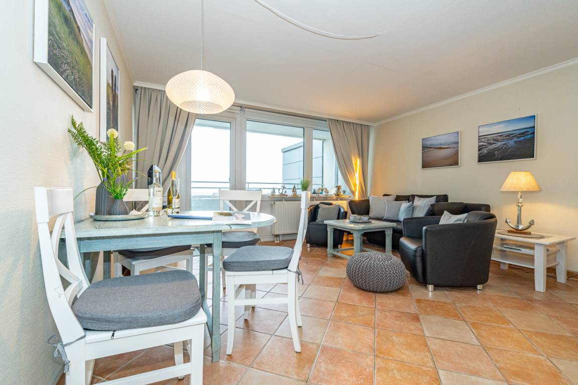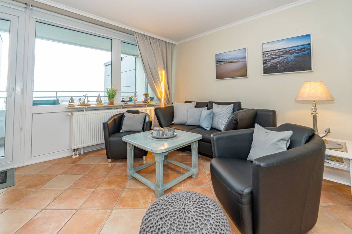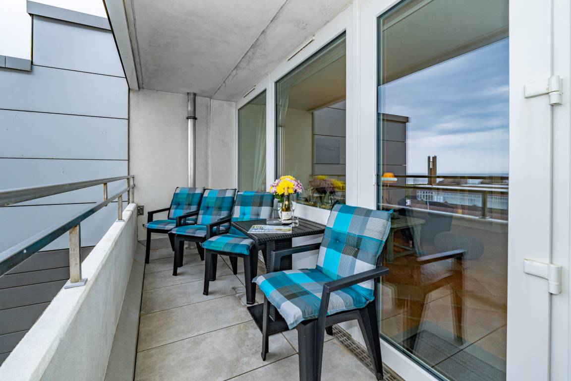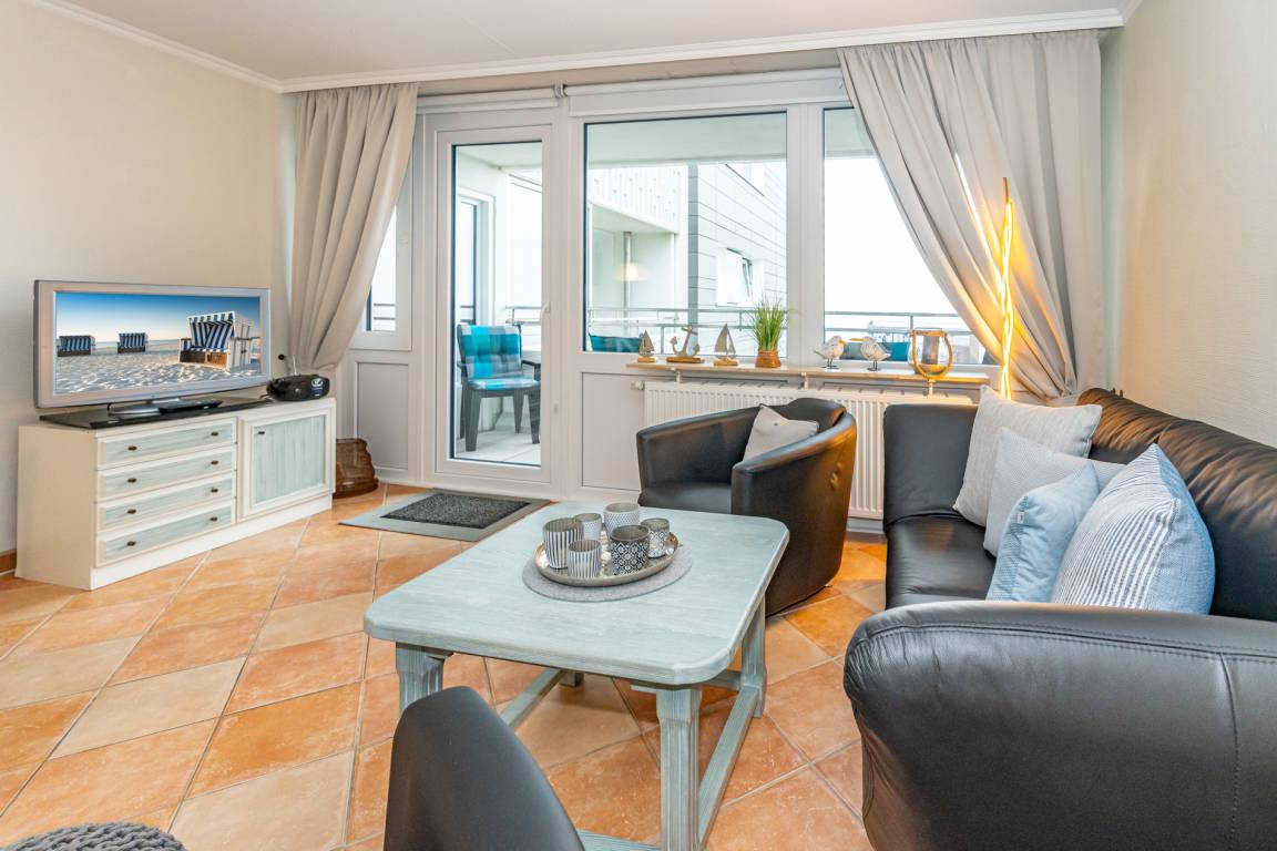 Gemütlich eingerichtete 2-Zimmer-Nichtraucher-Ferienwohnung, ca. 59 qm, in der 5. Etage zur Seeseite mit eingeschränktem Meerblick und Westloggia (Abendsonne mit Balkonmöbel und Auflagen) für 4 Personen.