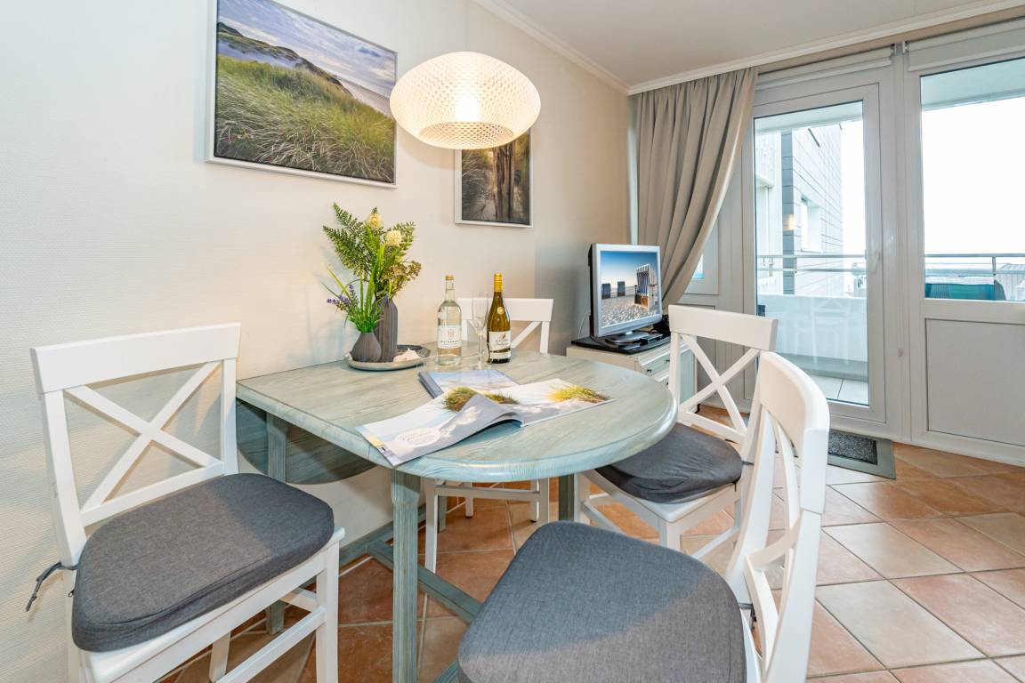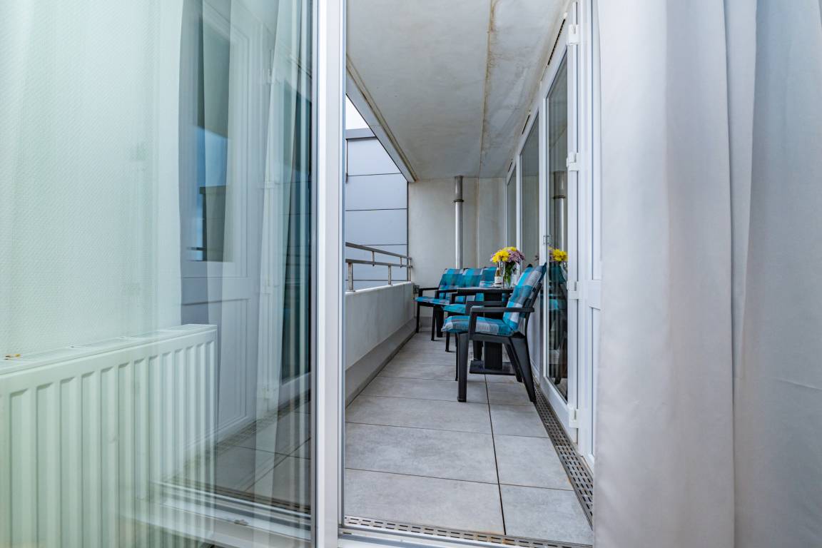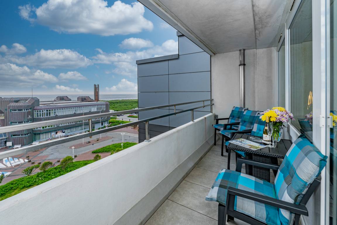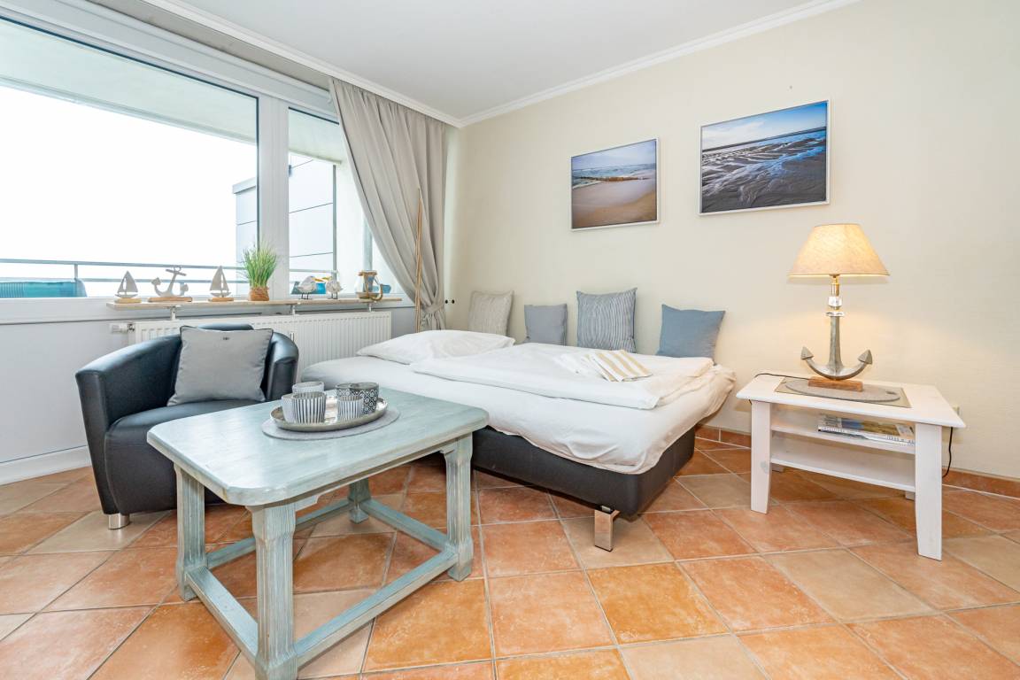 Gemütlich eingerichtete 2-Zimmer-Nichtraucher-Ferienwohnung, ca. 59 qm, in der 5. Etage zur Seeseite mit eingeschränktem Meerblick und Westloggia (Abendsonne mit Balkonmöbel und Auflagen) für 4 Personen.